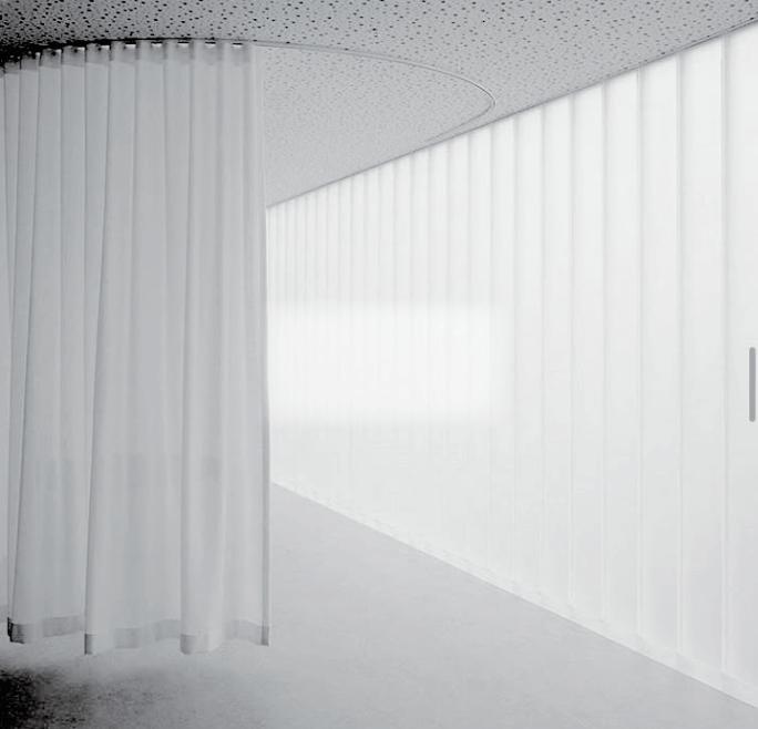 領域とカーテンによるグラデーション状 の境界の変化により、宿泊者の心情の変 化に寄り添う場が生まれます。