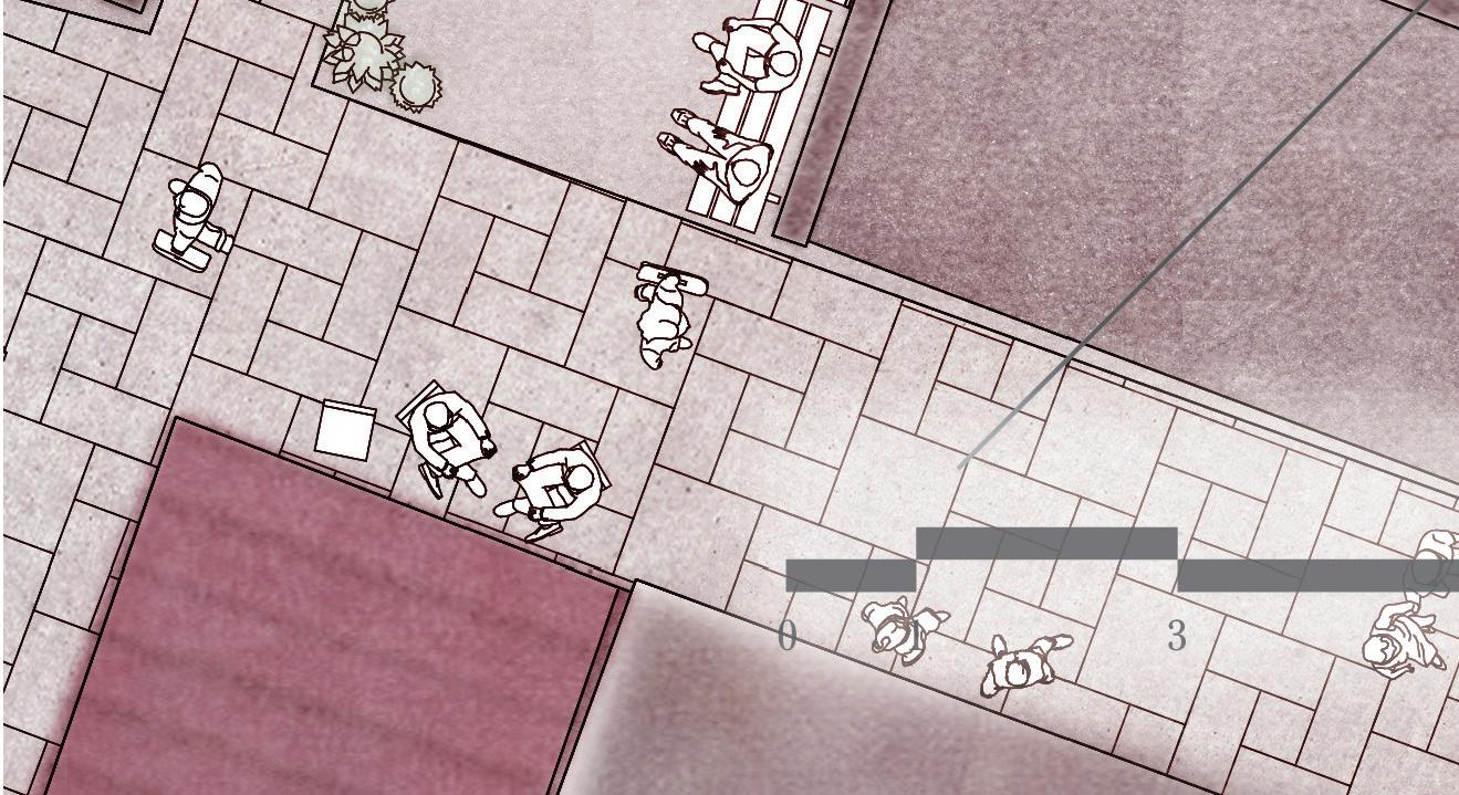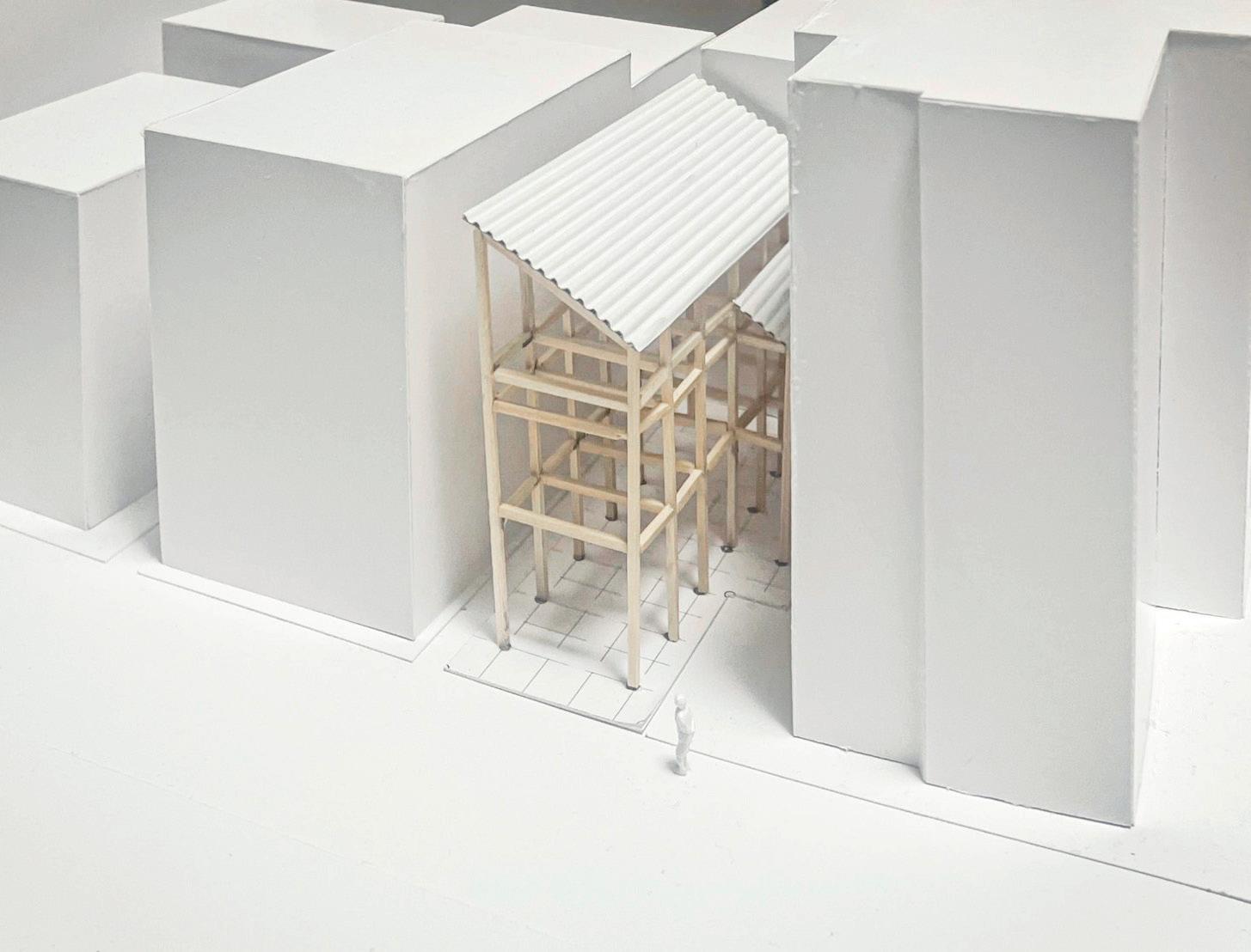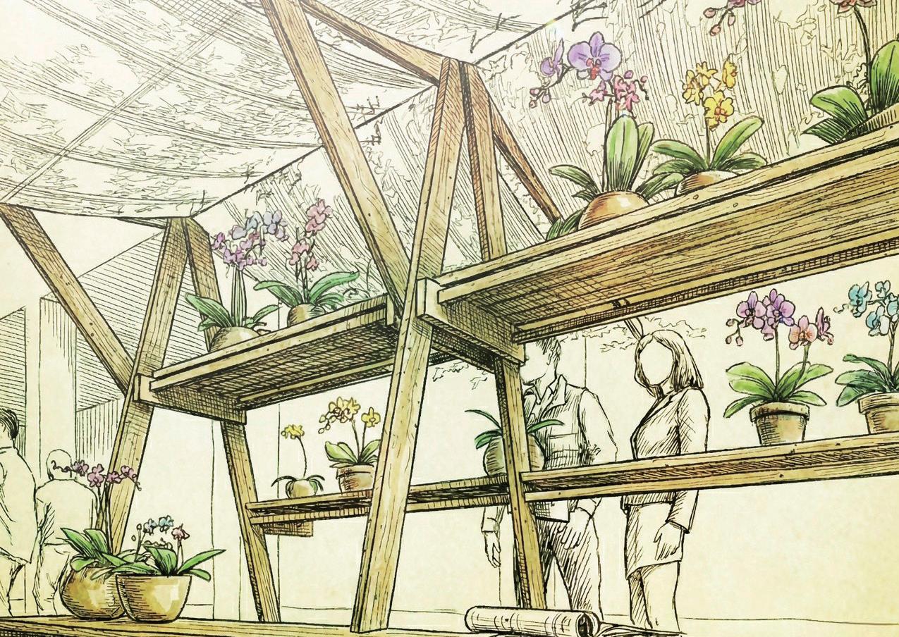 このことを踏まえて、木漏れ日に包まれる、身体ス ケールに寄り添った花と緑の屋台を提案します。