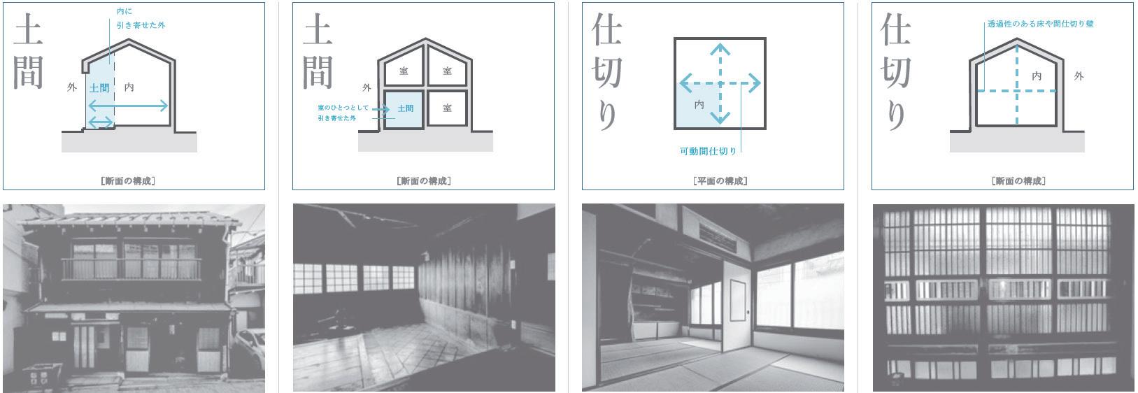 右:伝統的境界の7 つの建築要素 (縁側、土間、仕切り、床 壁と窓、屋根・天井、坪庭)