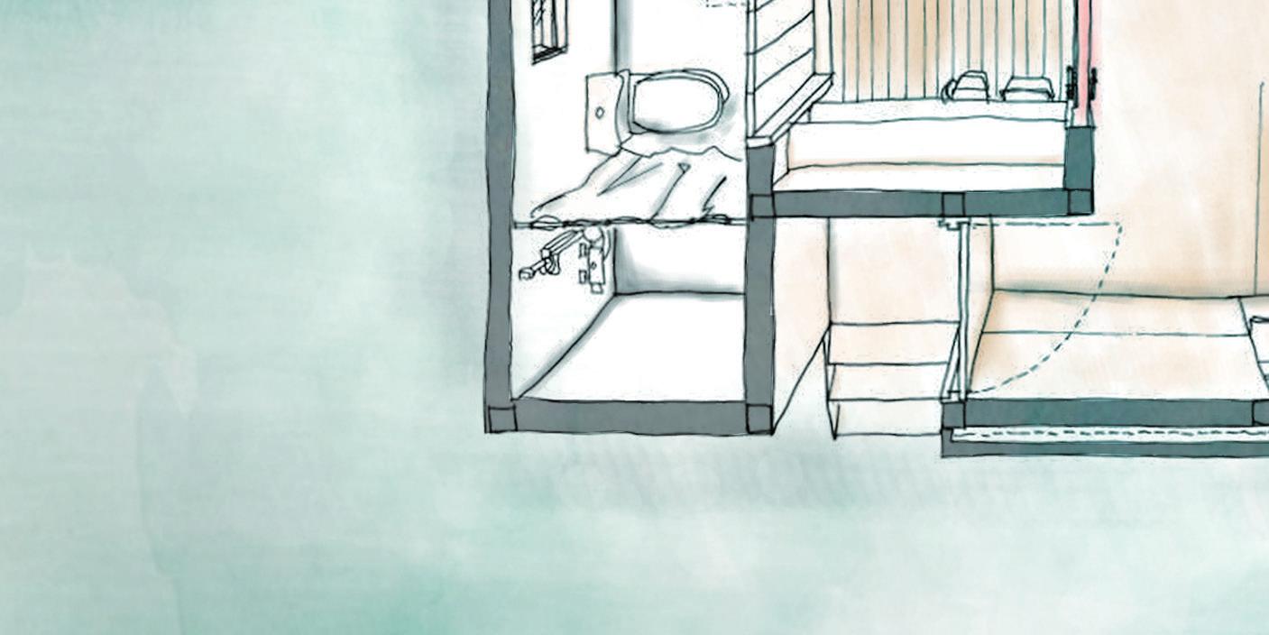 豊かな客室とは、空間構成や滞在者の操作の容易さで毎回新しい気付きが得られ る空間であると考えます。したがって既存構成を活かした誰でも使いこなせる空 間にするために、既存のロフト部分の一部を抜くことによる上へ伸びる空間や、 レースカーテンを設けました。それによって、滞在者の心情の変化により可変性 を持つ空間が生まれる。