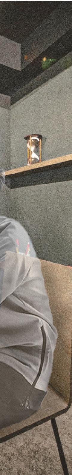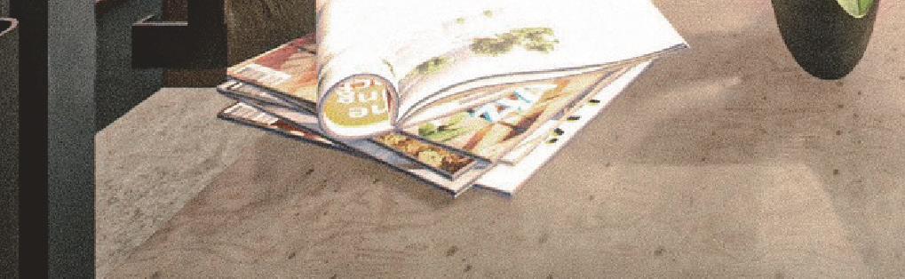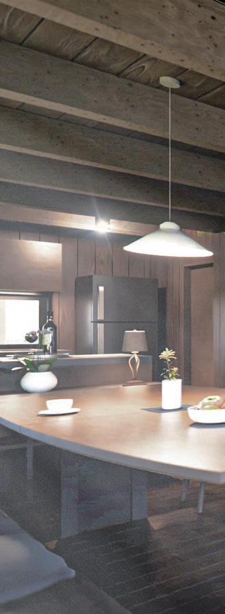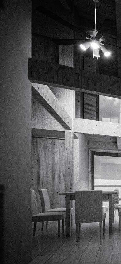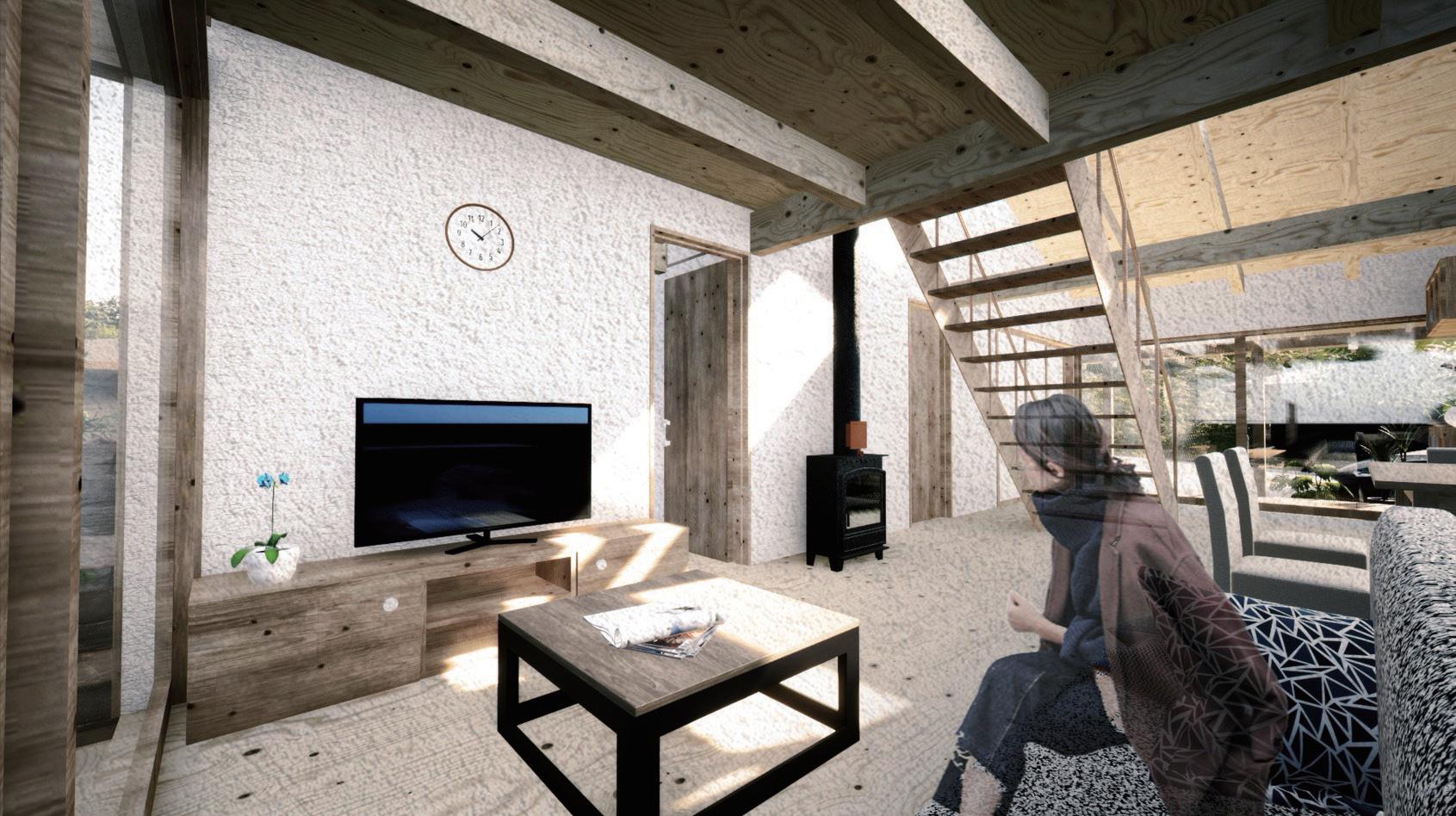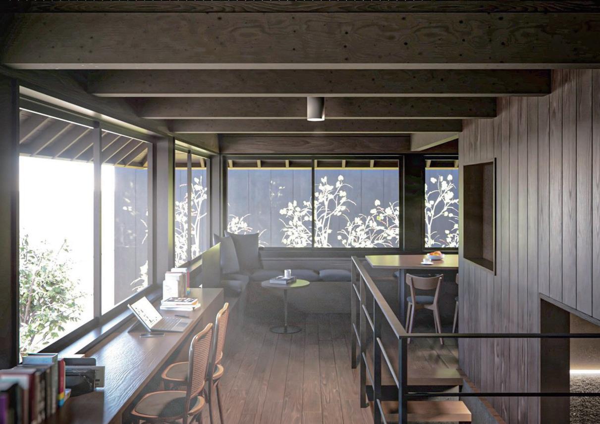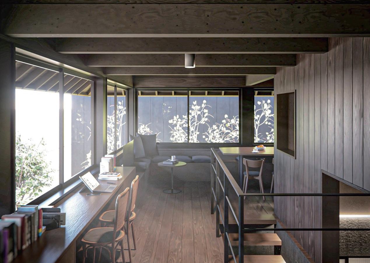 左ページ:こもりの場で宿泊者が作業 している様子。こもって自分自身と向 き合いながらも外界を遮断しない部屋。 右ページ:くつろぎの場を見る。梁で 領域を生み出しながら一体的な空間構 成を感じられる。