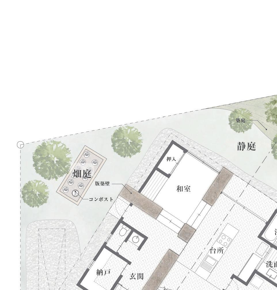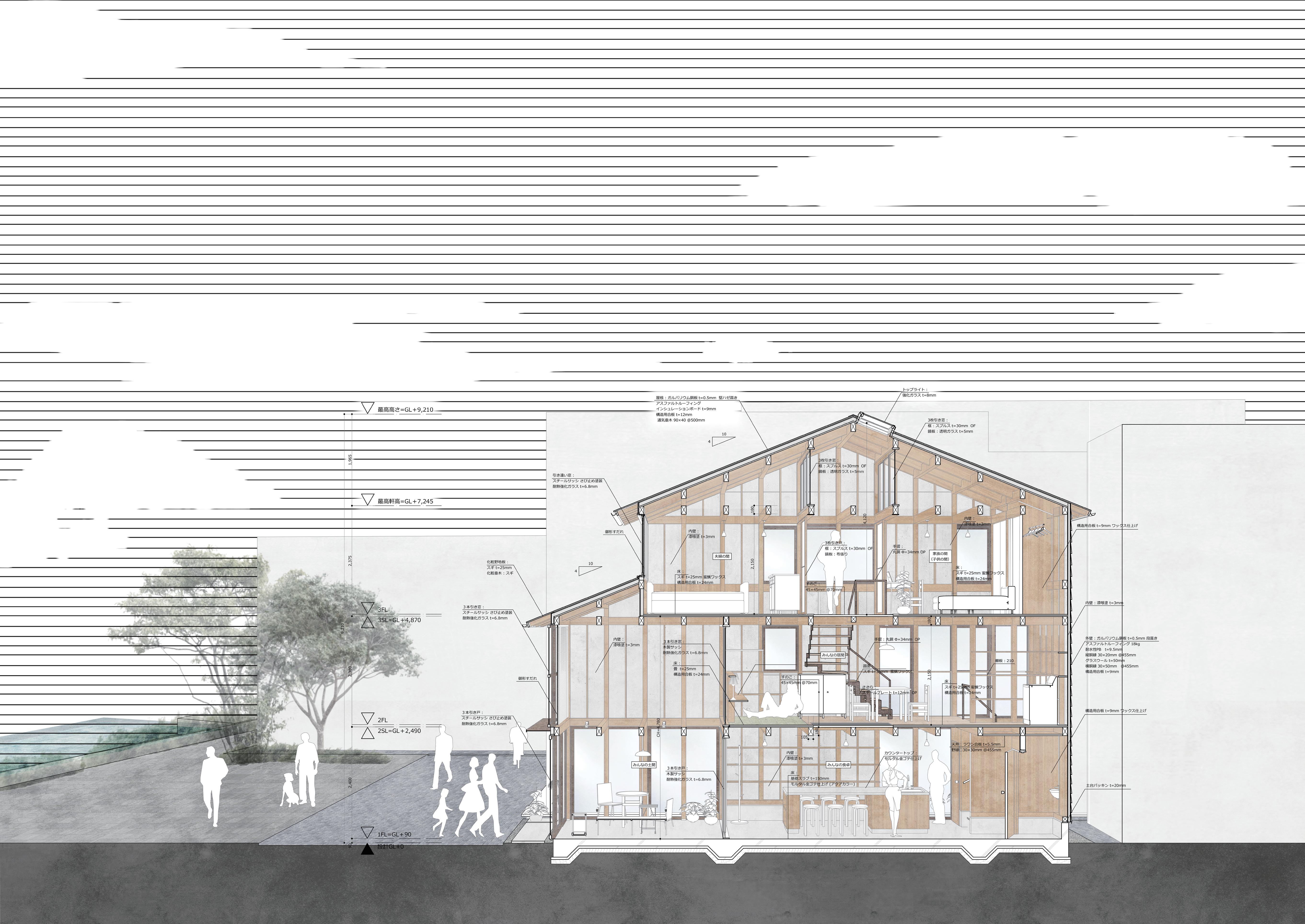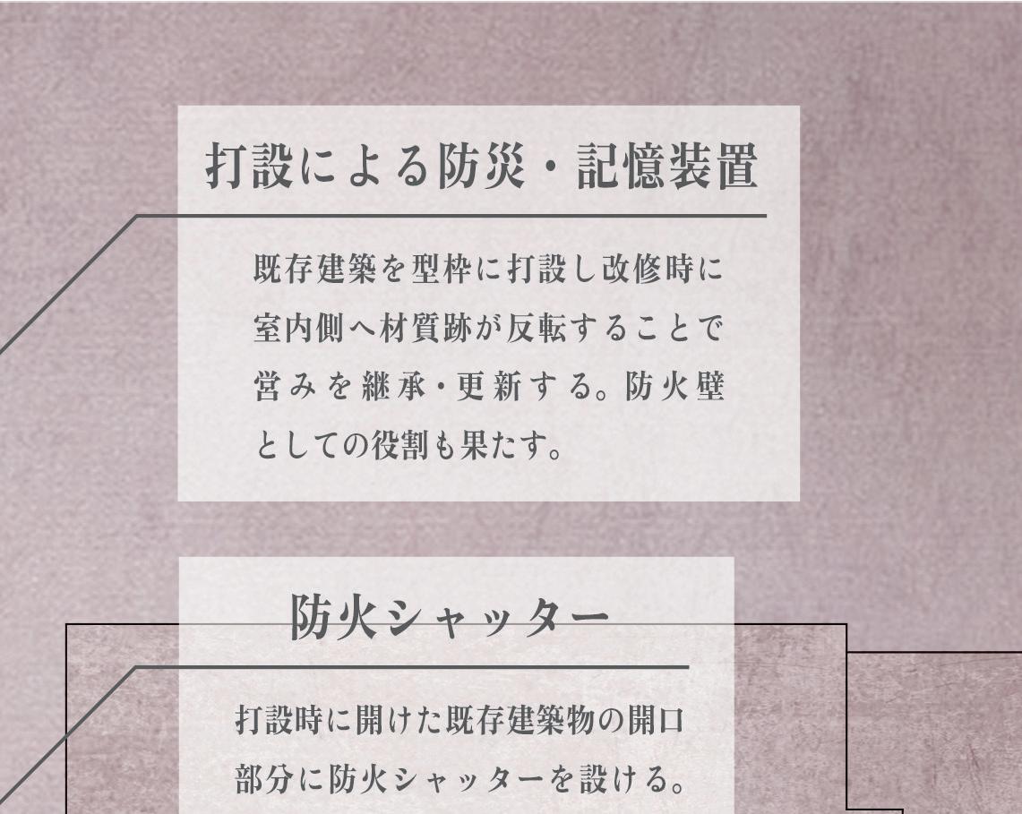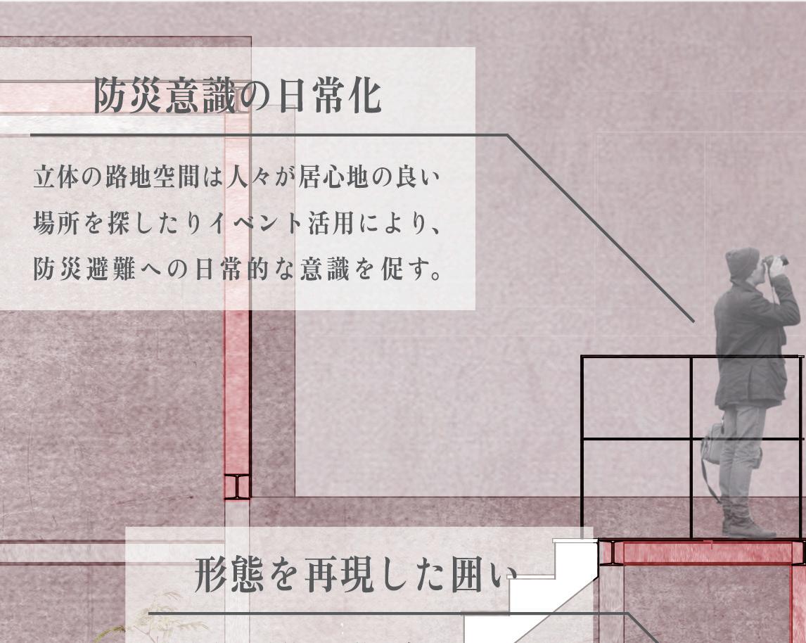 昨今の情報社会ではSNS での過剰な人の距離感を持 つ一方で現実での繋がりは増々希薄化し、両者の繋 がり方には大きな差が生じています。そのため空間 というヒト・モノ・コトの基盤の境界性を整えるこ とが必要であると考えます。