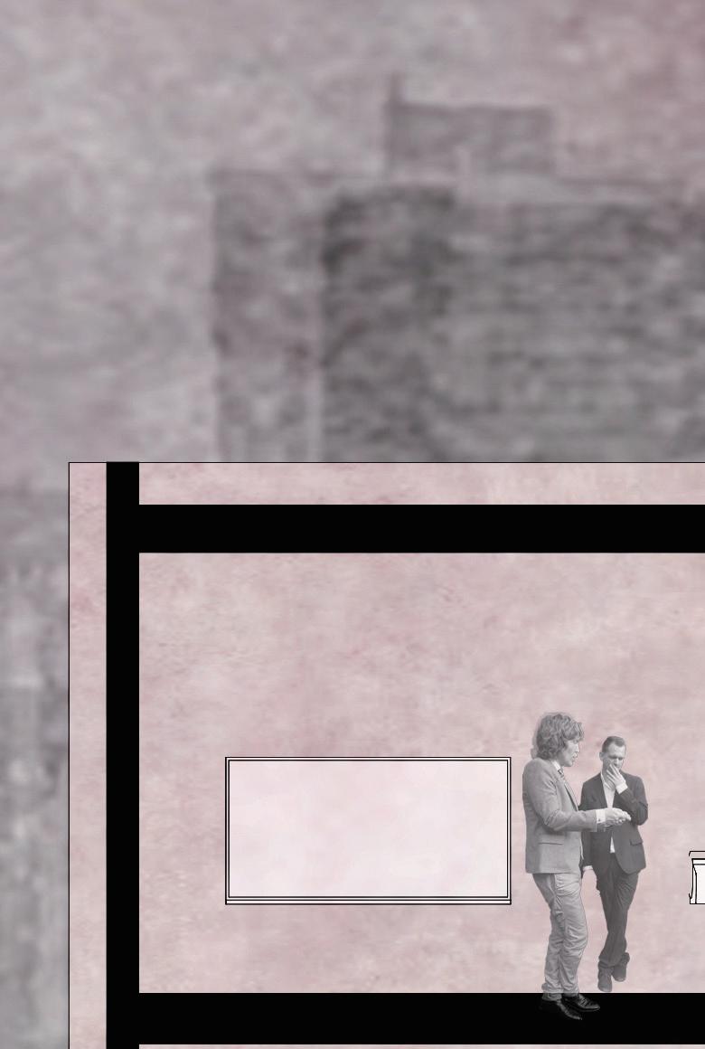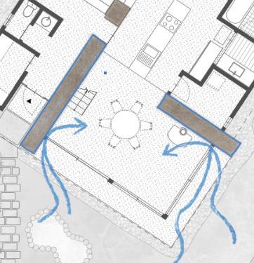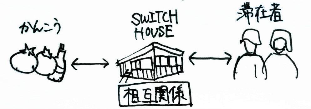 本提案では、時間帯や使い方に合わせて黒板付きの 回転扉で部屋を変化させて、観光の思い出を回転扉 の黒板により人と人、過去と現在の時間軸を緩やか に繋ぐ。