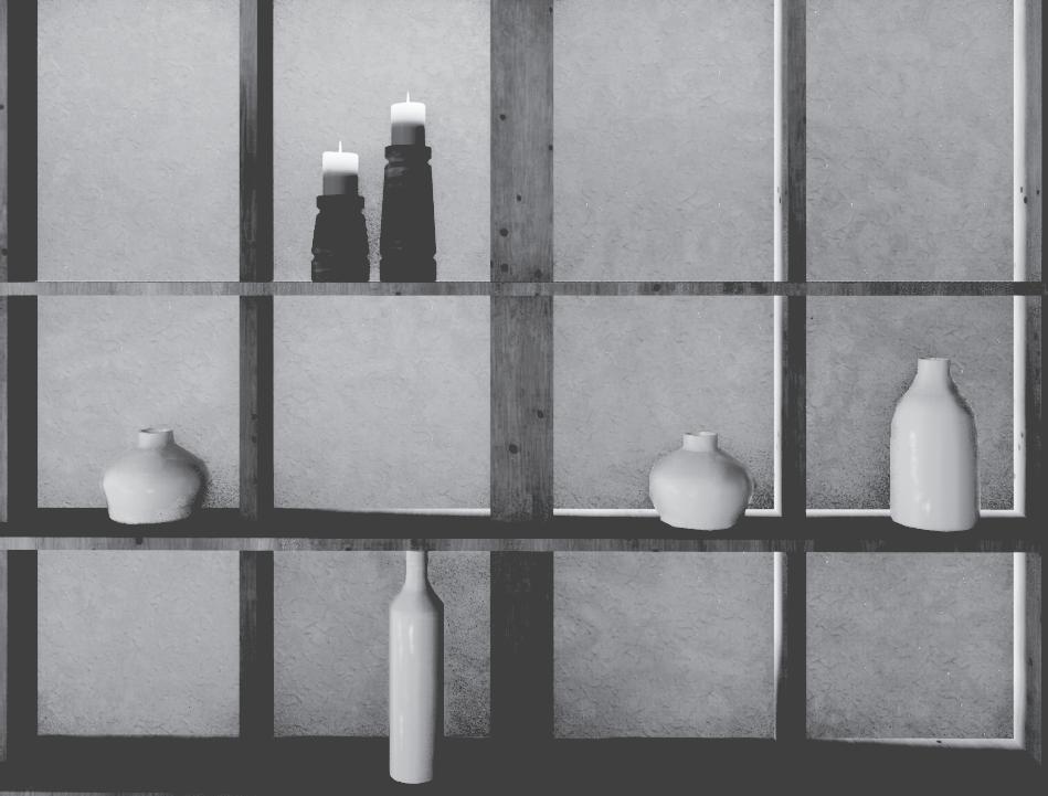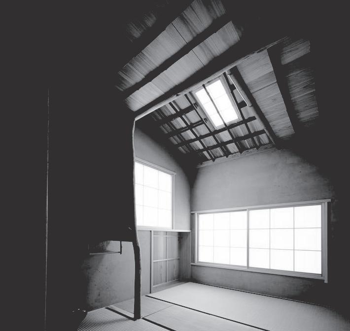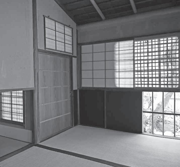 茶室の壁と窓に注目すると、一旦空間を包み込み、開口の背景となるのが壁であ り特定の場所を照らしたり、外の景色を垣間見せるのが、元来の窓の役割です。