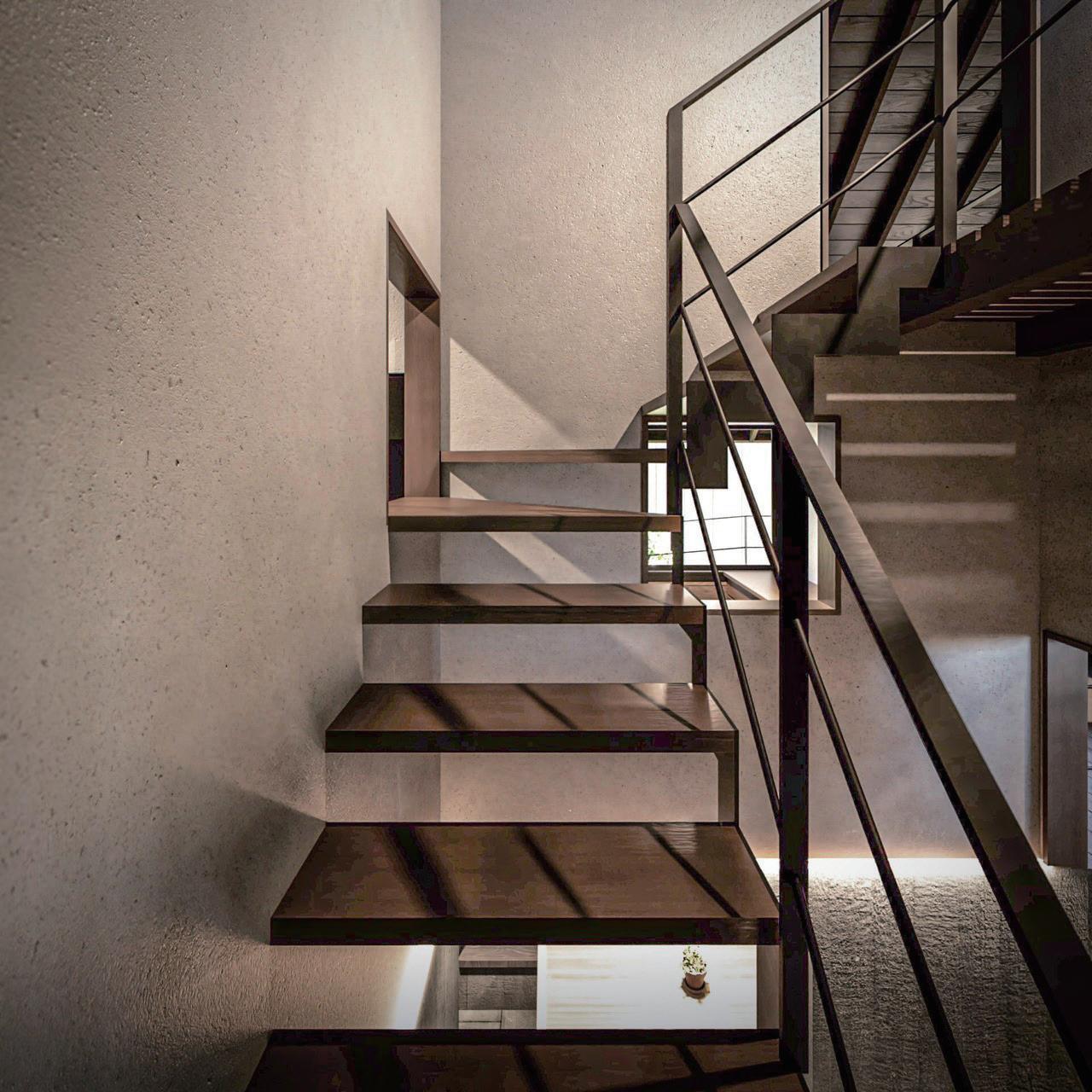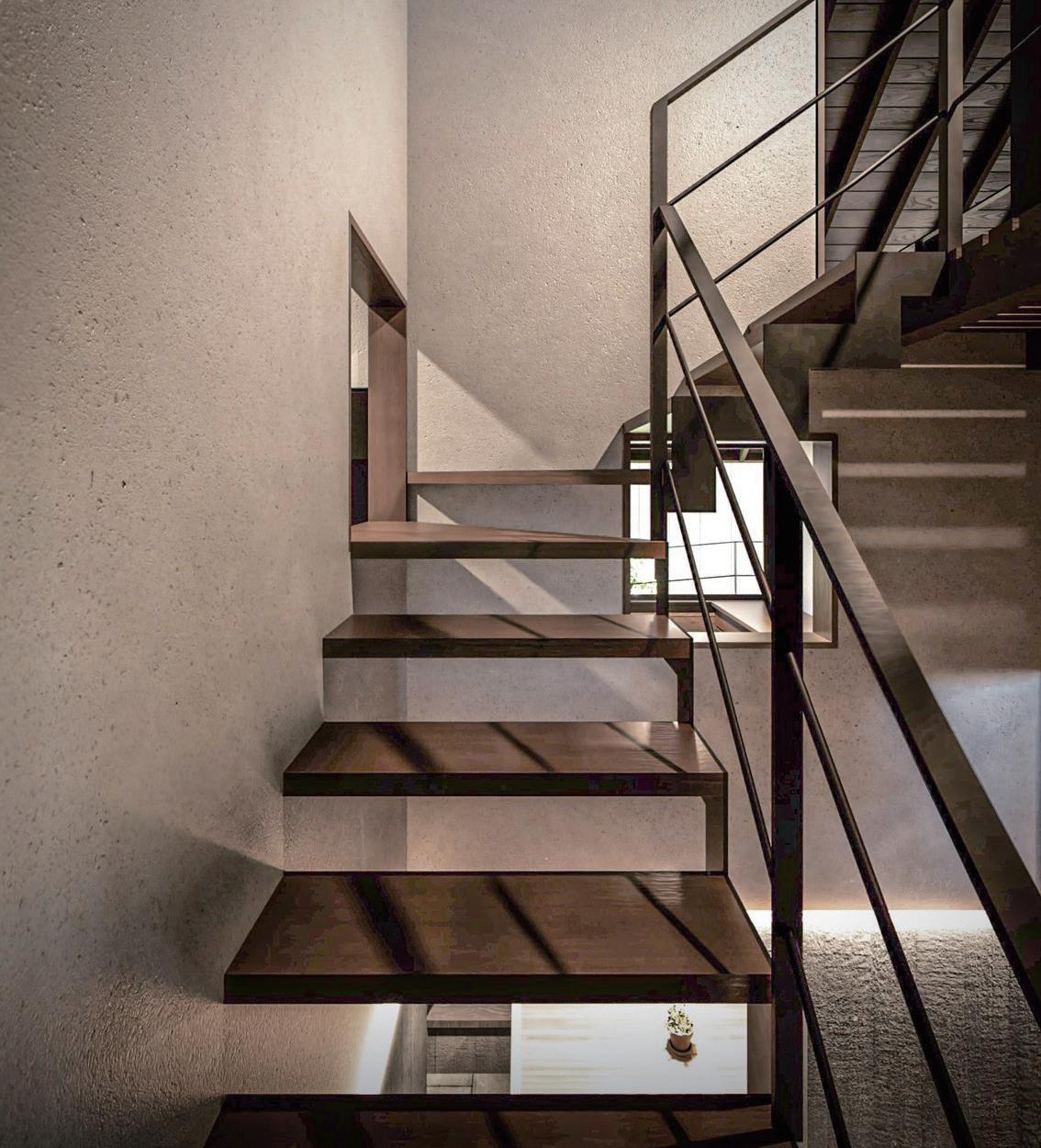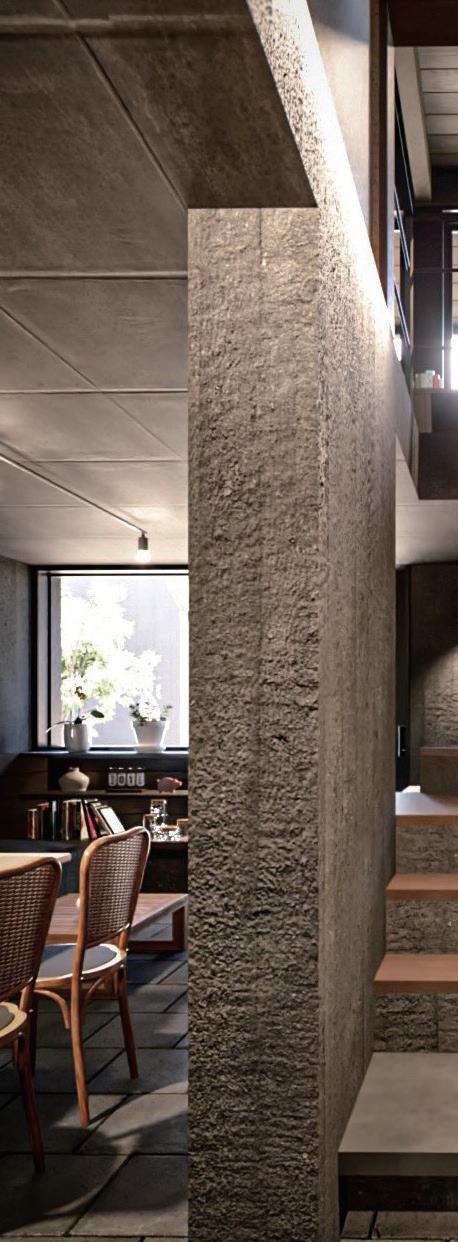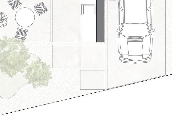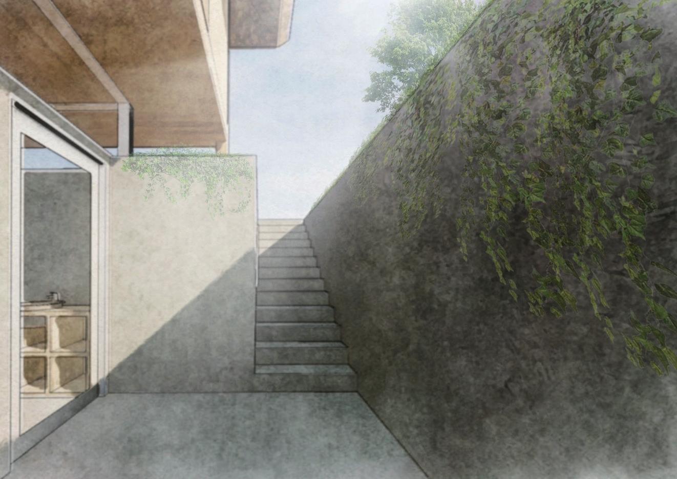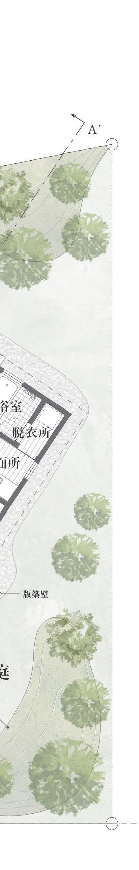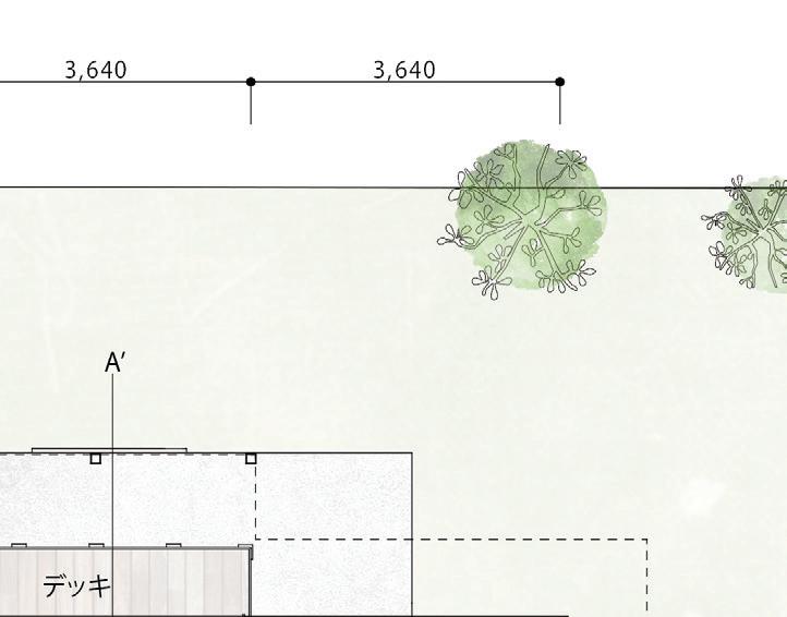 半地下に潜るアプローチは公私を緩 やかに分節する。
