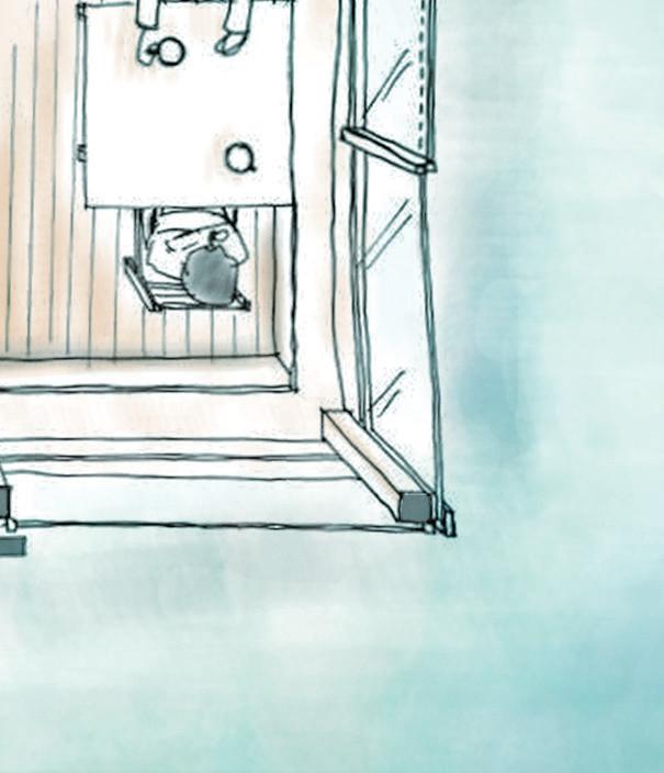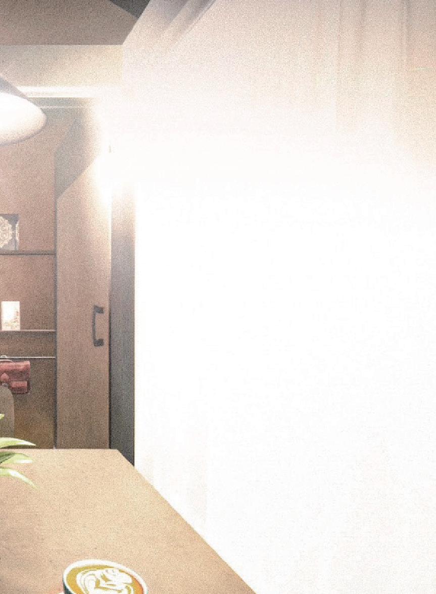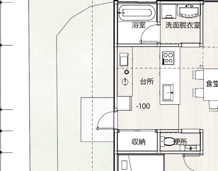 食事の場からつなぎの場を見る。カーテン の開閉が与える空間の可変性により滞在者 の心情に寄り添う。