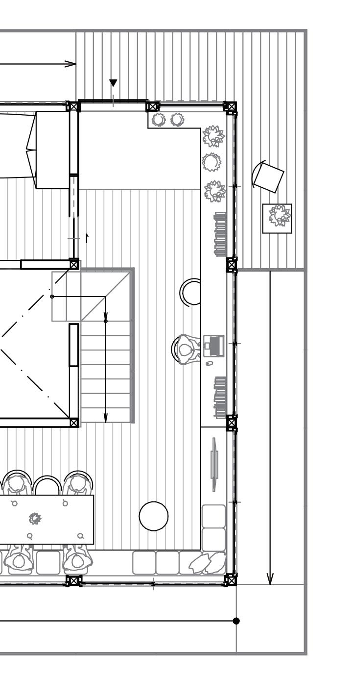 現代建築事例の境界の関係性はおおまかに6種類(内と外の境界、内と内の境界、 機能をもつ、窓辺を居場所にする境界、家具・造作と一体化した境界、多様なス クリーンによる境界)に分類しました。この章では45の住宅事例のトレース分析 を元にそれぞれの種類に分類分けと境界性の特徴、適応される伝統的境界の要素 をまとめています。