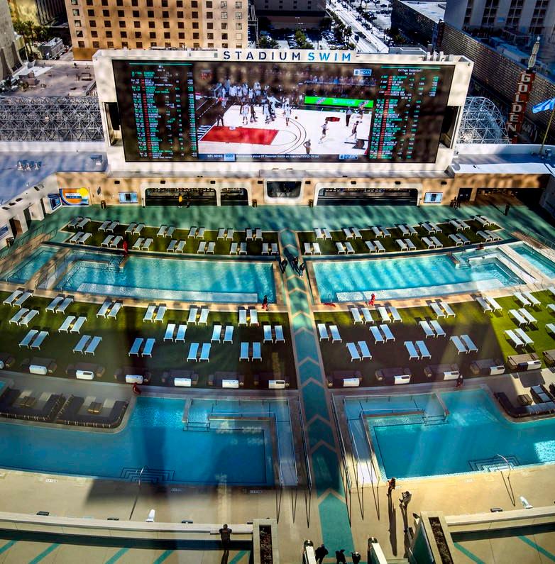 The ultimate sports lover pool party, complete with cabanas and 40-foot-tall screens.