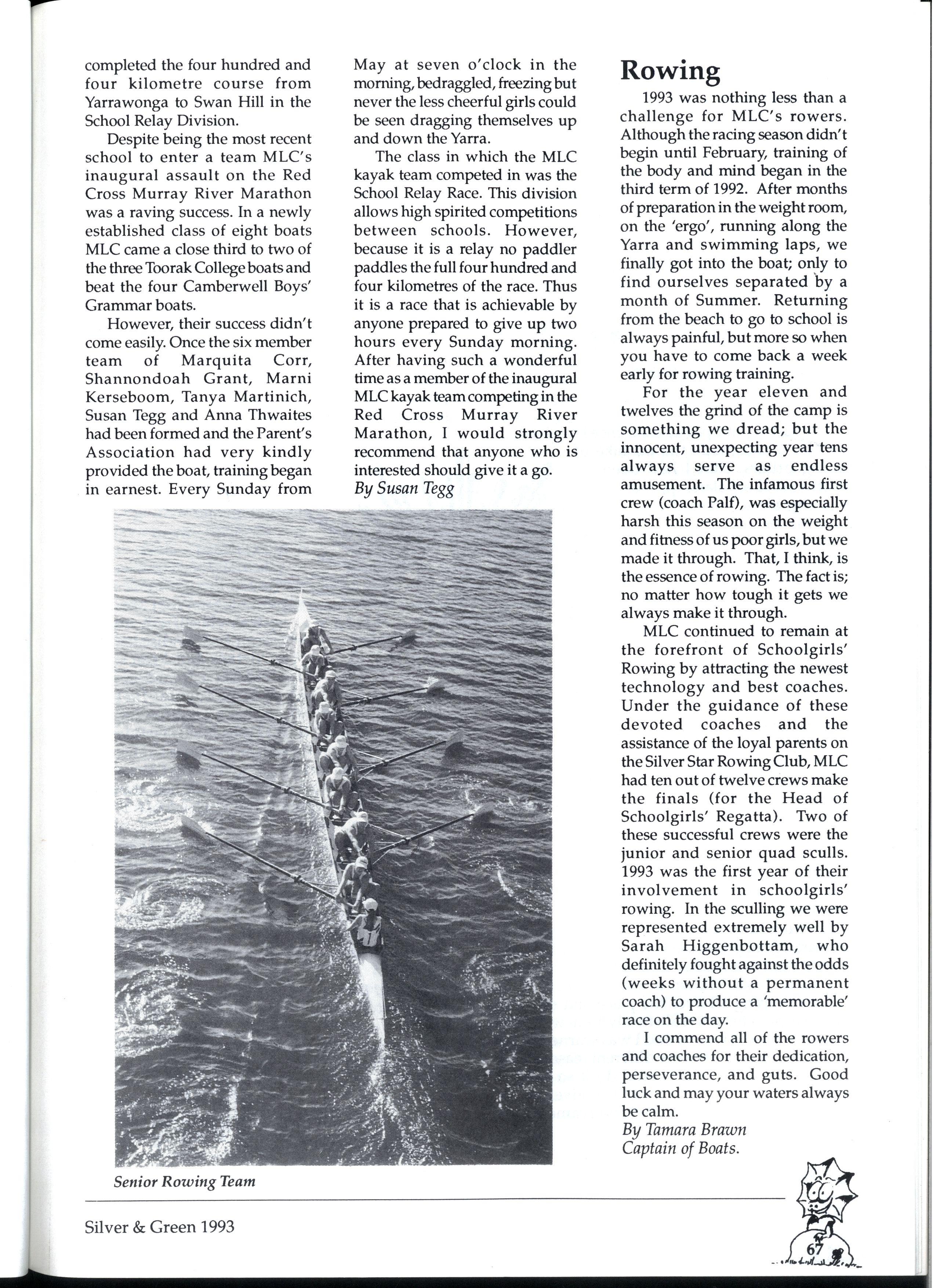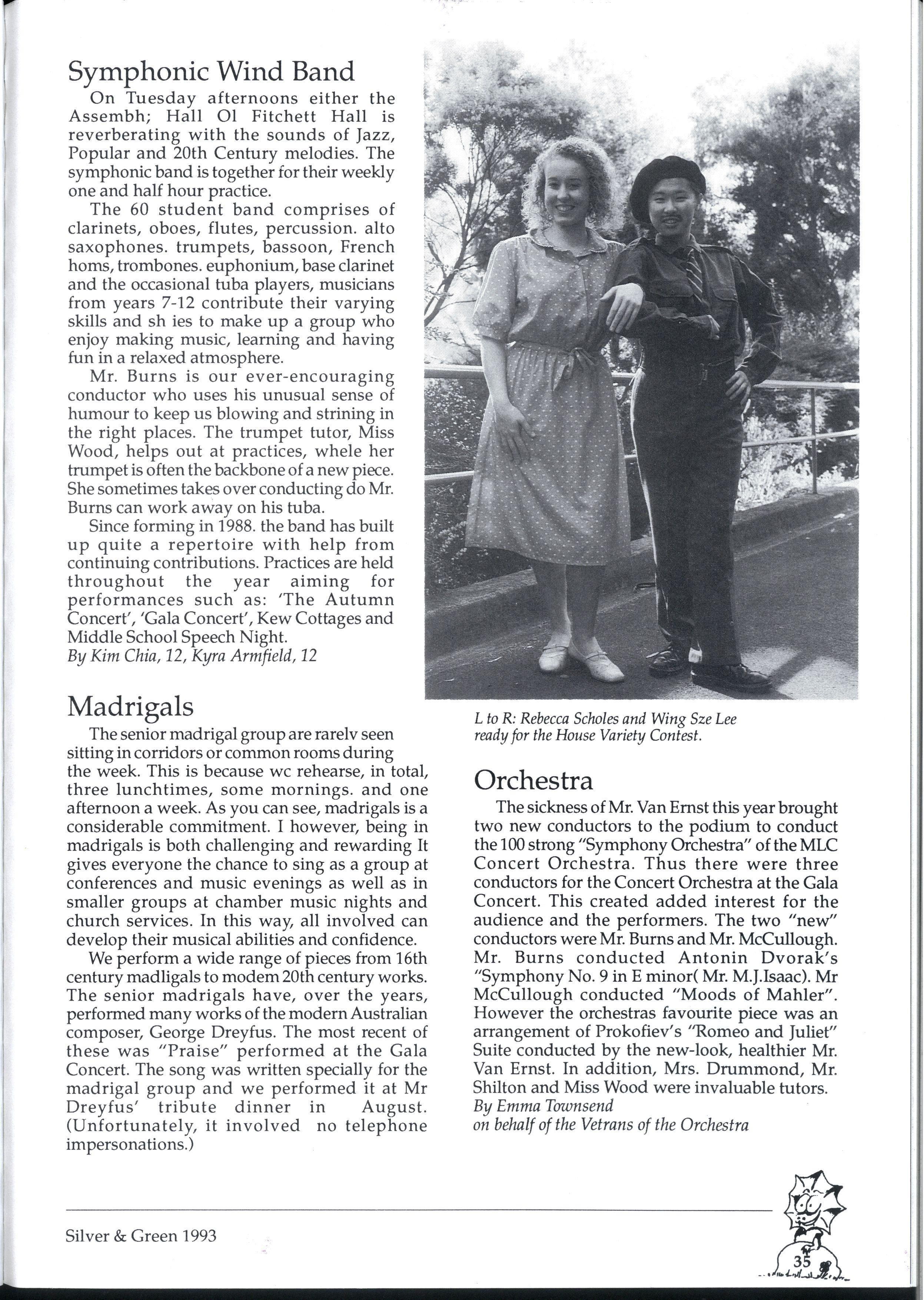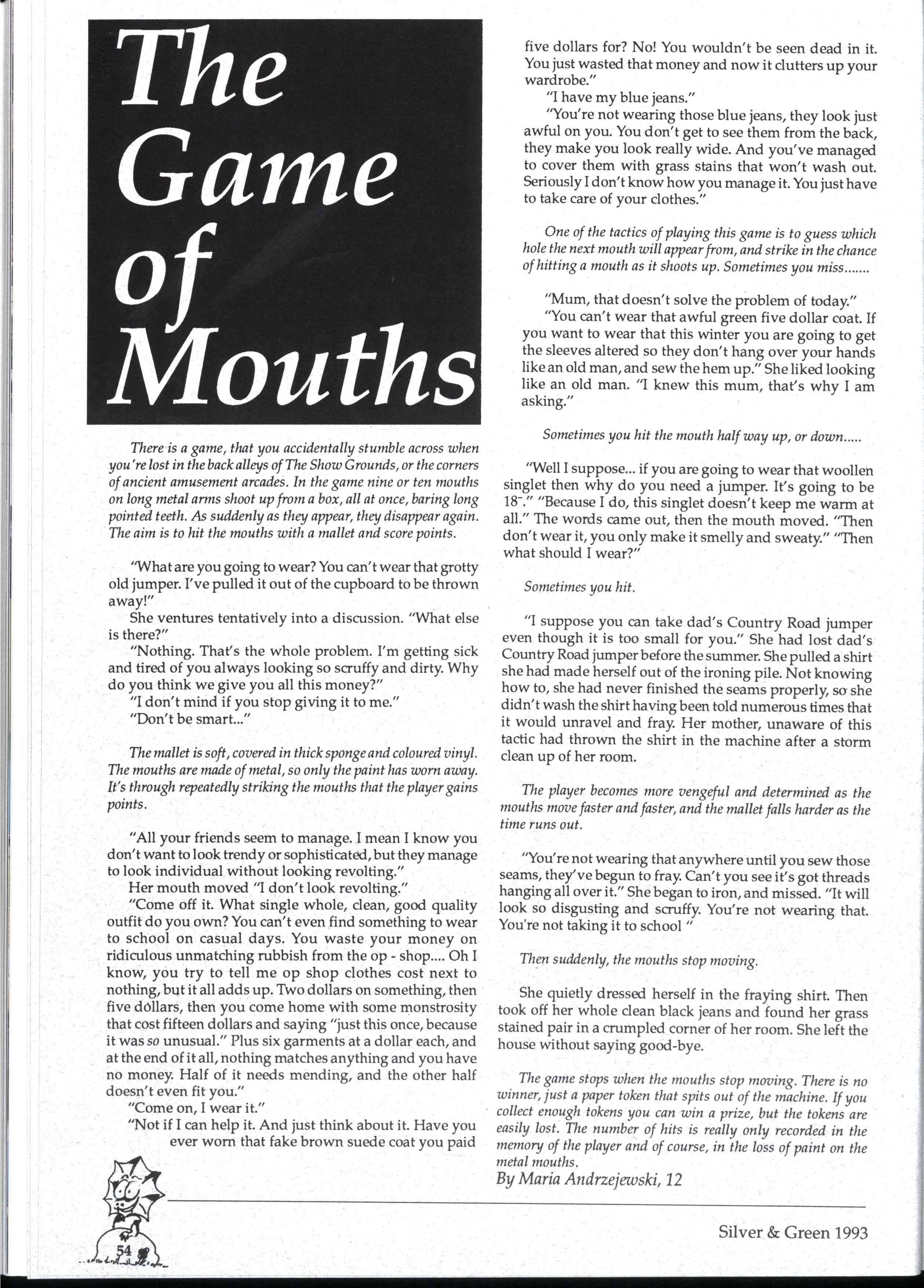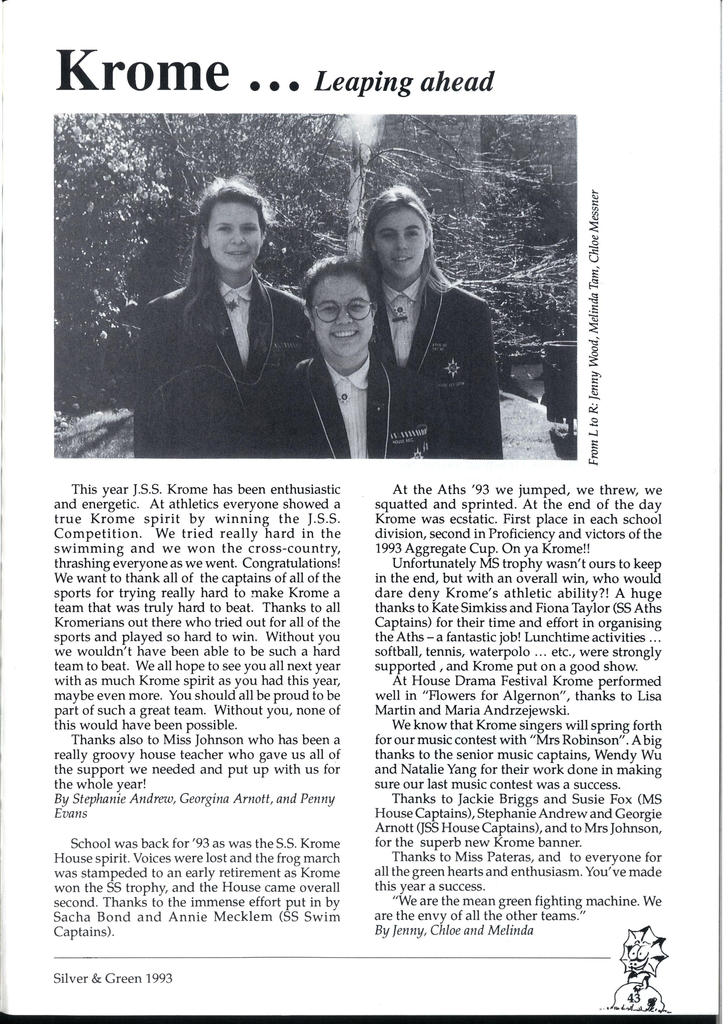 We have endeavoured to create a magazine so exciting that people will be magnetically drawn to it...so people are falling over themselves to write for us But reality 'it us and we can assure you it 'urt There are so many different activities going on at MLC that one often wonders how people could find the time to write for Silver and Green. However many did, and the articles have been of a fantastic standard Creativity is the theme for '93, and we've enjoyed our dip in the sea of creative stories that have flooded submission boxes. * * *