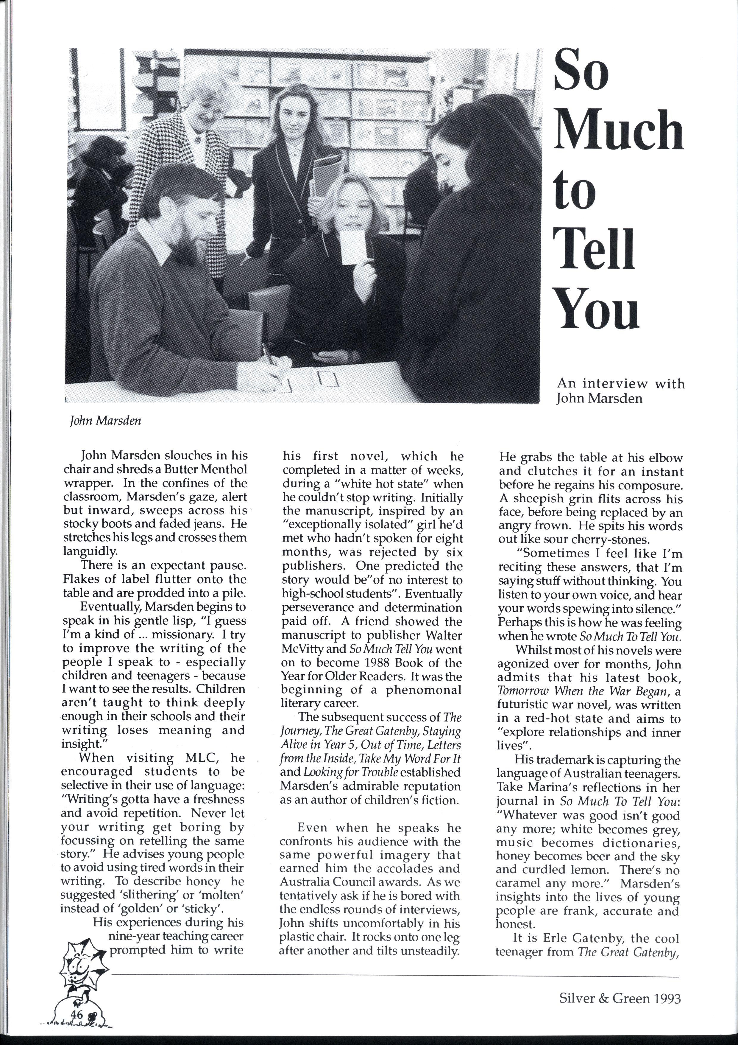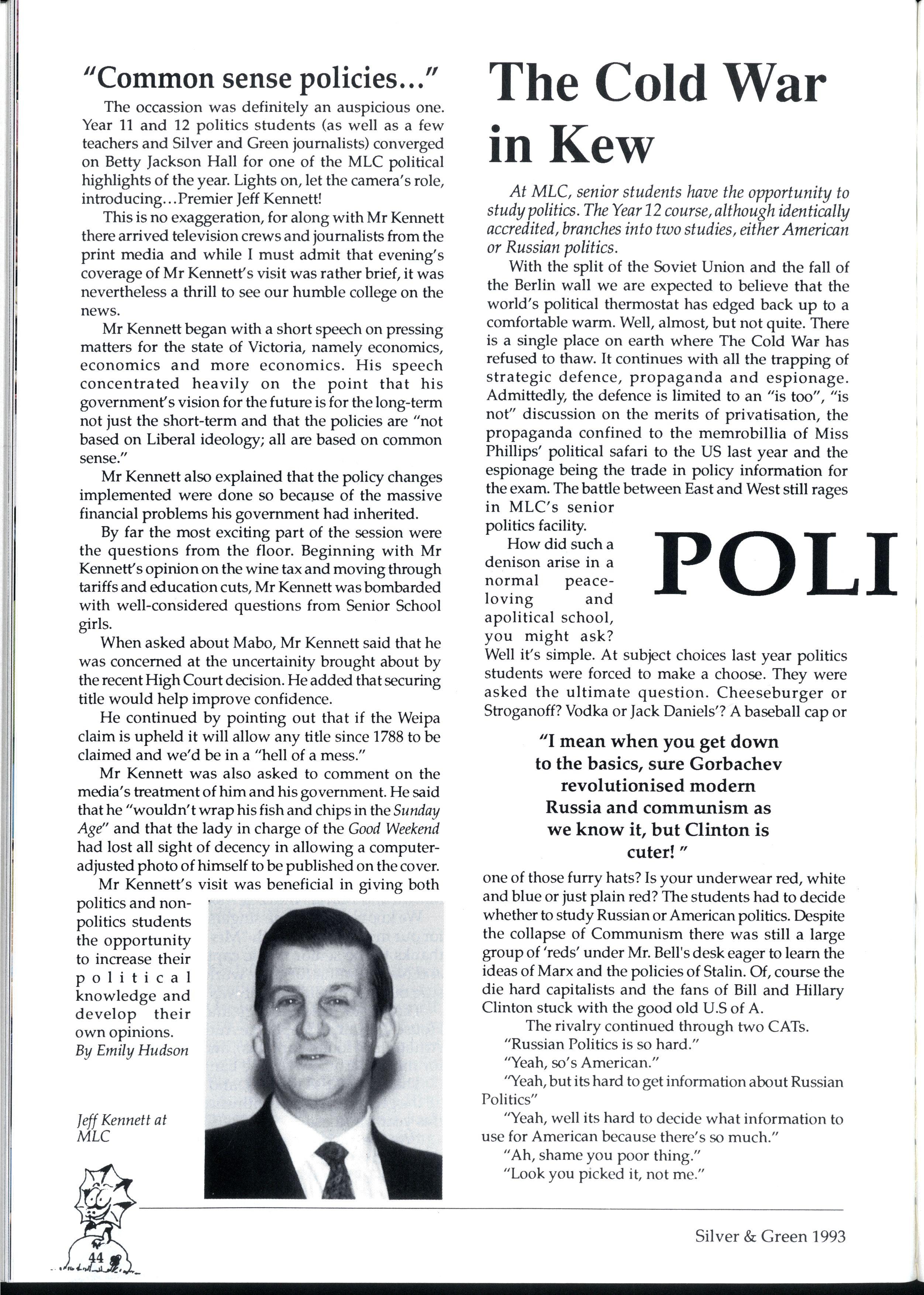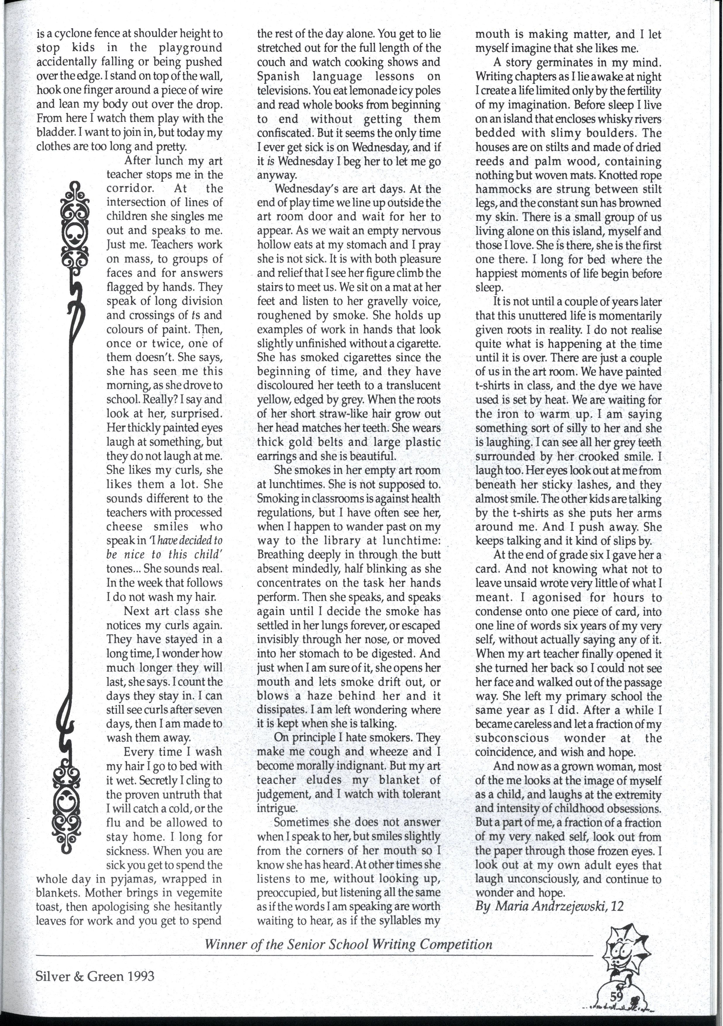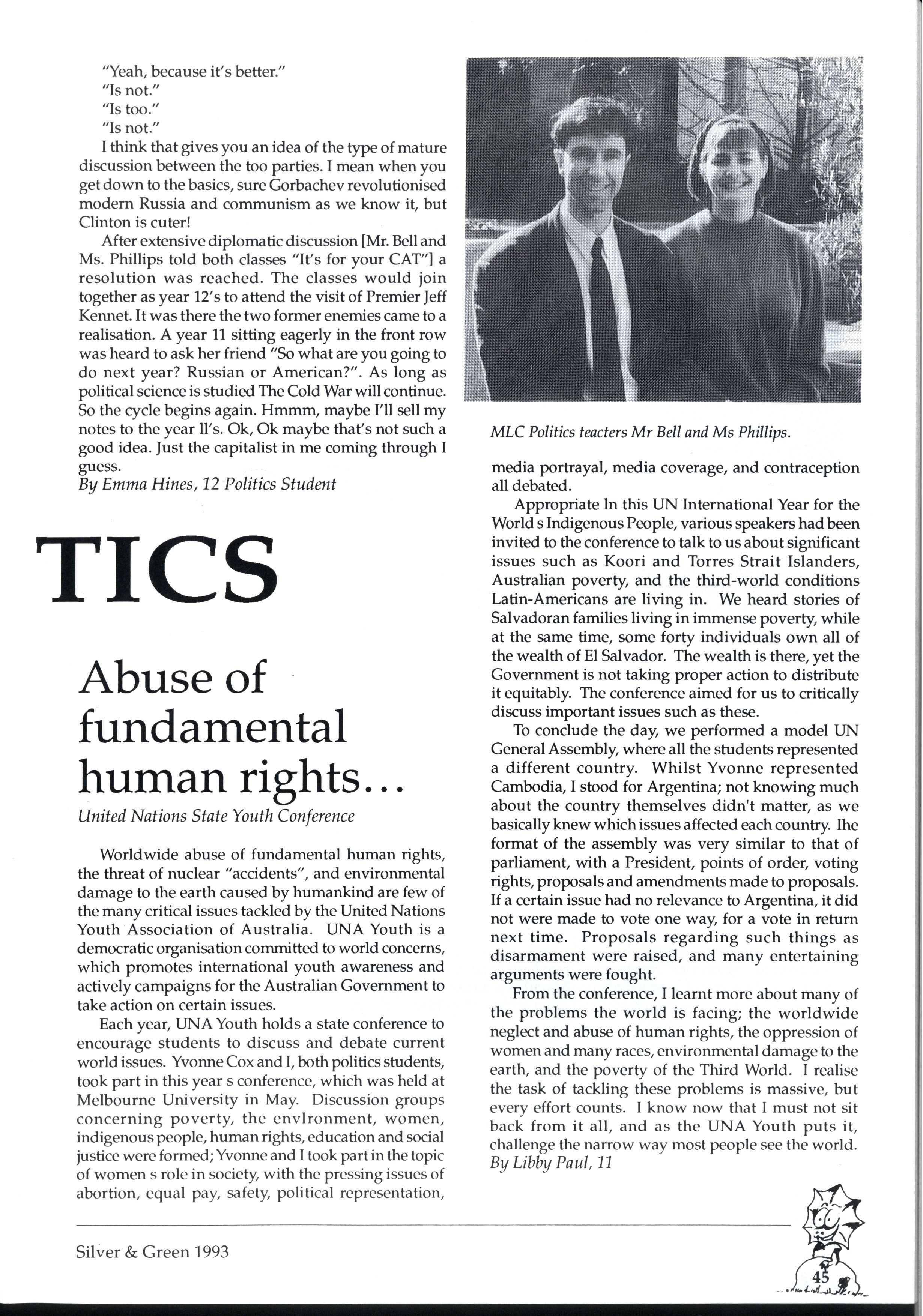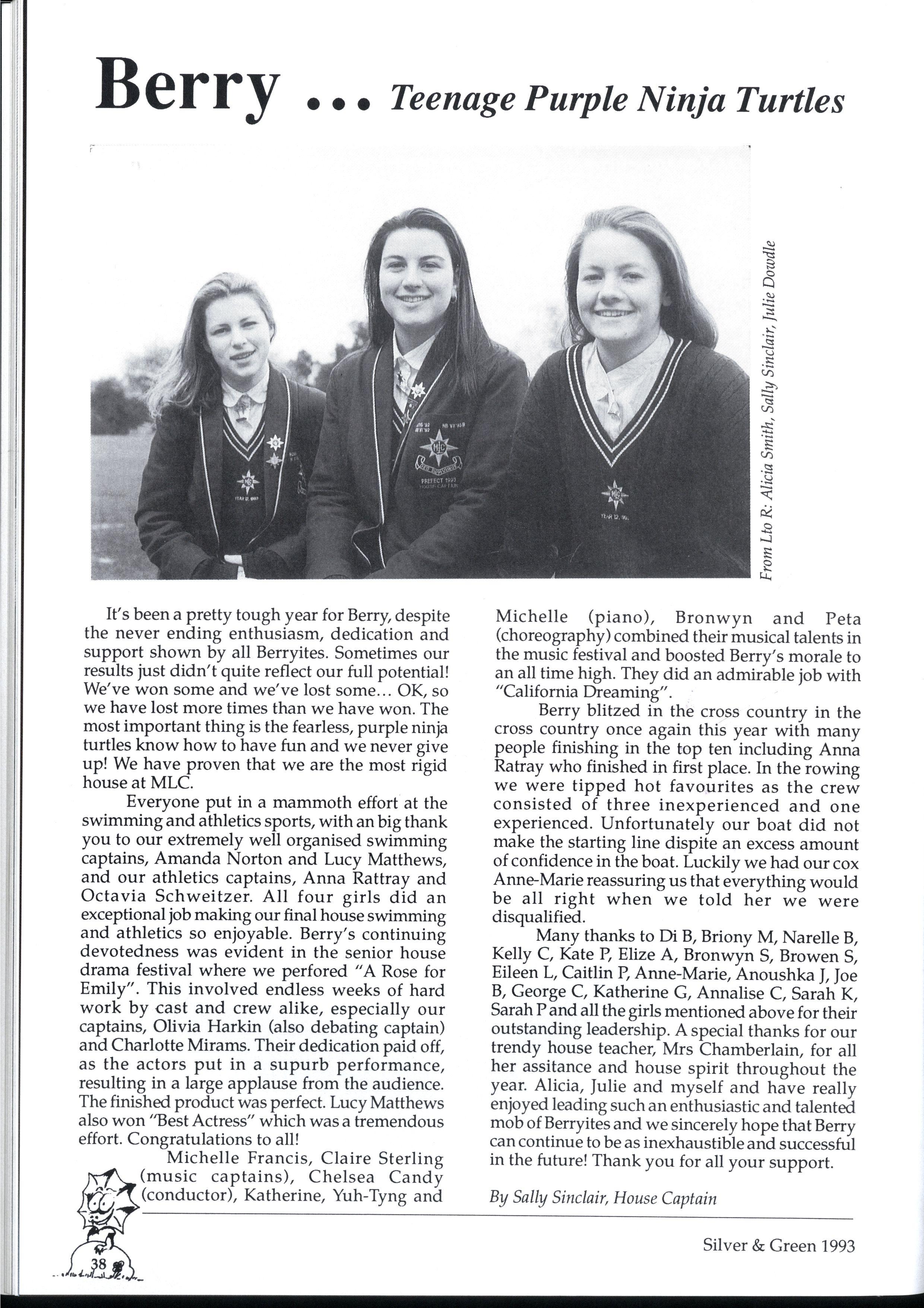 We have endeavoured to create a magazine so exciting that people will be magnetically drawn to it...so people are falling over themselves to write for us But reality 'it us and we can assure you it 'urt There are so many different activities going on at MLC that one often wonders how people could find the time to write for Silver and Green. However many did, and the articles have been of a fantastic standard Creativity is the theme for '93, and we've enjoyed our dip in the sea of creative stories that have flooded submission boxes. * * *