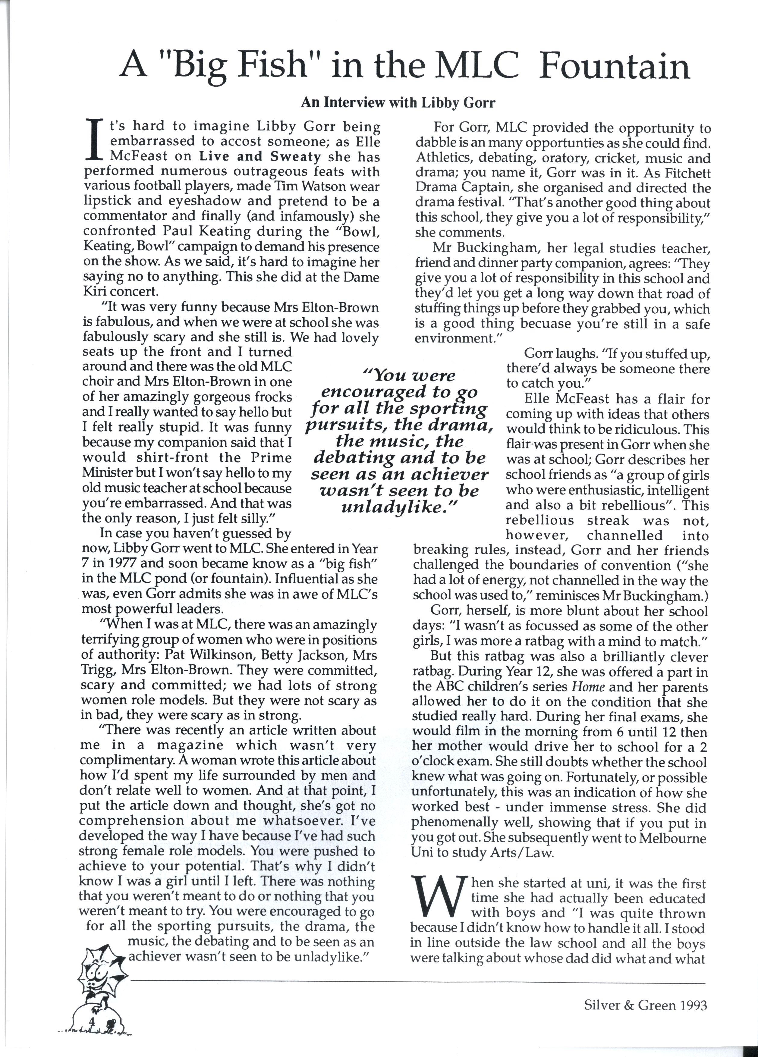 In case you haven't guessed by now, Libby Gorr went to MLC She entered in Year 7 in 1977 and soon became know as a "big fish" in the MLC pond (or fountain). Influential as she was, even Gorr admits she was in awe of MLC's most powerful leaders