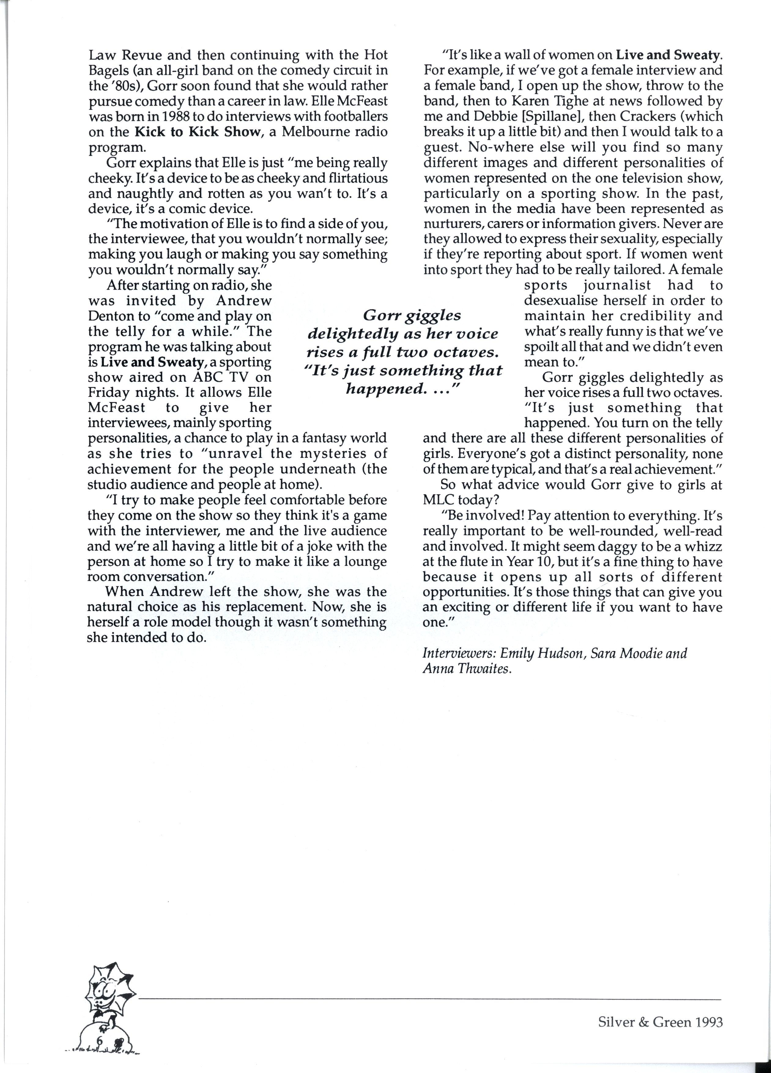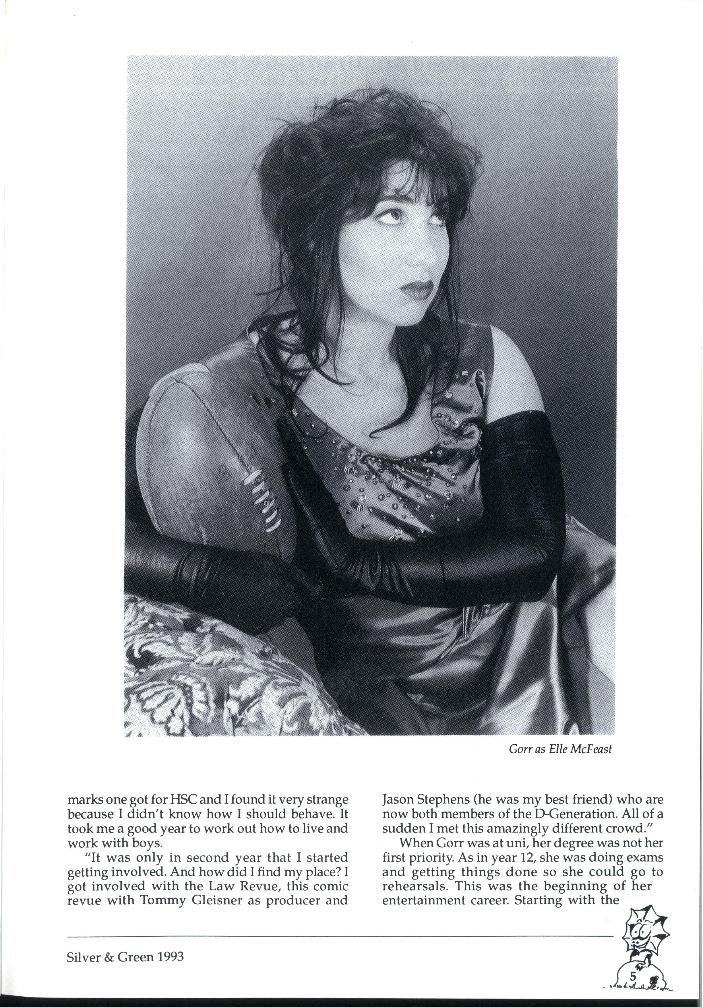 Law Revue and then continuing with the Hot Bagels (an all-girl band on the comedy circuit in the '80s), Gorr soon found that she would rather pursue comedy than a career in law Elle McFeast was born in 1988 to do interviews with footballers on the Kick to Kick Show, a Melbourne radio program