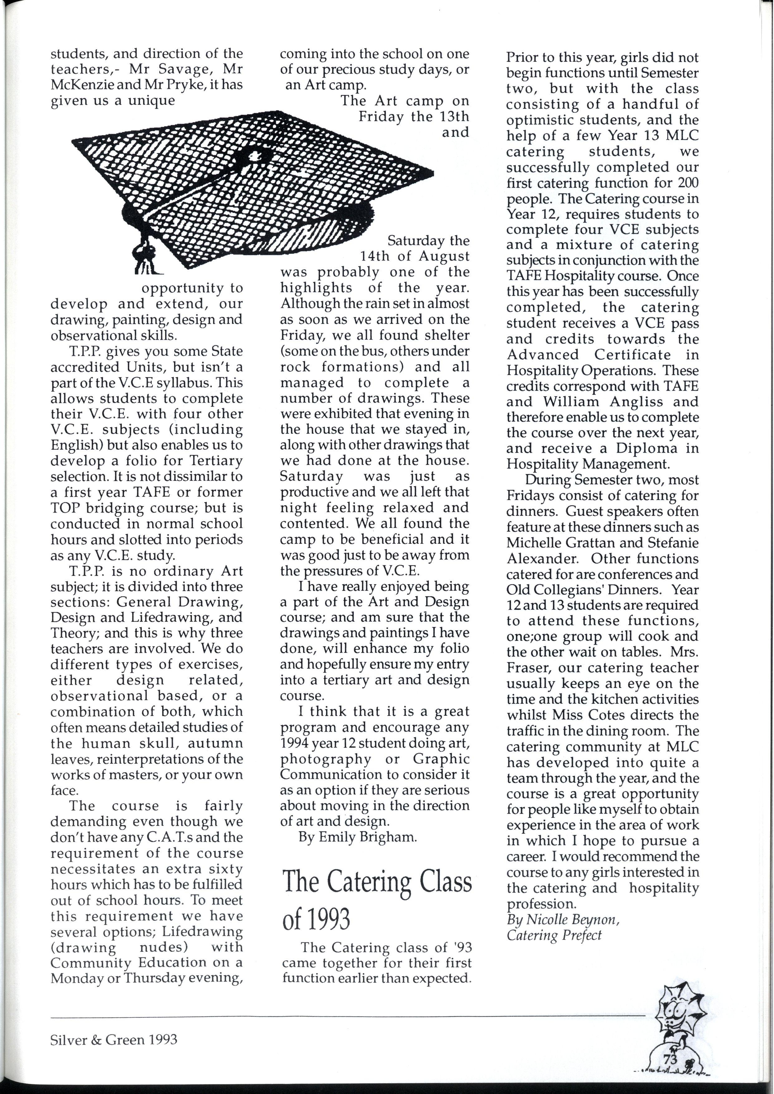During Semester two, most Fridays consist of catering for dinners Guest speakers often feature at these dinners such as Michelle Grattan and Stefanie Alexander. Othe r functions catered for are conferences and Old Collegians' Dinners Year 12 and 13 students are required to atten d thes e functions , one;one group will cook and the other wait on tables Mrs Fraser, ou r catering teacher usually keeps an eye on the time and the kitchen activities whilst Miss Cotes directs the traffic in the dining room The catering communit y at MLC has develope d into quite a team through the year, an d the course is a great opportunity for people like myself to obtain experience in the area of work in which I hop e to pursu e a career I would recommend the course to any girls interested in the catering an d hospitality profession