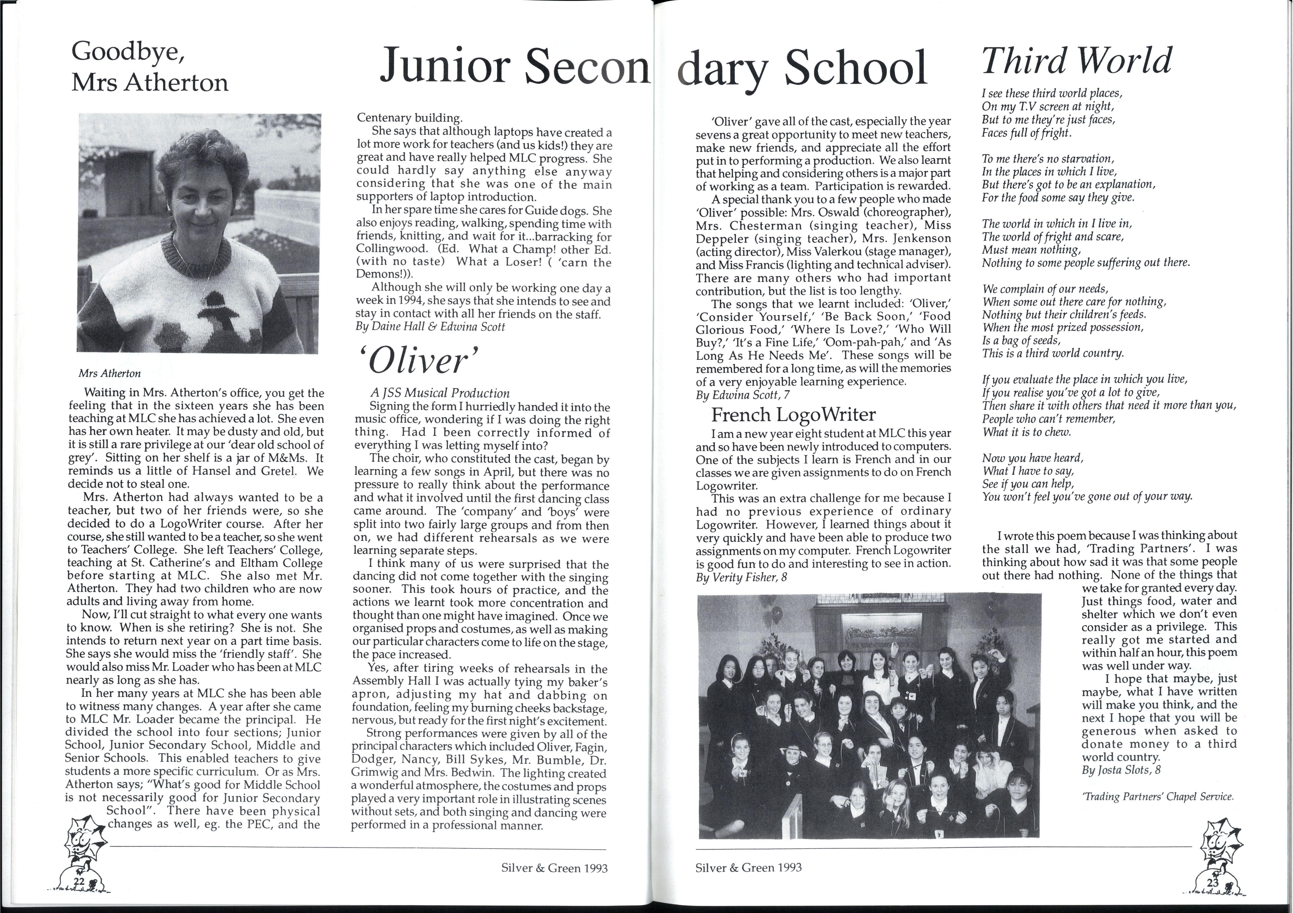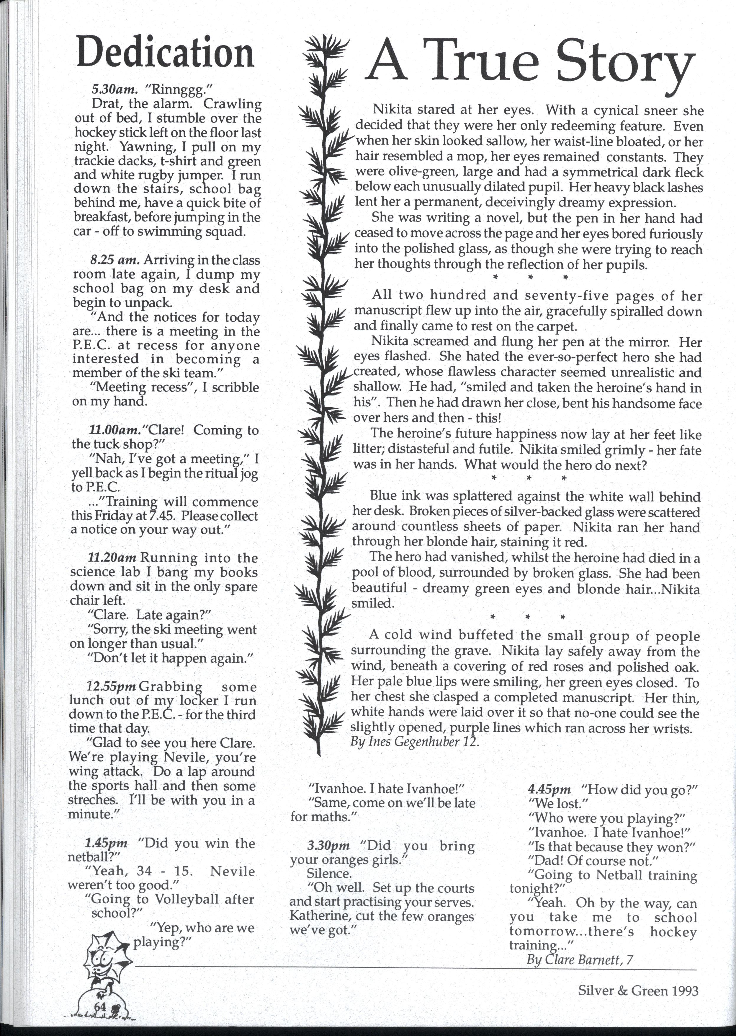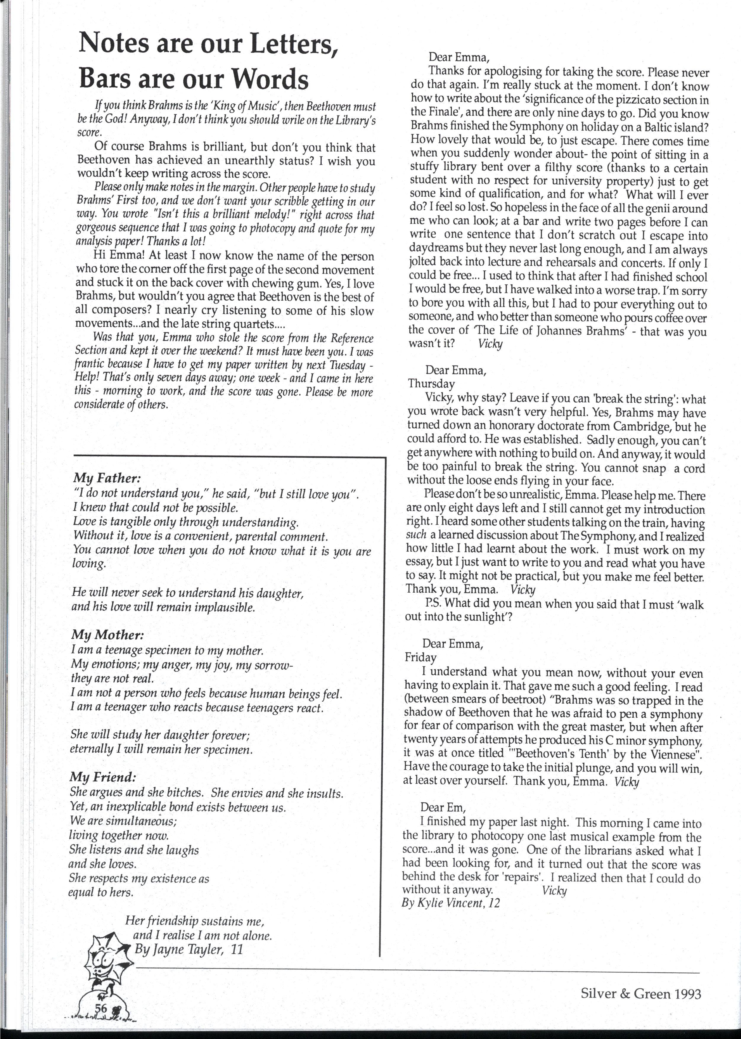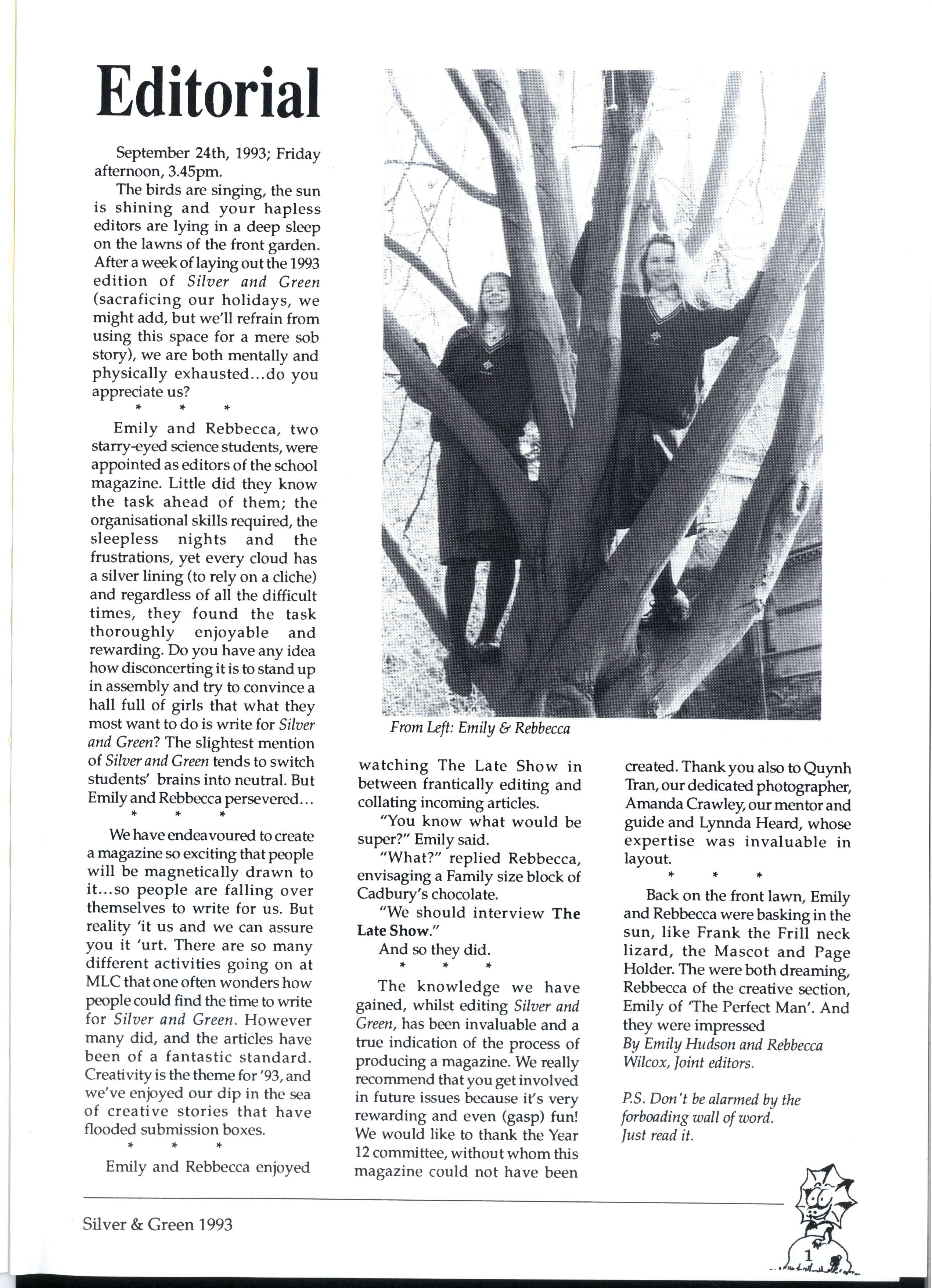 Emily and Rebbecca, two starry-eyed science students, were appointed as editors of the school magazine Little did they know the task ahead of them; the organisational skills required, the sleepless nights and the frustrations, yet every cloud has a silver lining (to rely on a cliche) and regardless of all the difficult times, they found the task thoroughly enjoyable and rewarding. Do you have any idea how disconcerting it is to stand up in assembly and try to convince a hall full of girls that what they most want to do is write for Silver and Green? The slightest mention of Silver and Green tends to switch students' brains into neutral But Emily and Rebbecca persevered.. * * *