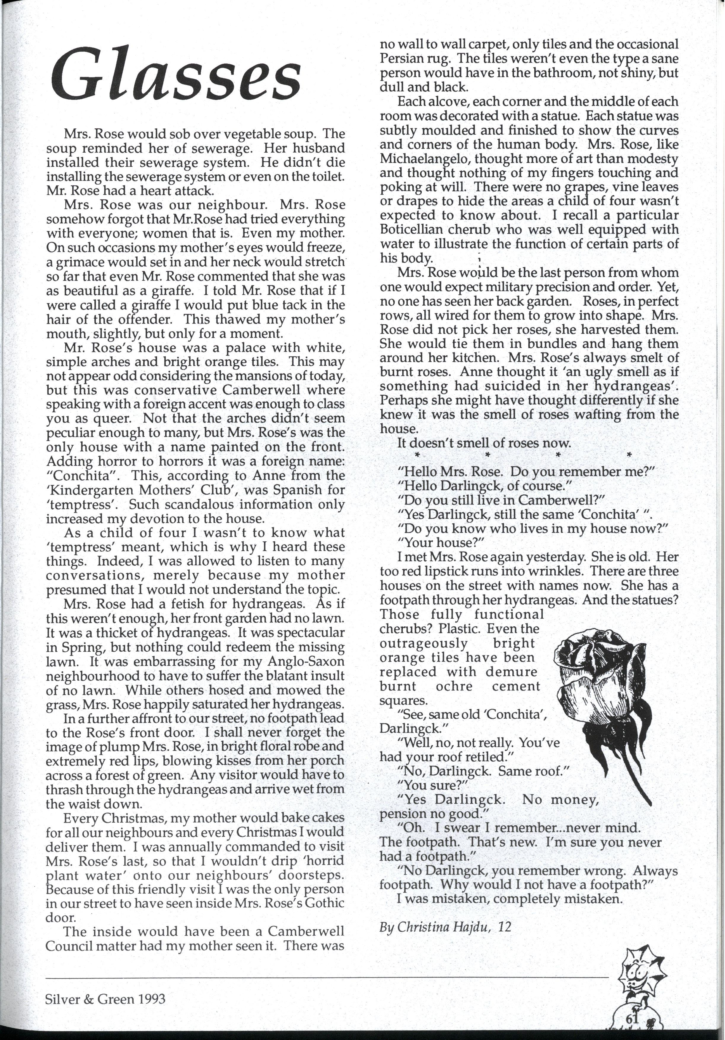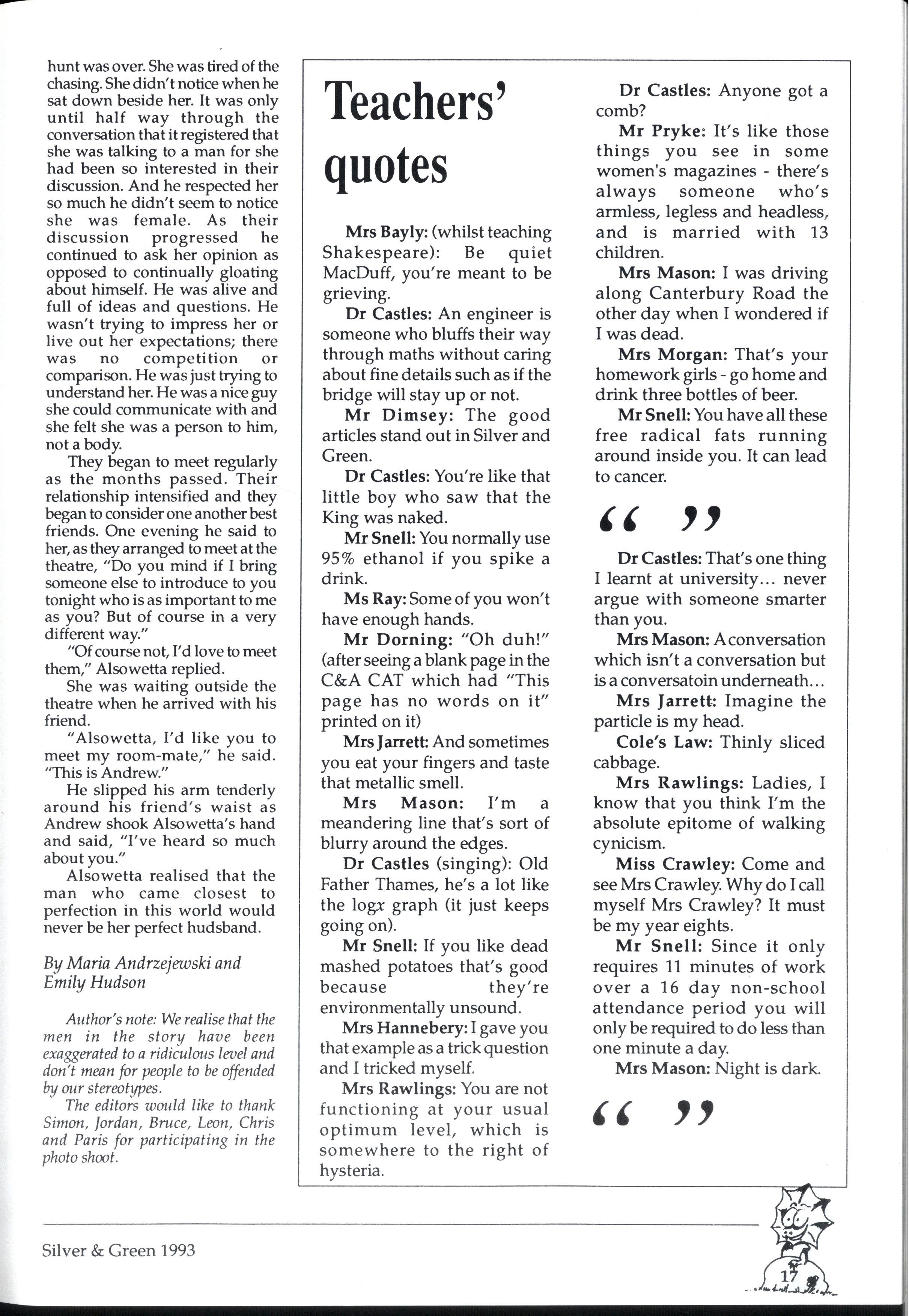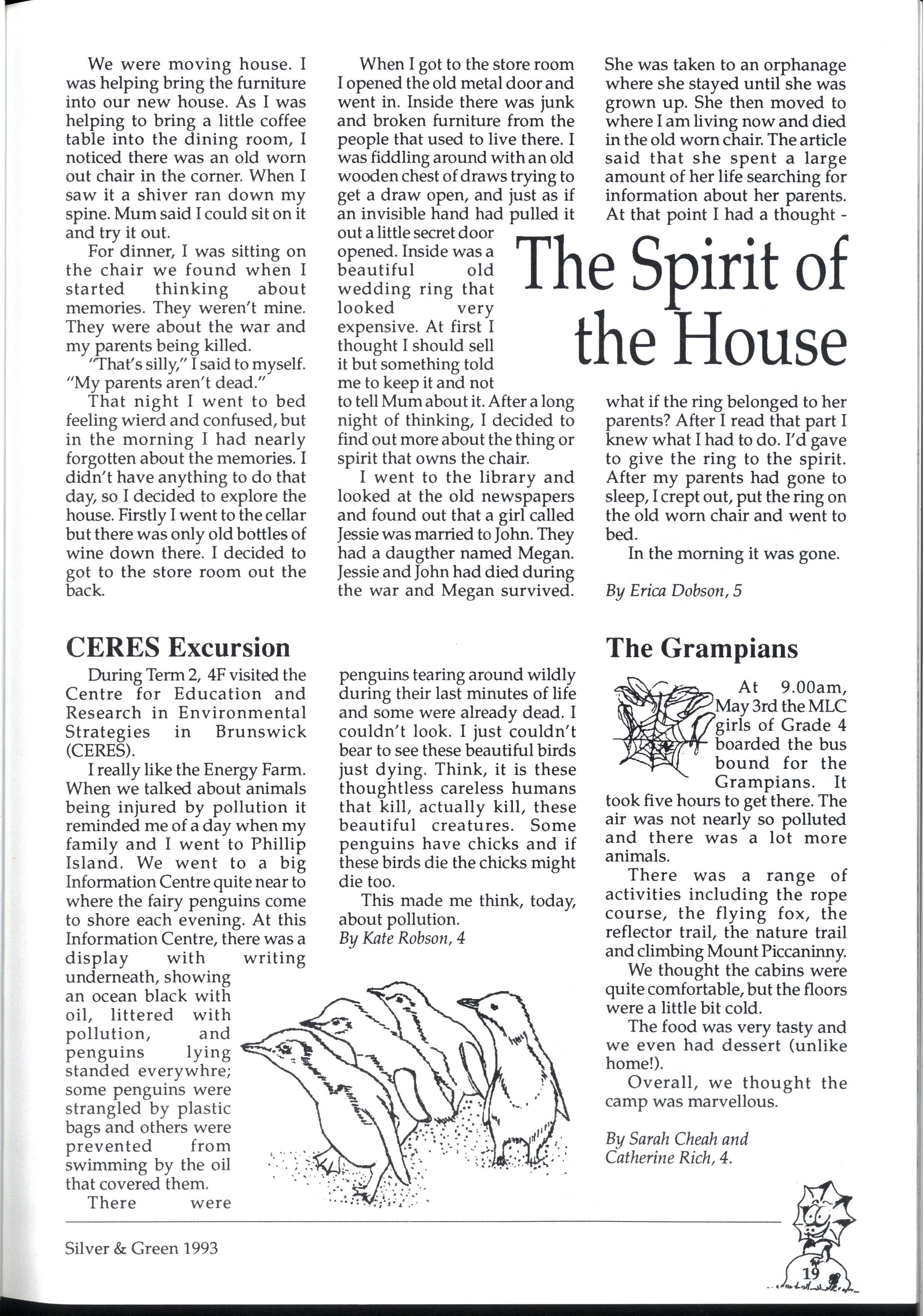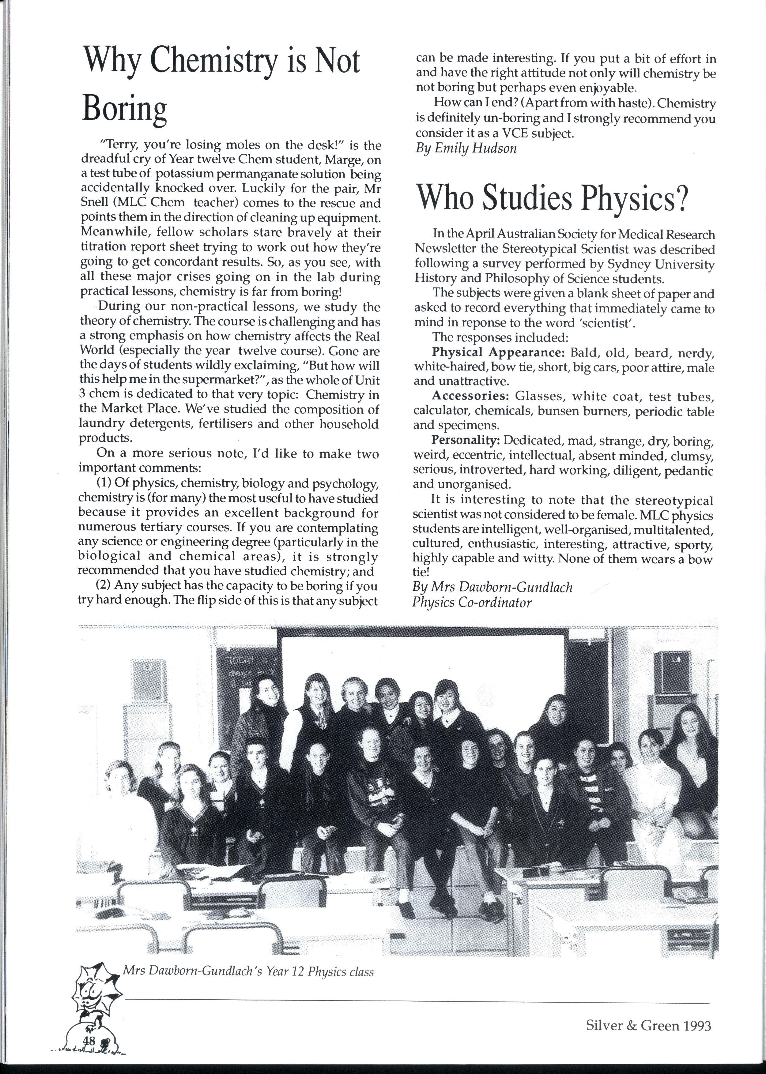 Emily and Rebbecca, two starry-eyed science students, were appointed as editors of the school magazine Little did they know the task ahead of them; the organisational skills required, the sleepless nights and the frustrations, yet every cloud has a silver lining (to rely on a cliche) and regardless of all the difficult times, they found the task thoroughly enjoyable and rewarding. Do you have any idea how disconcerting it is to stand up in assembly and try to convince a hall full of girls that what they most want to do is write for Silver and Green? The slightest mention of Silver and Green tends to switch students' brains into neutral But Emily and Rebbecca persevered.. * * *