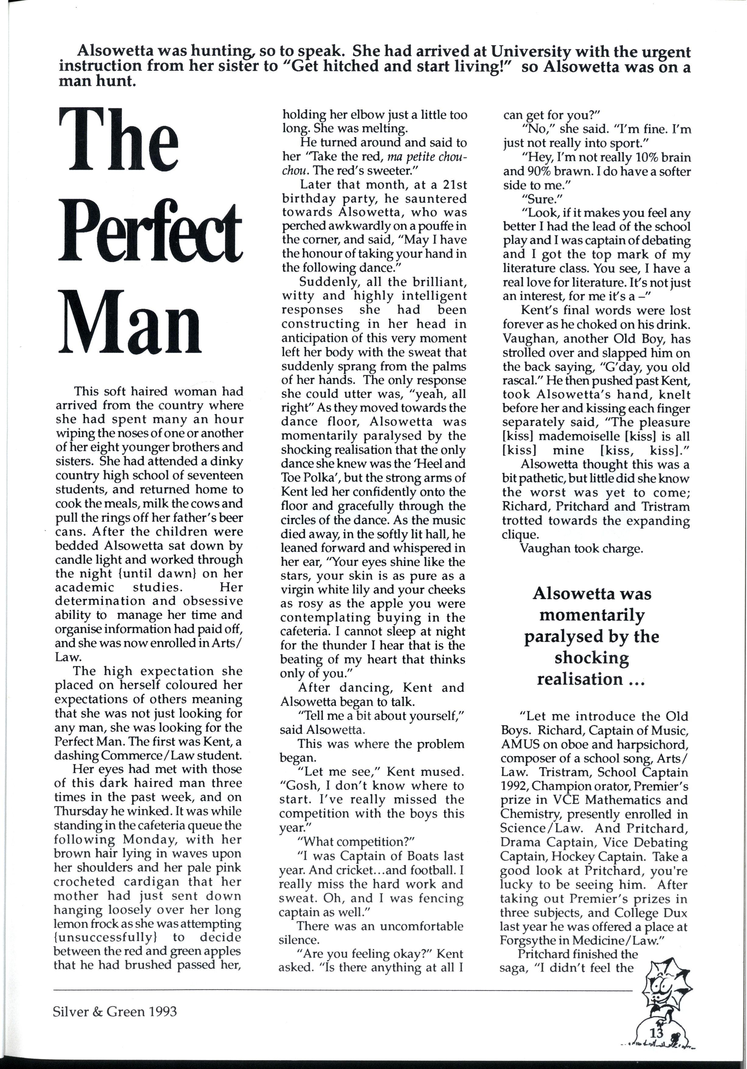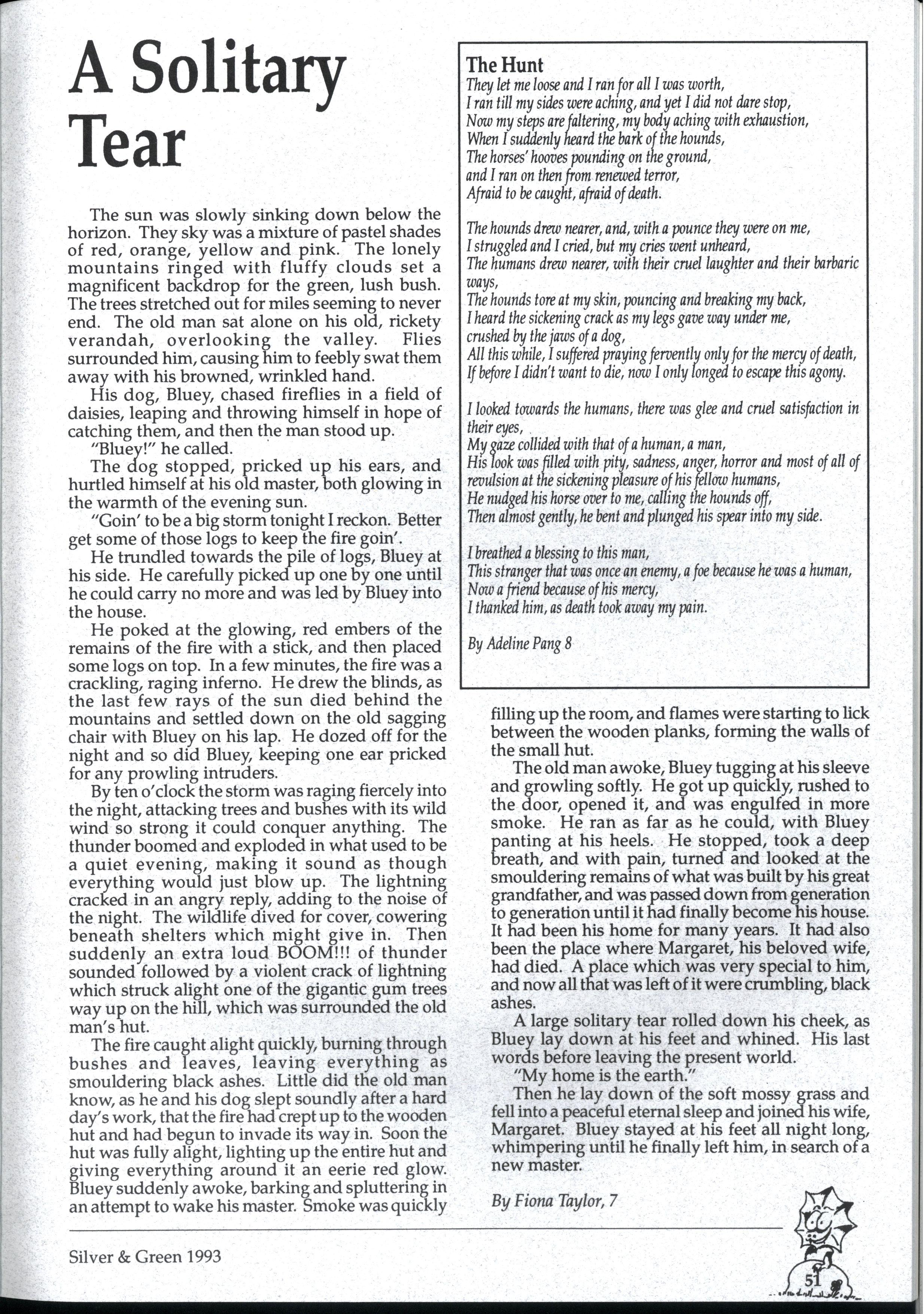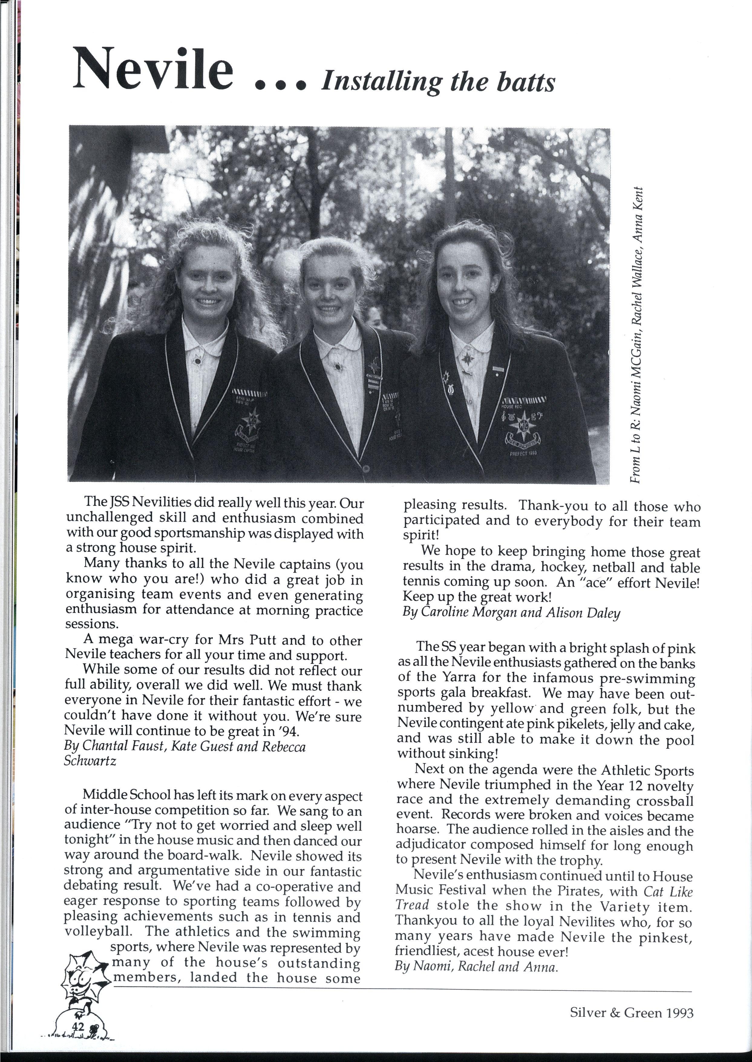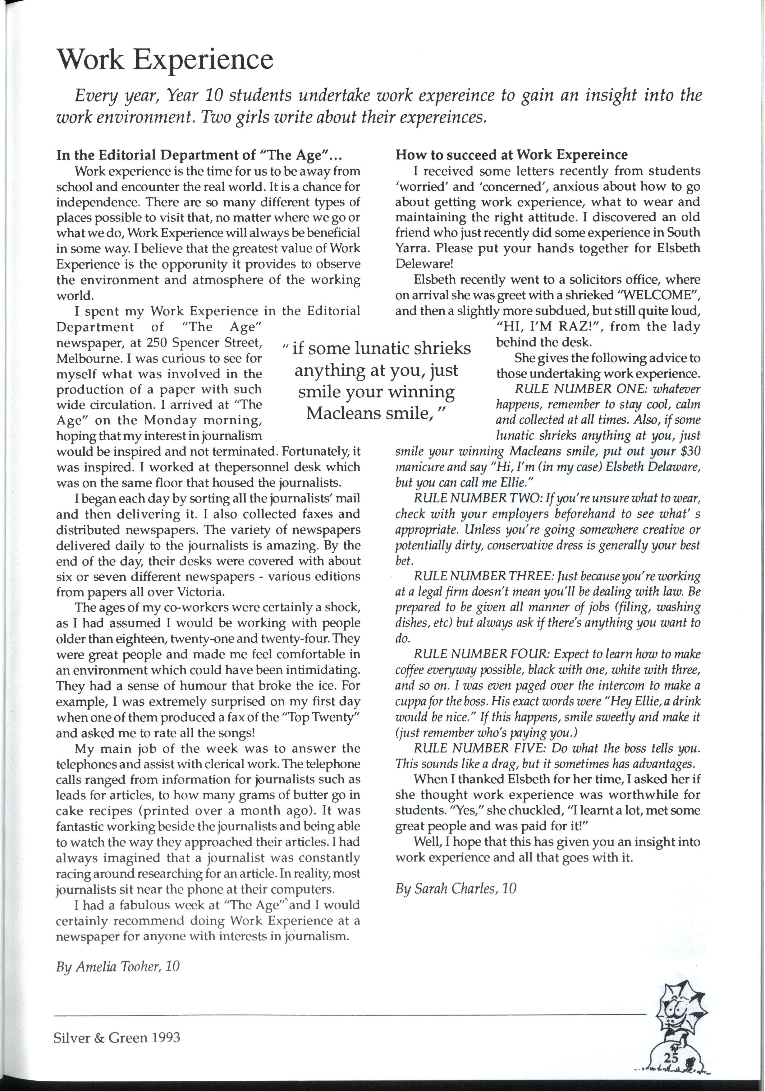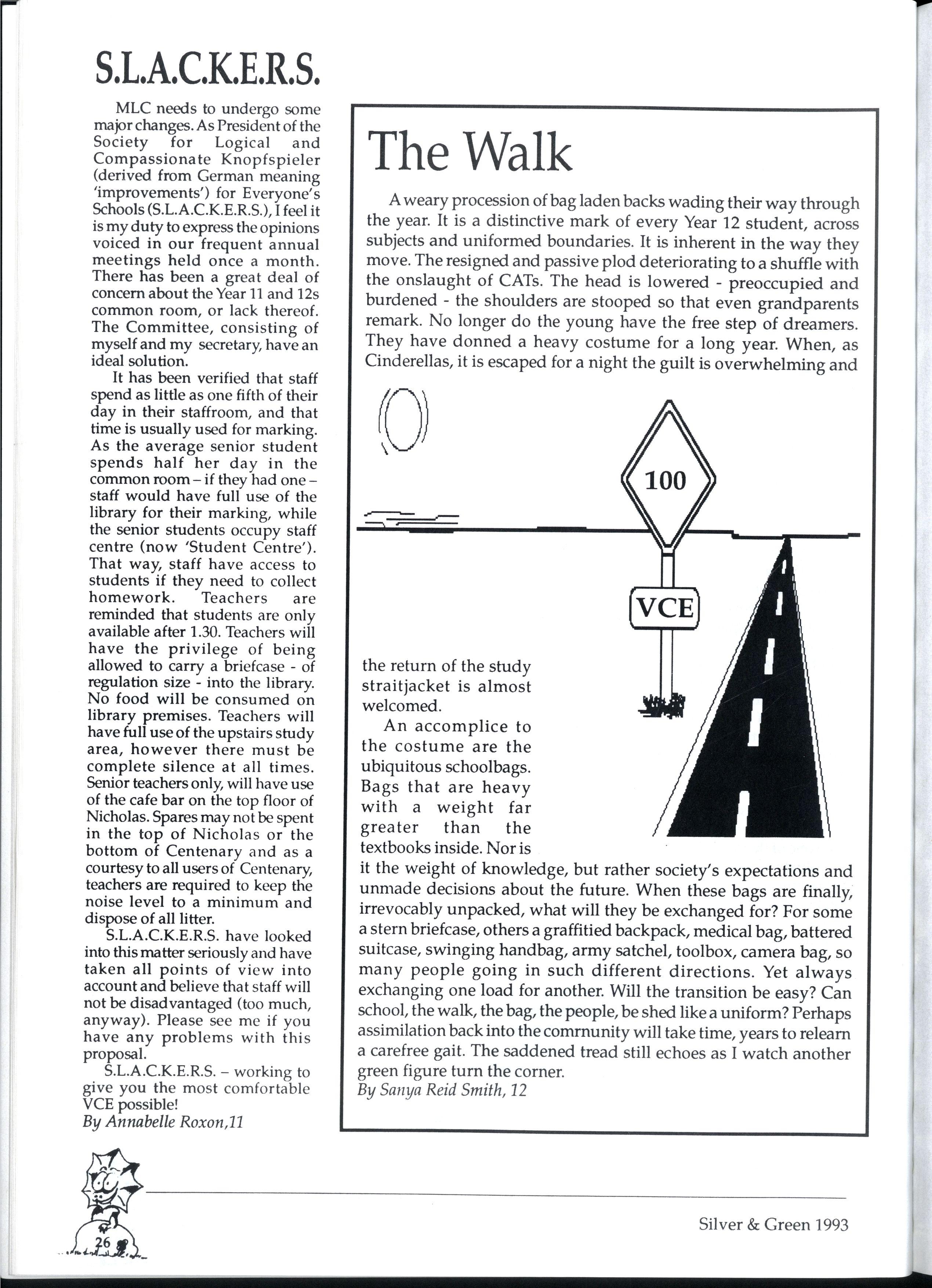 Emily and Rebbecca, two starry-eyed science students, were appointed as editors of the school magazine Little did they know the task ahead of them; the organisational skills required, the sleepless nights and the frustrations, yet every cloud has a silver lining (to rely on a cliche) and regardless of all the difficult times, they found the task thoroughly enjoyable and rewarding. Do you have any idea how disconcerting it is to stand up in assembly and try to convince a hall full of girls that what they most want to do is write for Silver and Green? The slightest mention of Silver and Green tends to switch students' brains into neutral But Emily and Rebbecca persevered.. * * *