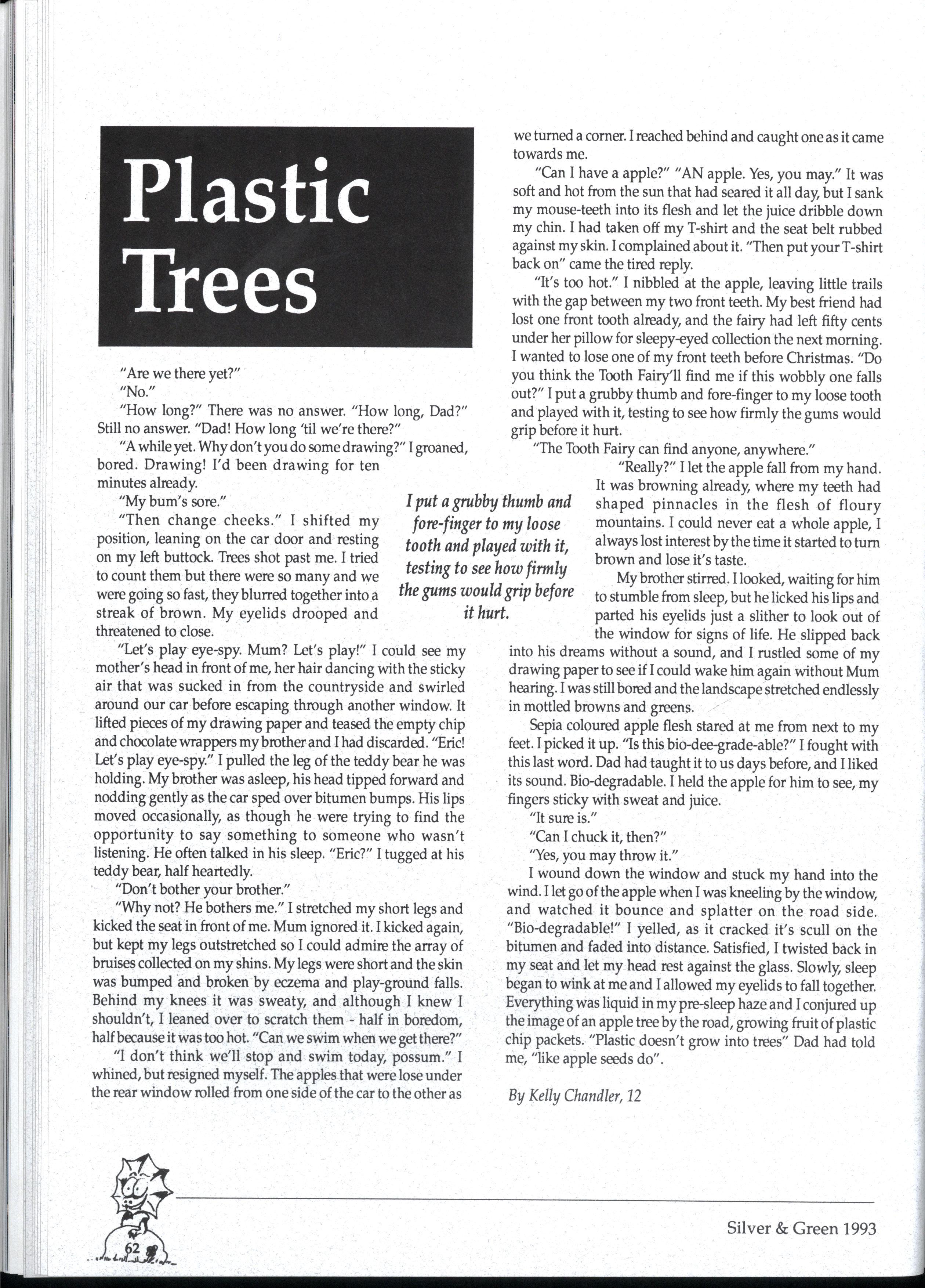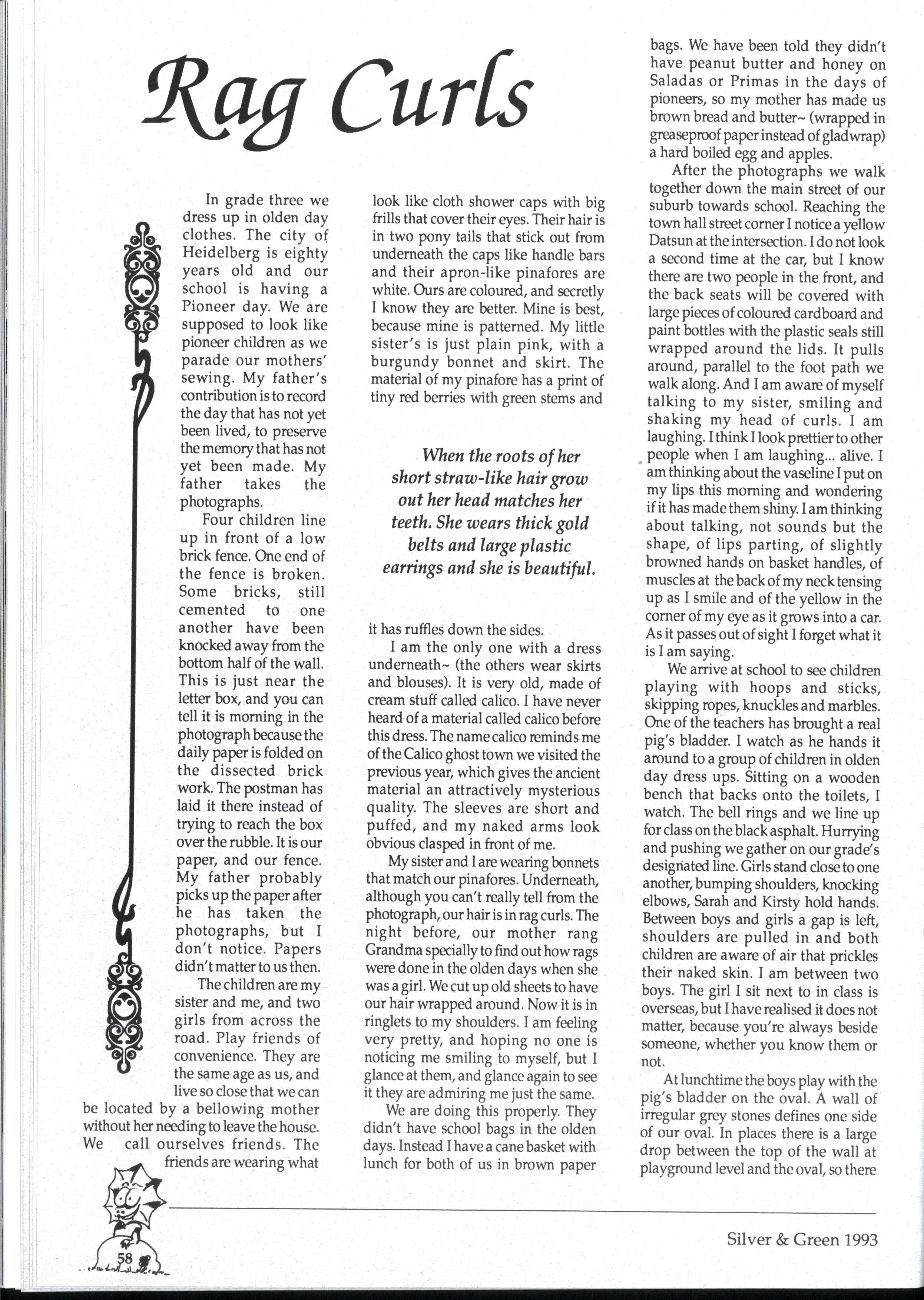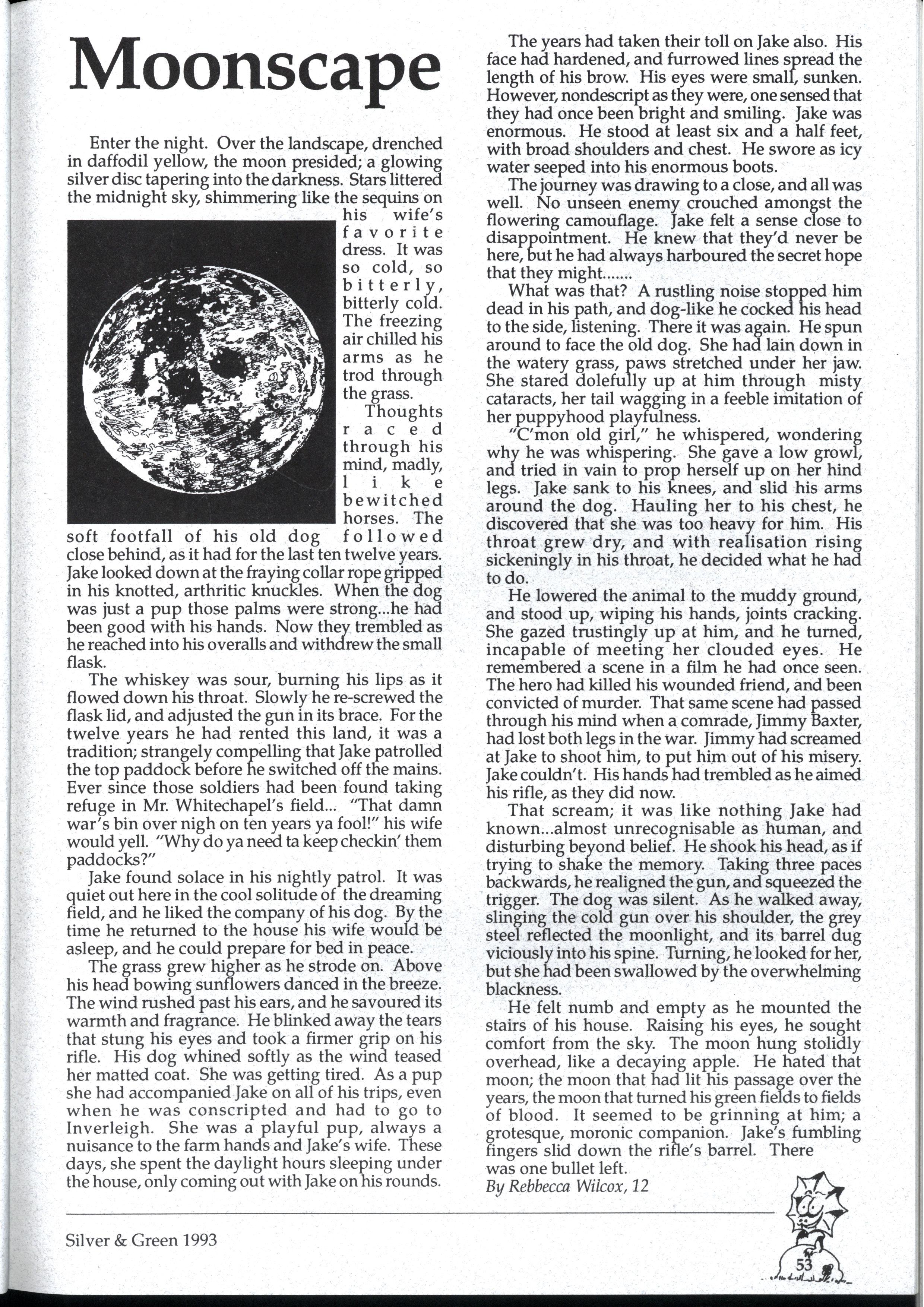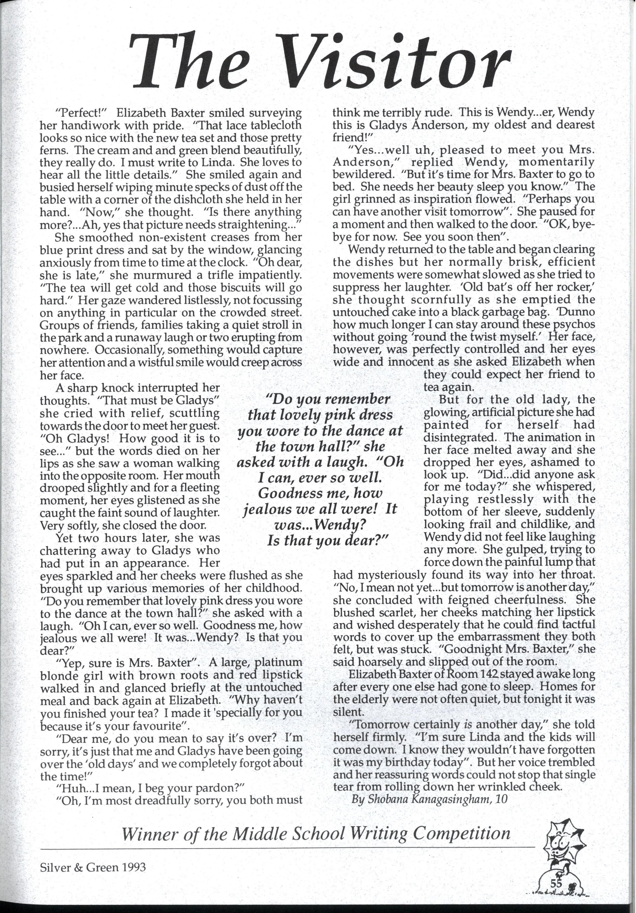 Emily and Rebbecca, two starry-eyed science students, were appointed as editors of the school magazine Little did they know the task ahead of them; the organisational skills required, the sleepless nights and the frustrations, yet every cloud has a silver lining (to rely on a cliche) and regardless of all the difficult times, they found the task thoroughly enjoyable and rewarding. Do you have any idea how disconcerting it is to stand up in assembly and try to convince a hall full of girls that what they most want to do is write for Silver and Green? The slightest mention of Silver and Green tends to switch students' brains into neutral But Emily and Rebbecca persevered.. * * *