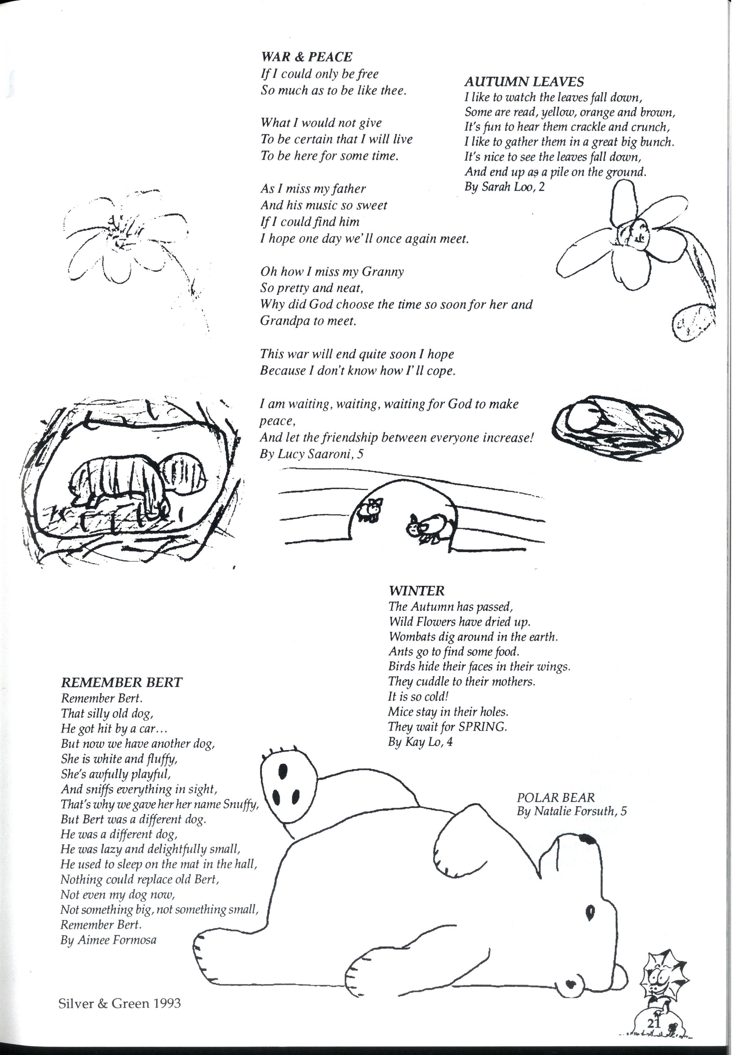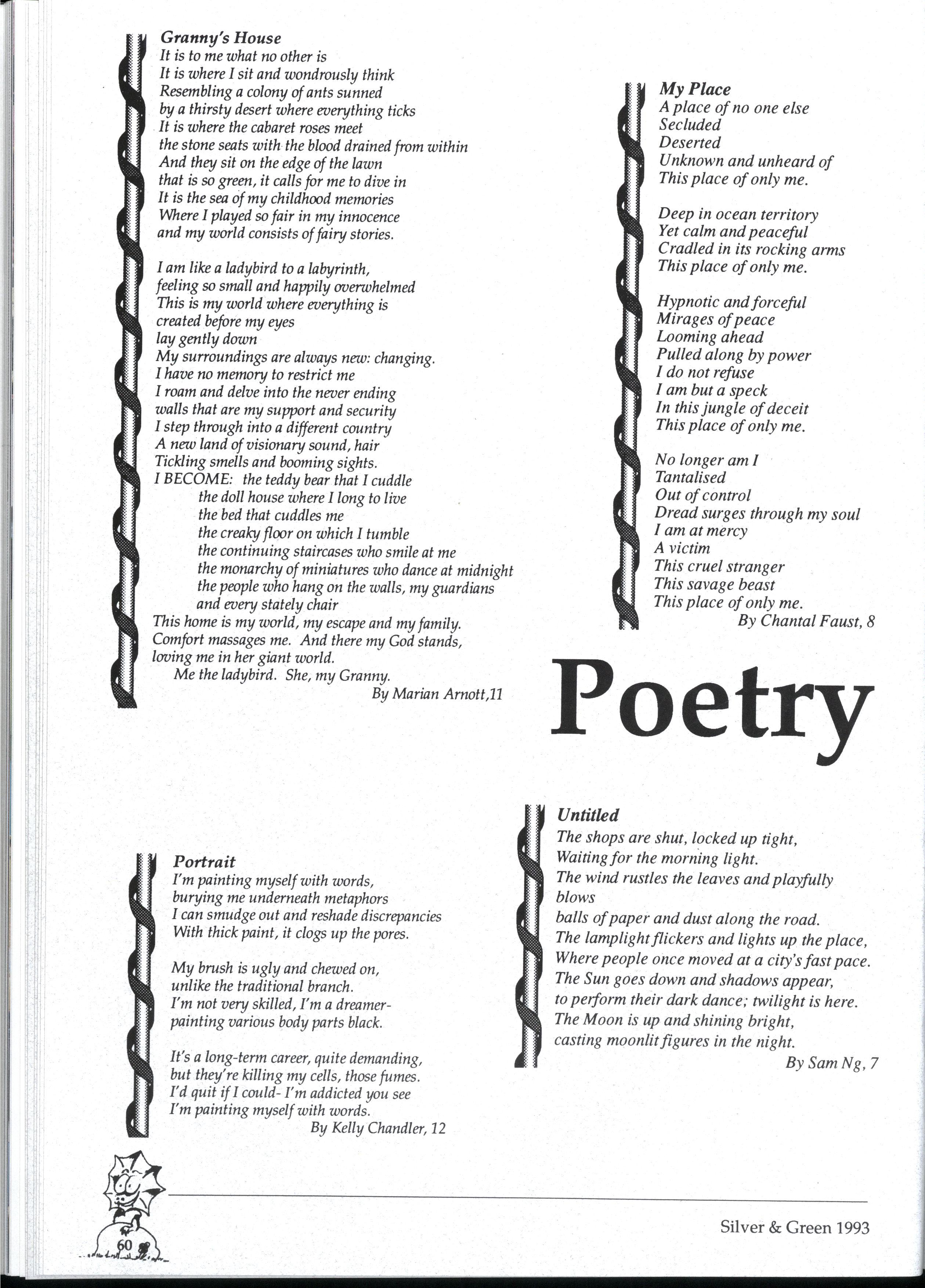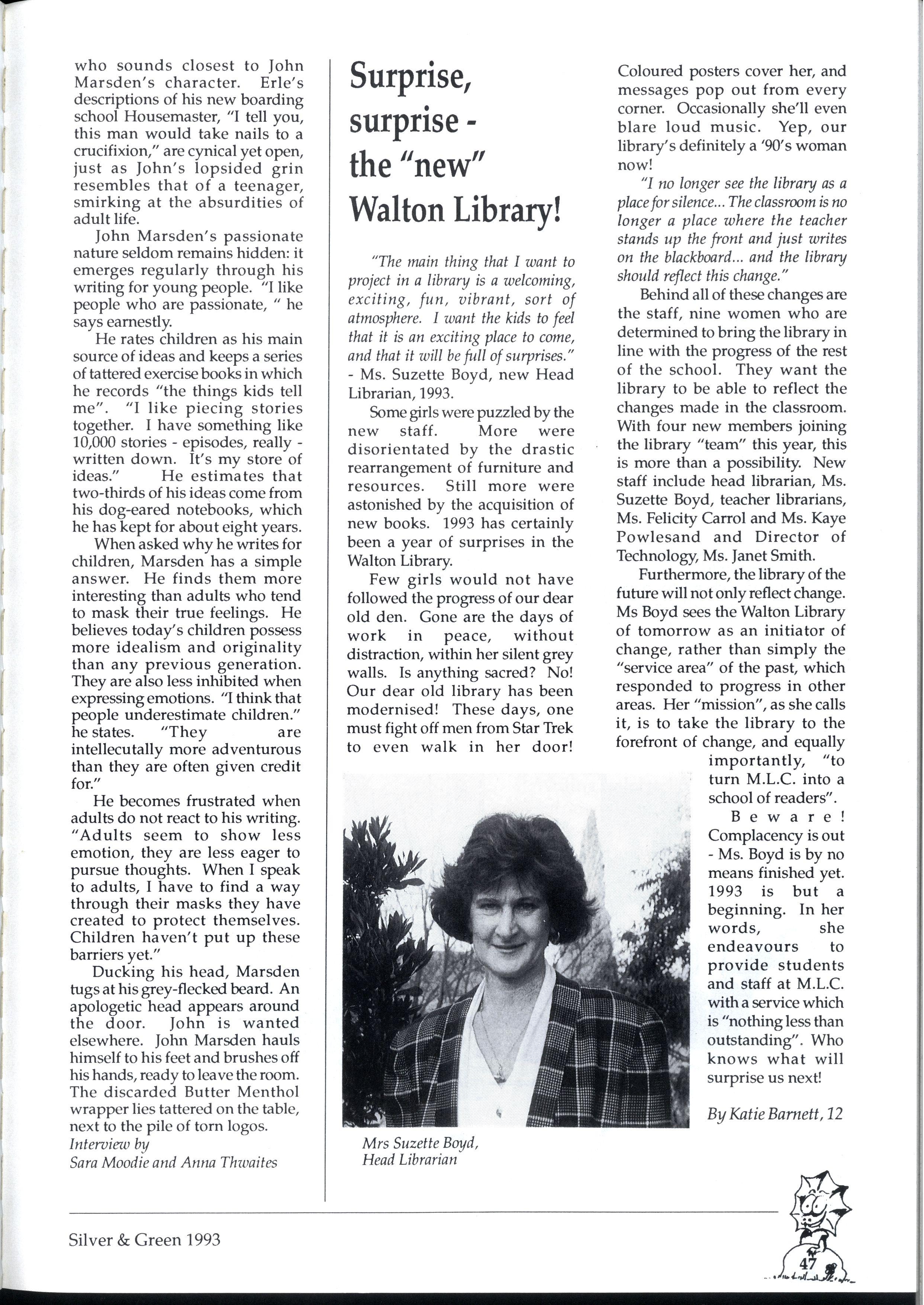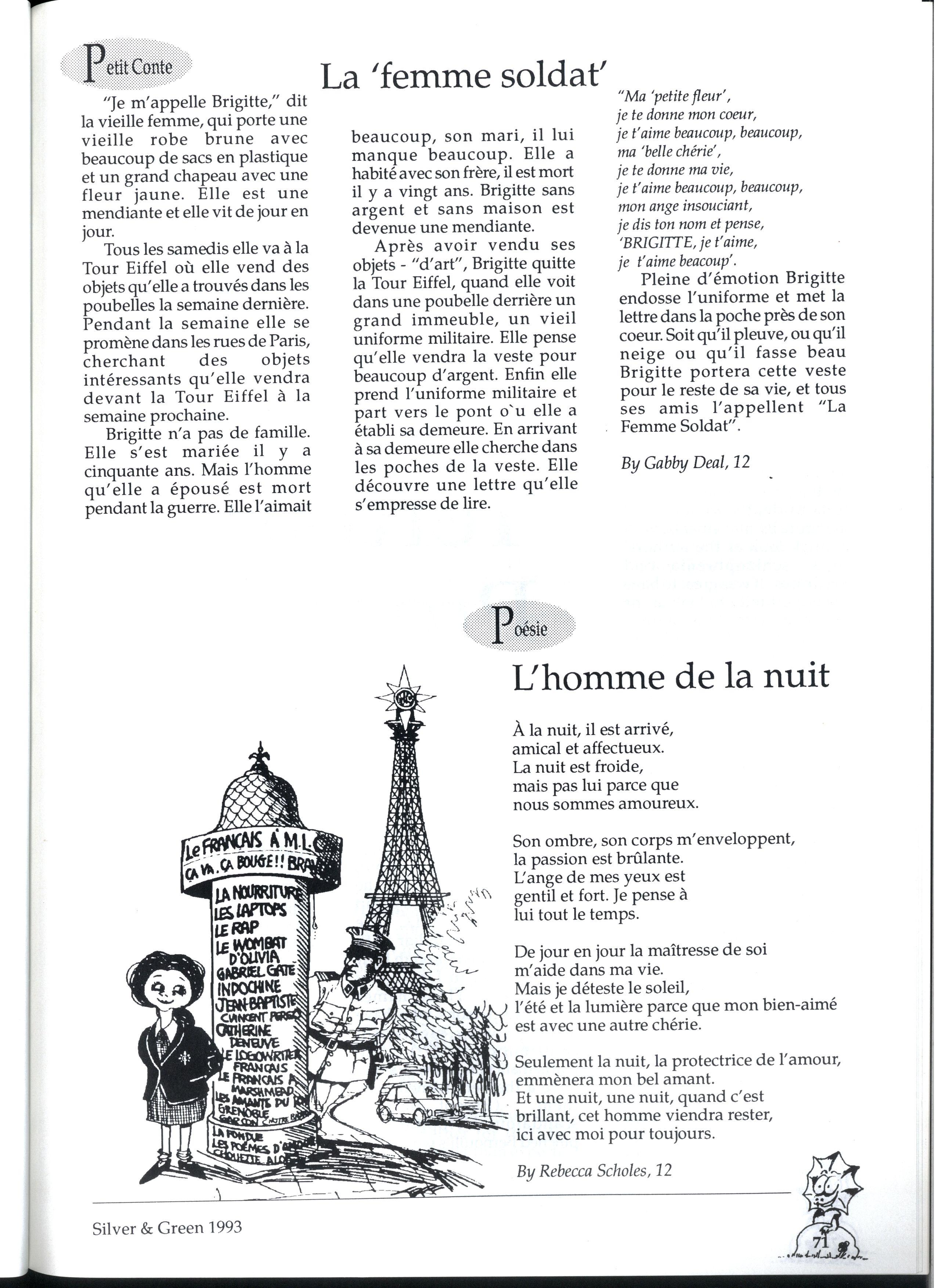 Emily and Rebbecca, two starry-eyed science students, were appointed as editors of the school magazine Little did they know the task ahead of them; the organisational skills required, the sleepless nights and the frustrations, yet every cloud has a silver lining (to rely on a cliche) and regardless of all the difficult times, they found the task thoroughly enjoyable and rewarding. Do you have any idea how disconcerting it is to stand up in assembly and try to convince a hall full of girls that what they most want to do is write for Silver and Green? The slightest mention of Silver and Green tends to switch students' brains into neutral But Emily and Rebbecca persevered.. * * *