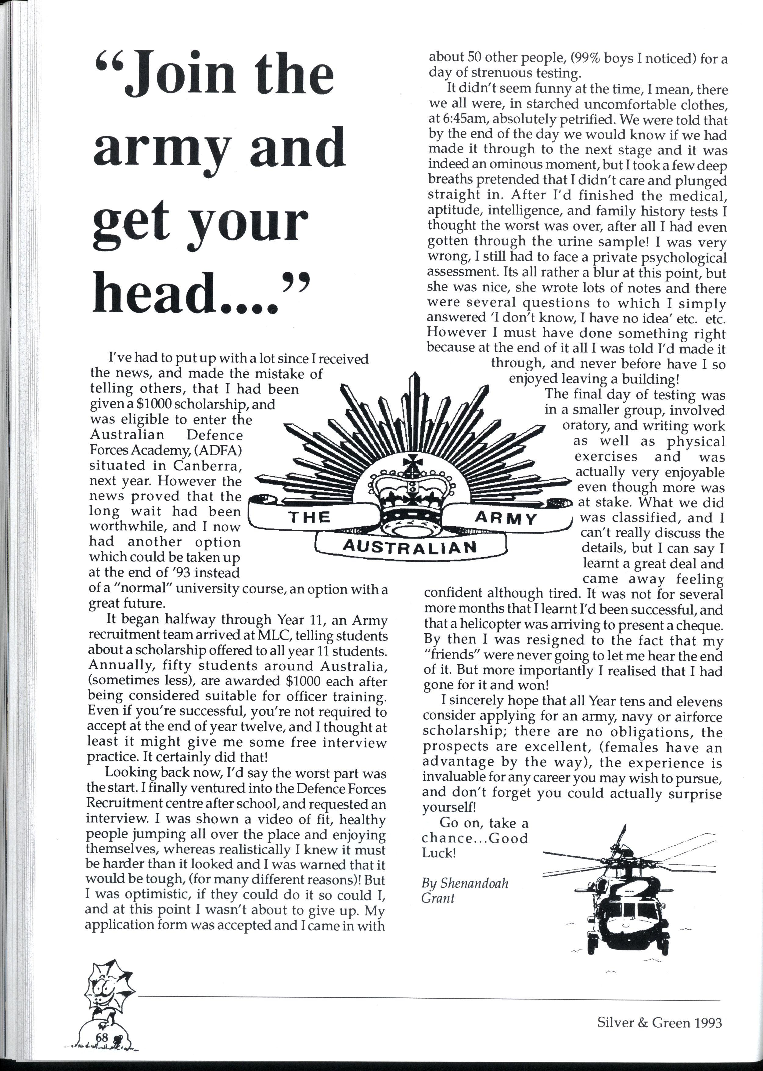 I sincerely hope that all Year tens and elevens consider applying for an army, navy or airforce scholarship ; ther e are no obligations , th e prospect s are excellent, (female s hav e an advantag e by th e way) , th e experienc e is invaluable for any career you may wish to pursue, an d don't forget yo u could actually surprise yourself!