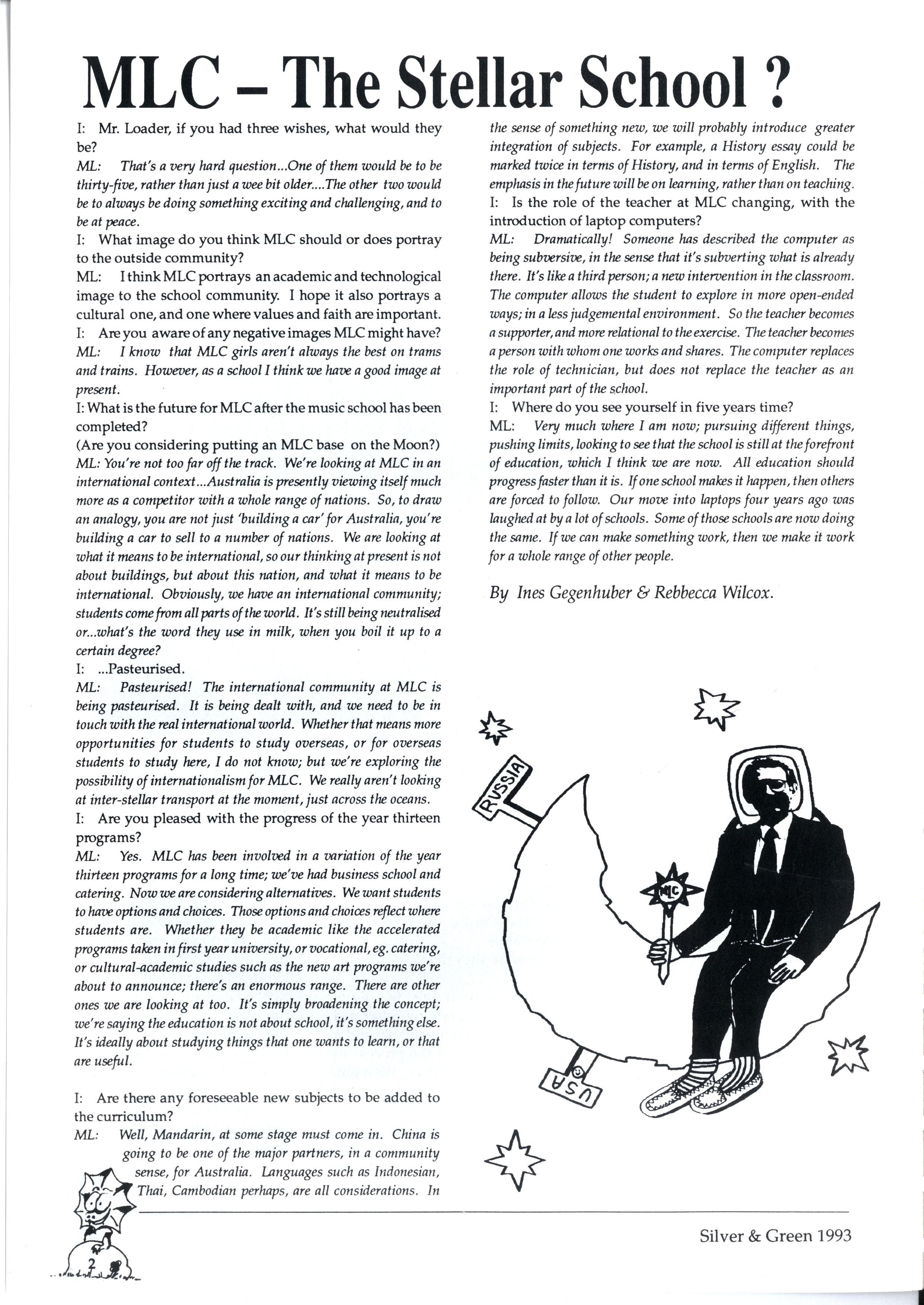 ML: Pasteurised! The international community at MLC is being pasteurised. It is being dealt with, and we need to be in touch with the real international world. Whether that means more opportunities for students to study overseas, or for overseas students to study here, I do not know; but we're exploring the possibility of internationalism for MLC. We really aren't looking at inter-stellar transport at the moment, just across the oceans.