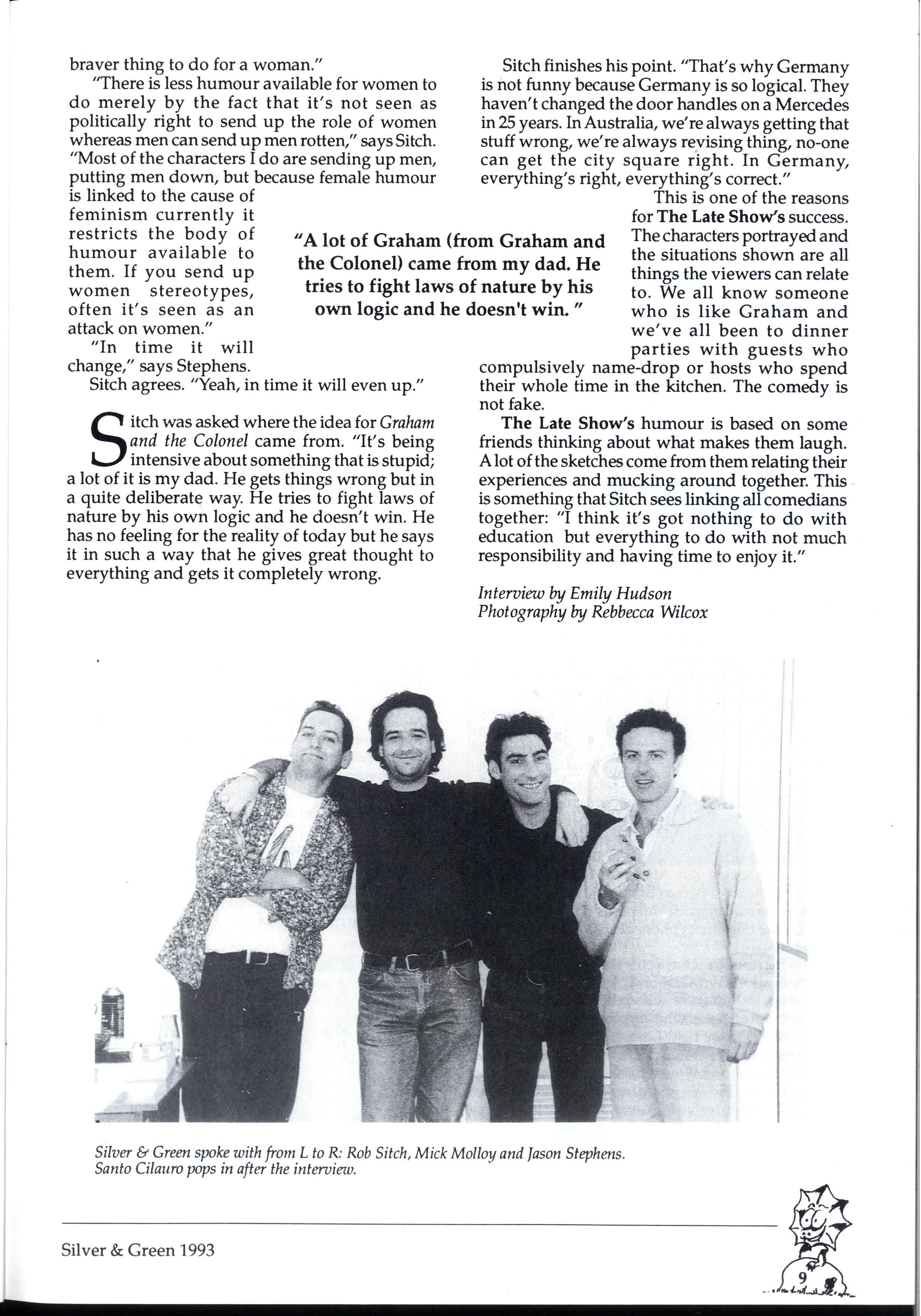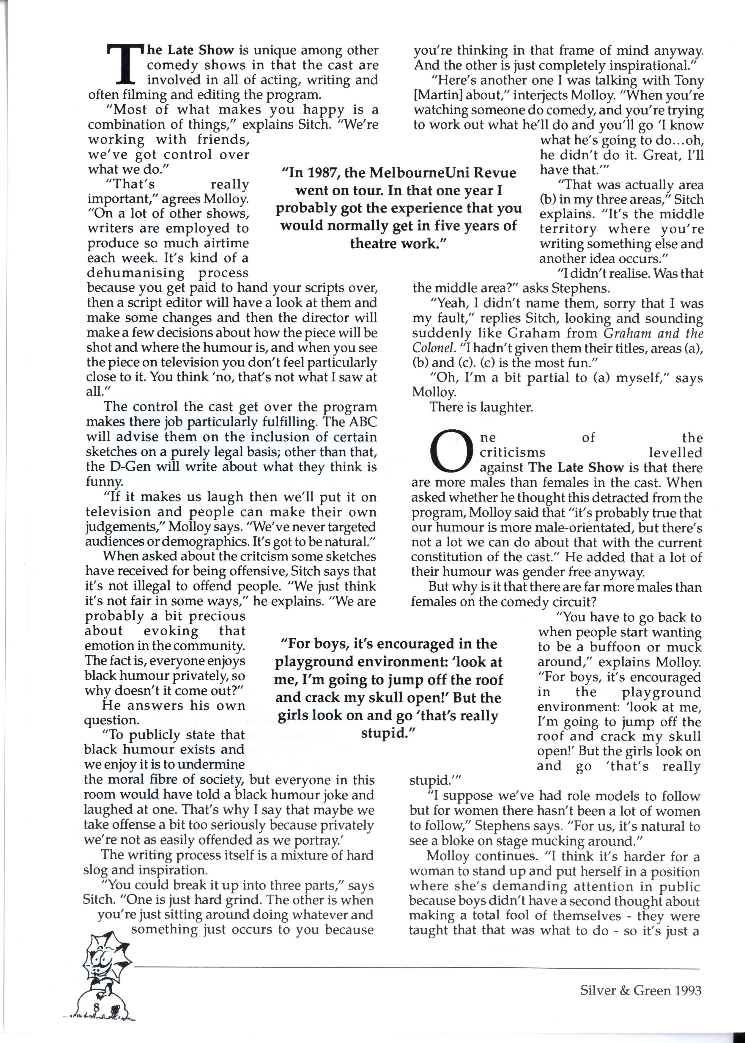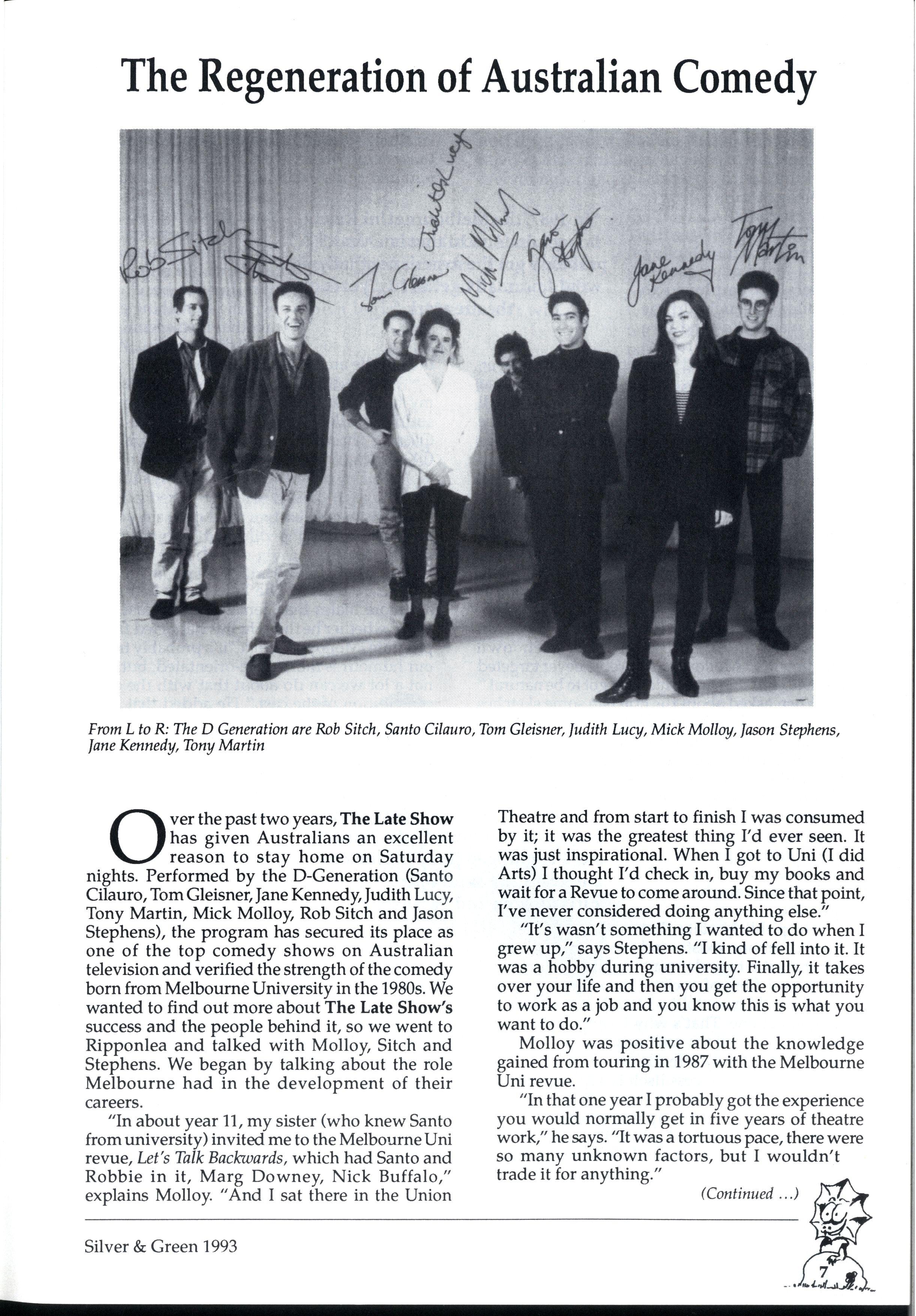 Over the past two years, The Late Show has given Australians an excellent reason to stay hom e on Saturday nights Performed by the D-Generation (Santo Cilauro, Tom Gleisner, Jane Kennedy, Judith Lucy, Tony Martin, Mick Molloy, Rob Sitch and Jason Stephens), the program has secured its place as one of the top comed y shows on Australian television and verified the strength of the comedy born from Melbourne University in the 1980s We wanted to find out more about The Late Show's success and the people behind it, so we went to Ripponlea an d talked with Molloy, Sitch and Stephens We began by talking about the role Melbourne ha d in the development of their careers