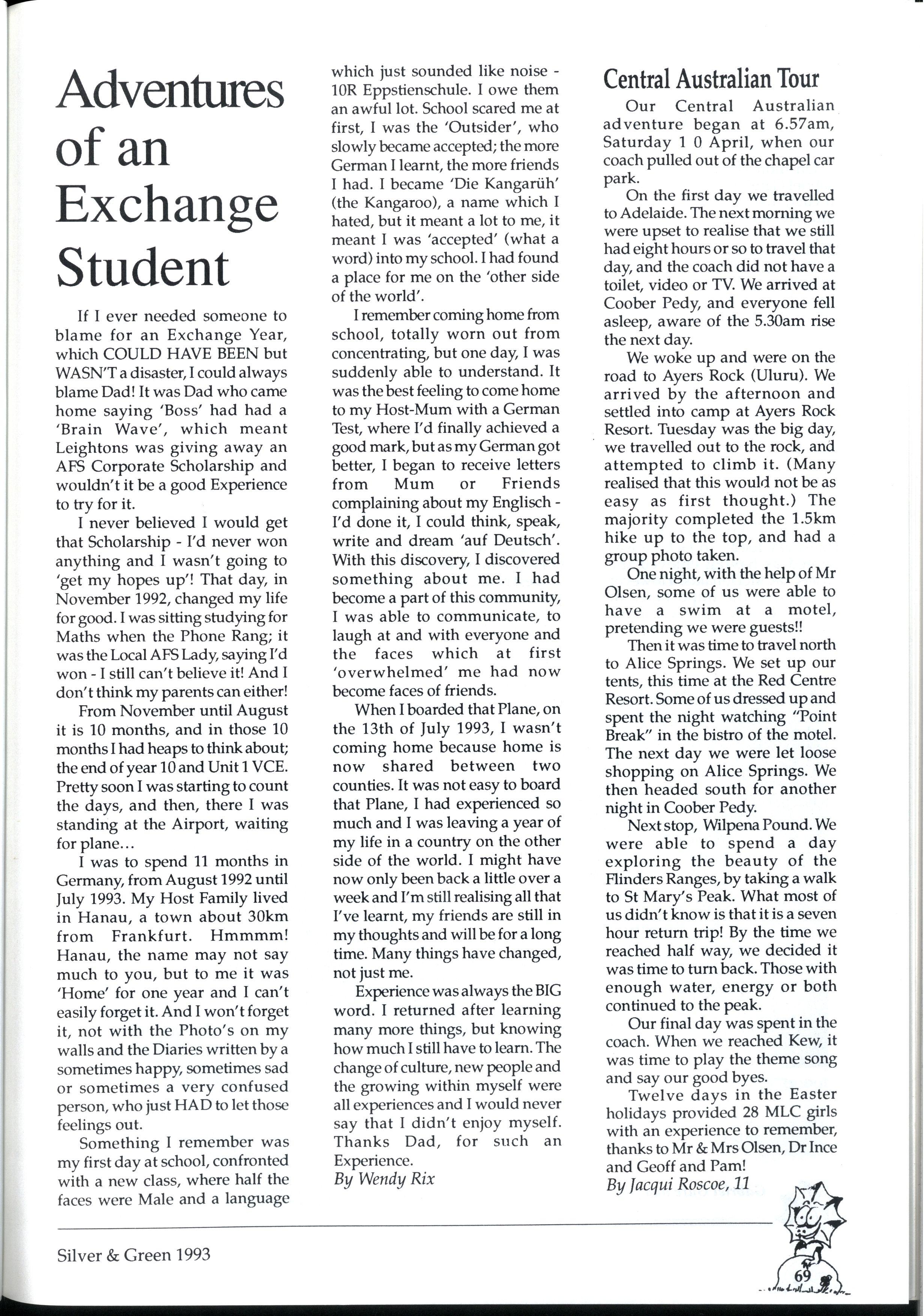 I never believed I would get that Scholarship - I'd never won anything and I wasn't going to 'get my hopes up'! That day, in November 1992, changed my life for good I was sitting studying for Maths when the Phone Rang; it was the Local AFS Lady, saying I'd won -1 still can't believe it! And I don't think my parents can either! From November until August it is 10 months, and in those 10 months I had heaps to think about; the end of year 10 and Unit 1VCE Pretty soon I was starting to count the days, and then, there I was standing at the Airport, waiting for plane...
