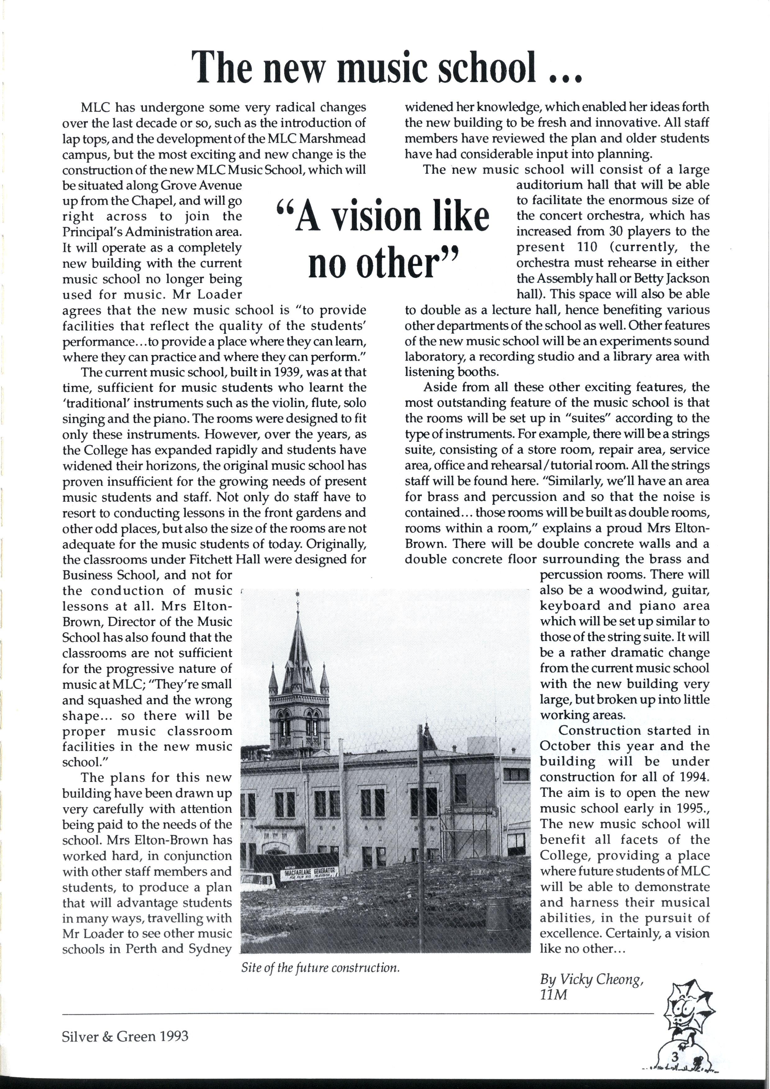 Construction started in October this year and the building will be under construction for all of 1994 The aim is to open the new music school early in 1995., The new music school will benefit all facets of the College, providing a place where future students of MLC will be able to demonstrate and harness their musical abilities, in the pursuit of excellence Certainly, a vision like no other...