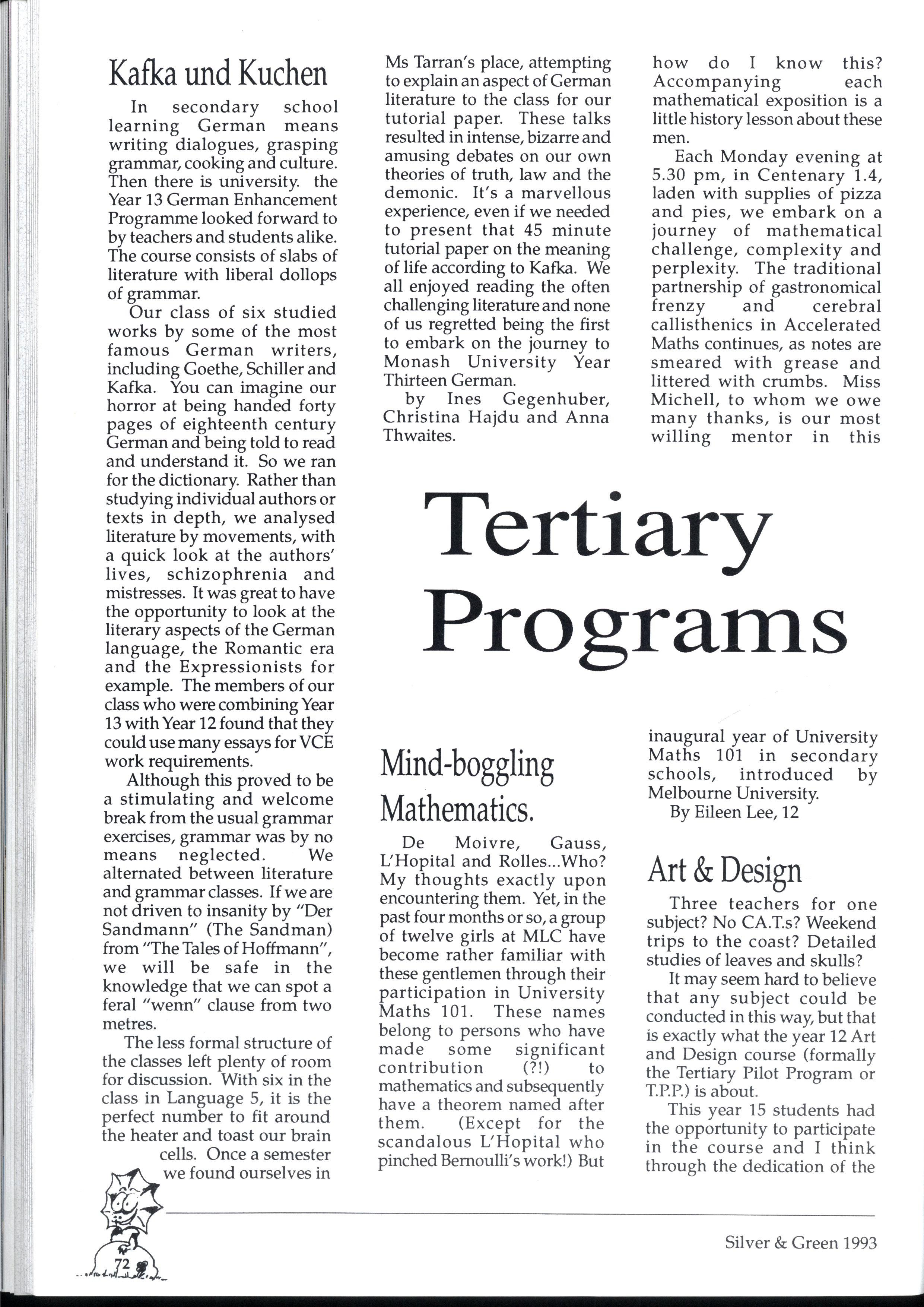 Ms Tarran's place, attempting to explain an aspect of German literature to the class for our tutorial paper These talks resulted in intense, bizarre and amusing debates on our own theories of truth, law and the demonic It's a marvellous experience, even if w e needed to presen t that 45 minut e tutorial paper on the meaning of life according to Kafka We all enjoyed reading the often challenging literature and none of us regretted being the first to embark on the journey to Monas h Universit y Year Thirteen German by Ines Gegenhuber , Christina Hajd u an d Ann a Thwaites