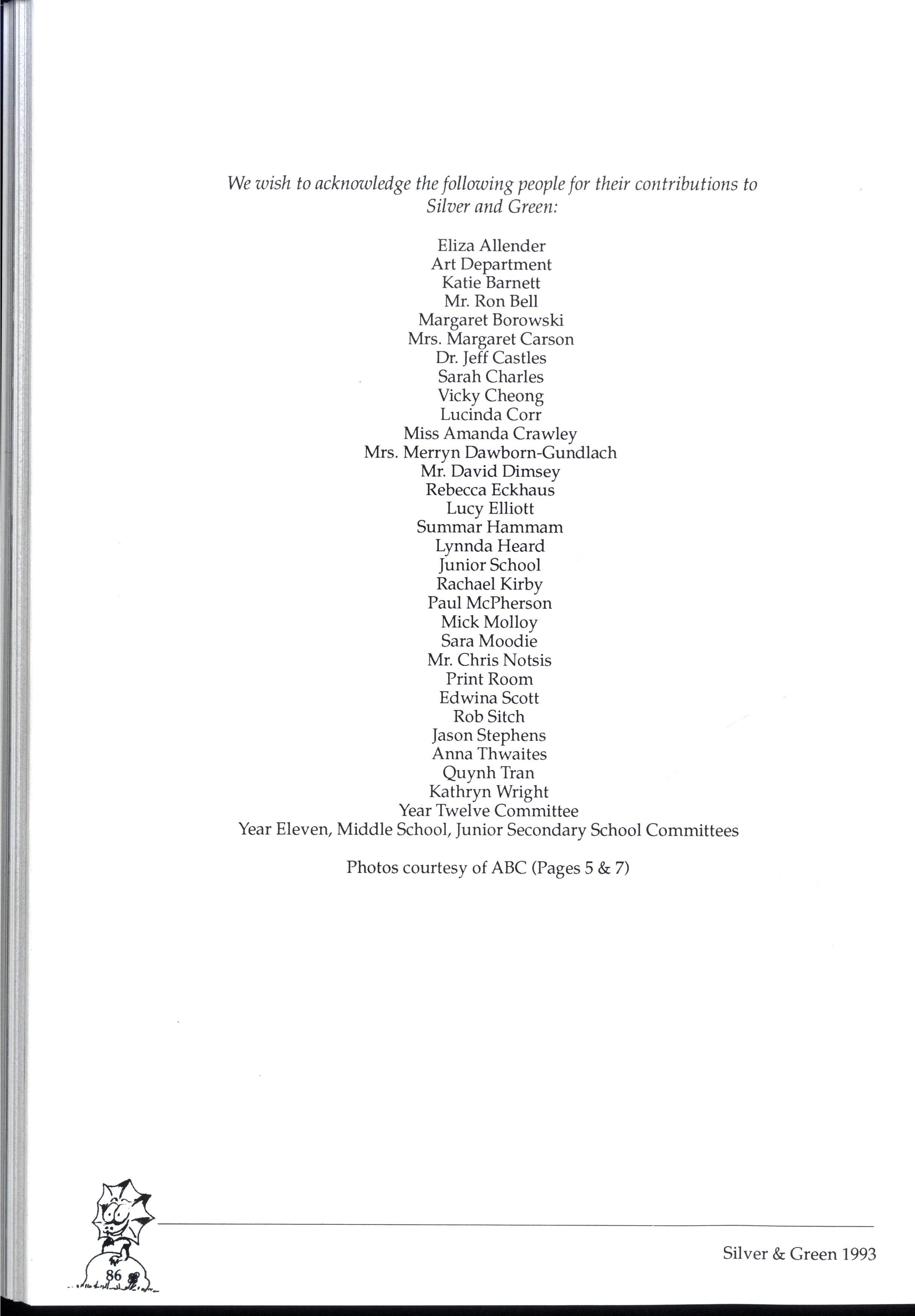 The knowledge we have gained, whilst editing Silver and Green, has been invaluable and a true indication of the process of producing a magazine. We really recommend that you get involved in future issues because ifs very rewarding and even (gasp) fun! We would like to thank the Year 12 committee, without whom this magazine could not have been