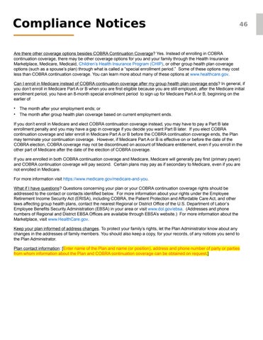 Are there other coverage options besides COBRA Continuation Coverage? Yes. Instead of enrolling in COBRA continuation coverage, there may be other coverage options for you and your family through the Health Insurance Marketplace, Medicare, Medicaid, Children’s Health Insurance Program (CHIP), or other group health plan coverage options (such as a spouse’s plan) through what is called a “special enrollment period.” Some of these options may cost less than COBRA continuation coverage. You can learn more about many of these options at www.healthcare.gov