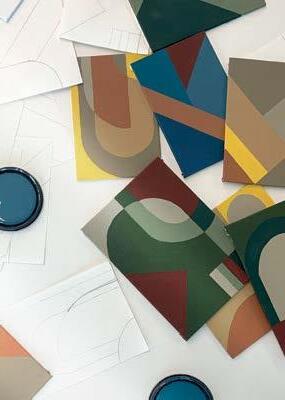 Designing a dynamic flooring collection that can both enhance and balance a space requires a reflective process. When setting out to design the latest collection within the Deconstructed® platform, product designer Amanda Hopkins worked through different iterations of the patterns, studying the bold geometrics and saturated colors to find the right combination of shape and form. Through line sketches that explored intersection and shape to paintings that uncovered how form and color interact, the process was hands-on. As she worked, Amanda revisited the proportion and colors, subtly contrasting shapes to strike a delicate balance in pattern and scale.