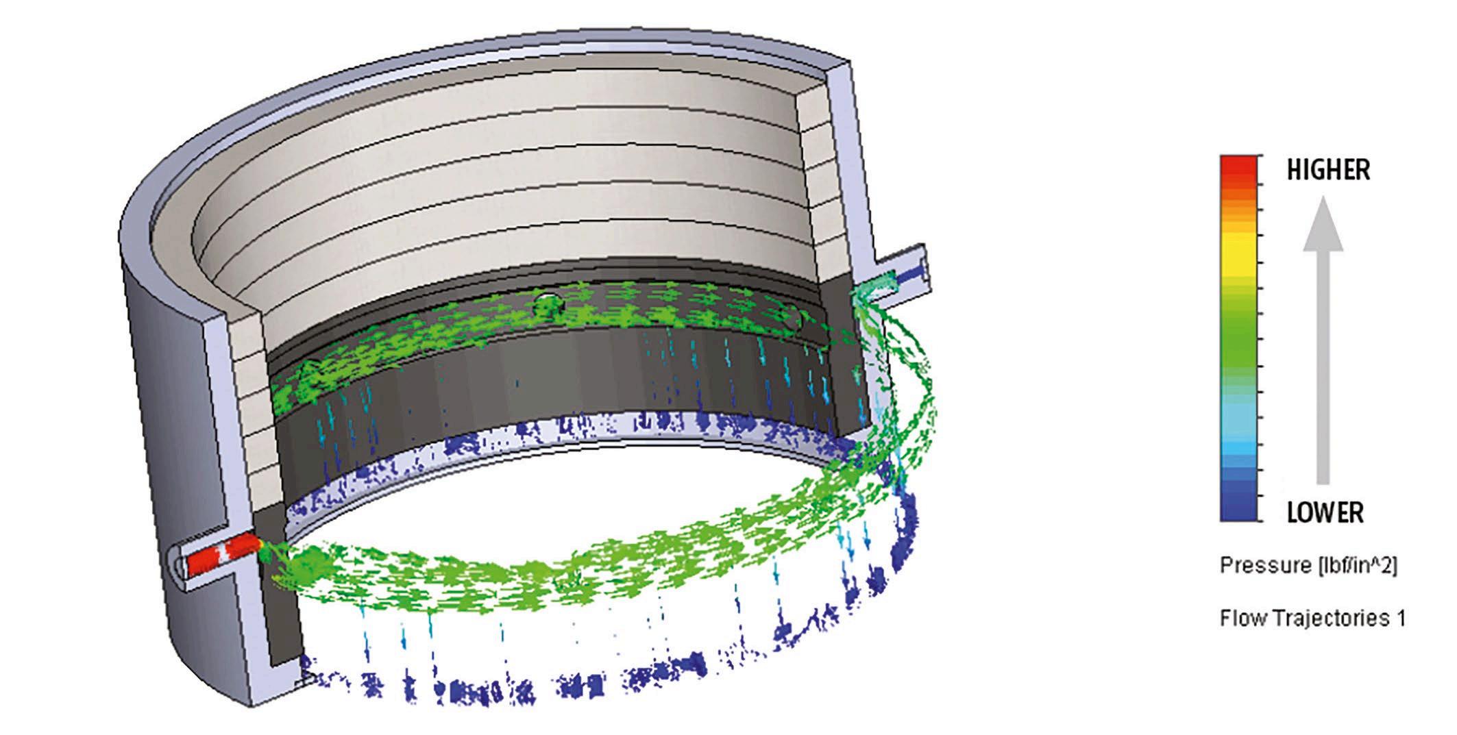 Simulations were conducted using a SealRyt PackRyt Bearing with an Integrated Lantern Ring (BLR) and a large slurry pump. The PackRyt Bearing’s tight tolerances and advanced design allow for precise control over fluid dynamics within the stuffing box, resulting in satisfactory sealing. For plants relying on packing only to seal their shafts, the flow rates can vary drastically from installation to adjustment. Additionally, achieving the crucial 15 psi differential needed to prevent process material from entering the stuffing box is much more challenging with packing-only systems. Other bushing products that lack the tight tolerances of the PackRyt Bearing are likely to experience sealing results similar to packing-only systems.