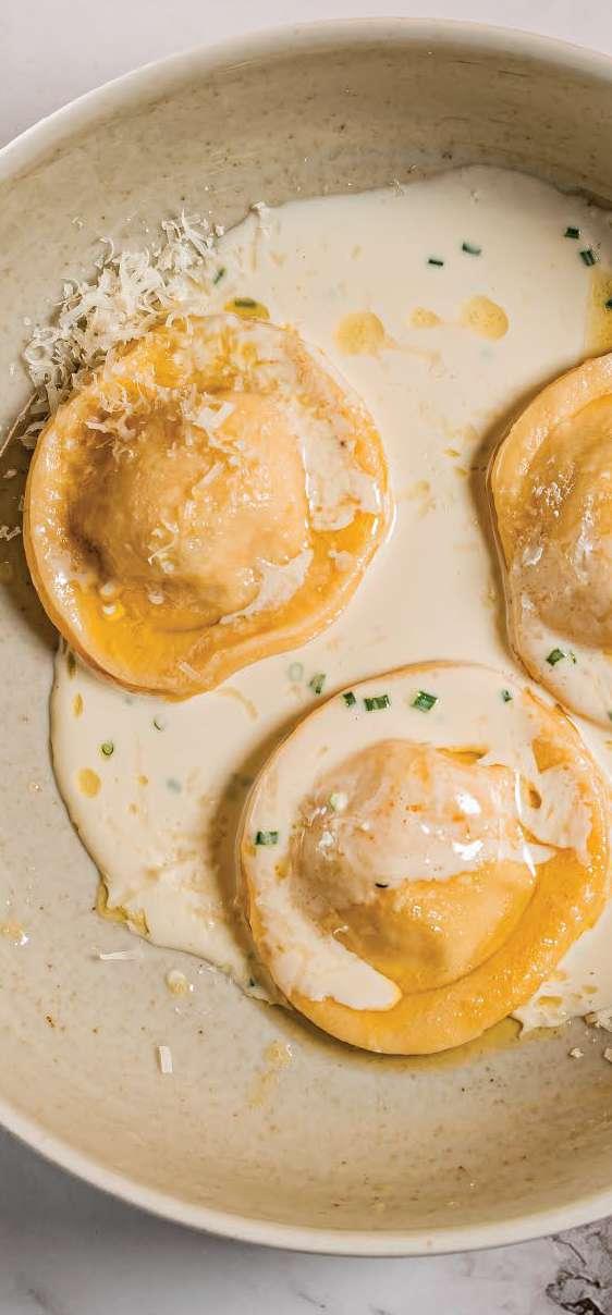 Itāļu virtuves klasika, kurā apvienoti paštaisīti vistas gaļas ravioli ar krēmīgu parmezāna siera mērci. Receptes pamatā ir tradicionāla olu mīkla un maigs pildījums, kas kopā ar siera mērci veido sātīgu un sabalansētu pamatēdienu.