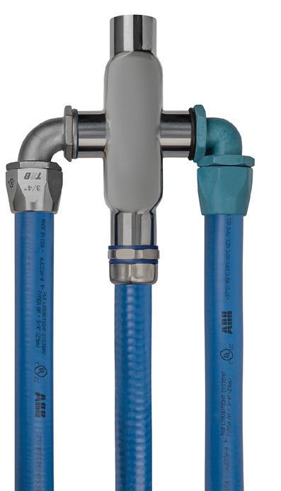 The Type A conduit T&B flexible to rigid assembly is UL Type 4, 4X, 12, and IEC IP69 rated. Designed for the demands of the food and beverage market, the entire T&B system is UL listed, ensuring every component meets the safety and performance standards when integrated. This flexible conduit and fittings system includes a Type A liquid-tight conduit, a non-metallic Type A fitting, a stainless steel Type A fitting, an LFTU blue antimicrobial metallic cored liquid-tight conduit, a seal gasket for a metallic Type A fitting, and a stainless-steel fitting with a food and beverage seal kit. ABB