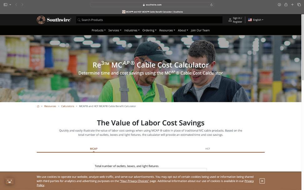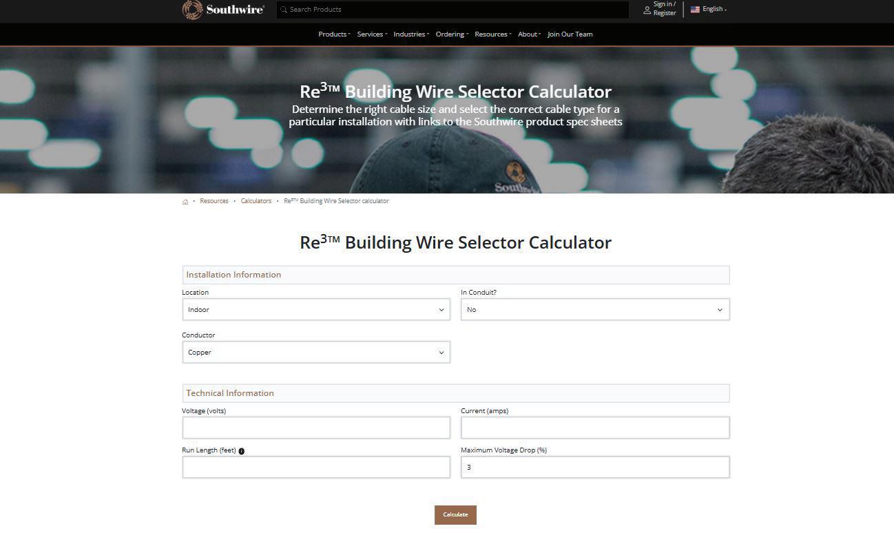 The Re3 building wire selector, an online calculator, quickly determines the minimum conductor size and ideal wire and cable type for given installation parameters. Each calculation yields the manufacturer’s part number and links to specification sheets for more product details, making it a suitable tool for on-the-spot, in-store calculations.