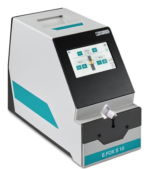 The E.FOX S 10, which weighs 22 lb, can reduce wire-stripping time to less than half a second, according to the company. The electric-driven wire-stripping device processes 28 AWG to 8 AWG conductors with a strip length between 2 mm and 20 mm. Adjustment to the desired cross-section and full or partial stripping length is completed quickly and precisely via motorized drives. Switching from a full to a partial strip or vice versa is simple with the touch of a button. The product is operated via a 5-in. touch display, and LED lights at the insertion point indicate the device’s readiness and status. Phoenix Contact