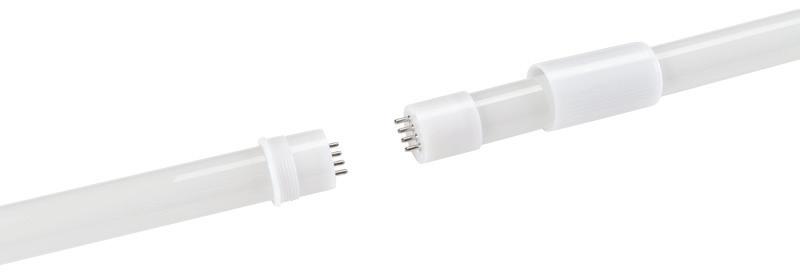 This LED tube comes in two 4-ft sections that fit together with a center pin connection and snug collar to keep them tightly locked. In addition, the lamp features Power and Color Select, allowing users to adjust both power output and color temperature easily. The UL Type B lamp is also available in a standard 8-ft tube. Both versions can be used in HO applications using R17d or Fa8, due to the included cap adapters that fit over the bi-pin. Each version offers five CCT and three power outputs to create the desired environment. The UL Type B lamps feature an integral driver for dependability, a maintenance-saving 50,000-hr life, can be used in tube-ready luminaires, and are compatible with emergency backups, supporting safety protocols.