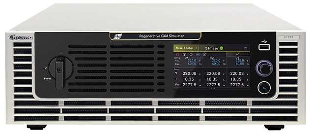 DerNetzsimulator 61815von Chroma isteinevollständig regenerative AC-Quellemit 4Quadranten. Er kombiniert eine hohe Leistungsdichte von15kVA miteiner kompakten Bauweise undist füranspruchsvolle ein- unddreiphasige Leistungstests im BereichHaushaltselektronik,industrielle Elektronik oder E-Mobility geeignet.Die Gerätehöhe vonnur 3HEbietetFlexibilitätbei derKonfiguration vonSystemschränken oder Prüfständen. FürerweiterteHochleistungsanwendungen können biszu drei Geräte parallelgeschaltet werden. Dank regenerativer Technologie wird dervom PrüflingerzeugteStrom insNetzzurückgespeist, wodurch