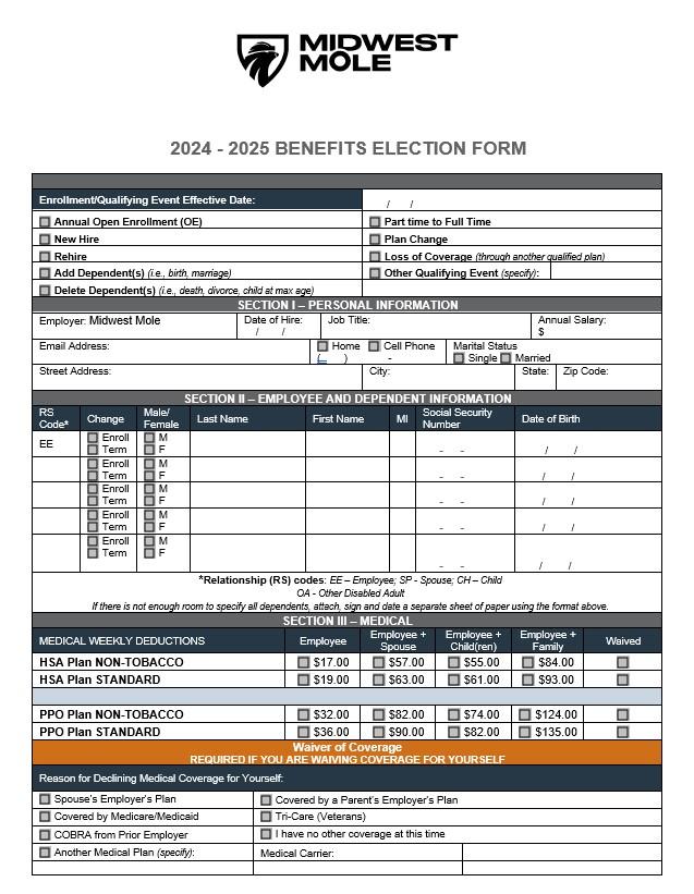 Welcometothe2024-2025MidwestMoleEmployee BenefitsGuide.Thisguideoffersyouandyourfamily membersalookintoyourcomprehensivebenefits program.Weencourageyoutotakethetimeto educateyourselfaboutyouroptionsandchoosethe bestcoverageoptionsforyouandyourfamily.We haveincludedbriefdescriptionsofourbenefit offeringsandthecost.Ifyouhaveanyquestions, pleasecontactMidwestMole’sHumanResources Department.