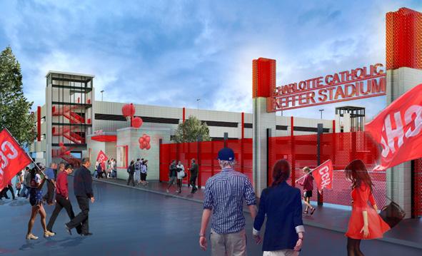 Charlotte Catholic High School’s (CCHS) remarkable transformation is a testament to bold vision and strategic design. Faced with the limitations of their original six-acre Park Road campus, CCHS took an innovative step—purchasing an 11-acre site anchored by a three-story, 120,000-square-foot office building. To bring this unconventional campus to life, they partnered with Little to reimagine the site into a vibrant new home for the school. The original office building was adapted to house departments best suited to lower ceiling heights, while a 37,000-square-foot addition introduced a new gymnasium and arts wing. Creative site strategies—including repurposing 300 surplus parking spaces into a stadium and transforming a loading dock into the main entrance—enabled the new campus to function effectively while enhancing both visibility and campus identity.