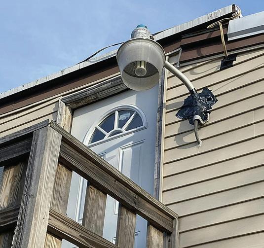 One other problem I spotted here is the NM cable poking out of the building just above the luminaire. This cable is then laid across the roof. NM cable cannot be installed in this outdoor location. NM cable is neither sunlight-resistant, as required by Sec. 300.6(C)(1), nor is it permitted in damp or wet locations, as specified in Sec. 334.12(B)(4). Lastly, the apparent lack of any supporting and securing of the NM cable is a violation of Sec. 334.30.