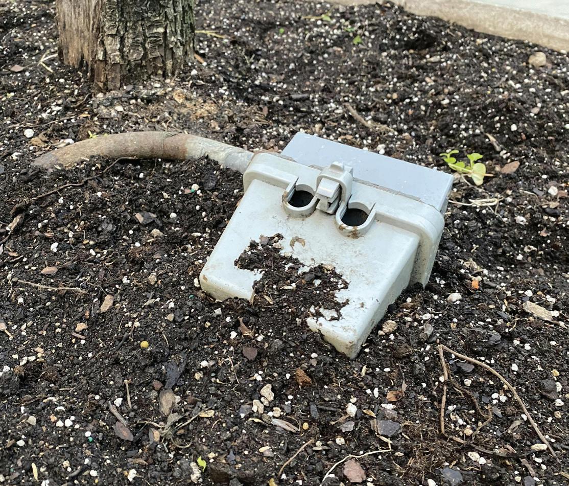 The upside-down cover is not installed or used correctly. This violates the requirements of Sec. 110.3(B). I would say it is questionable at best as to whether the wiring and devices installed in this box are accessible without excavating the earth as required by Sec. 314.29(B). As for the box support, is the earth the only support for this box? Or is there some post, brace, or conduit underground providing the supports required by Sec. 314.23? That remains a mystery, since I did not take it upon myself to dig in this public area to investigate further — although my curiosity almost pushed me to do so.