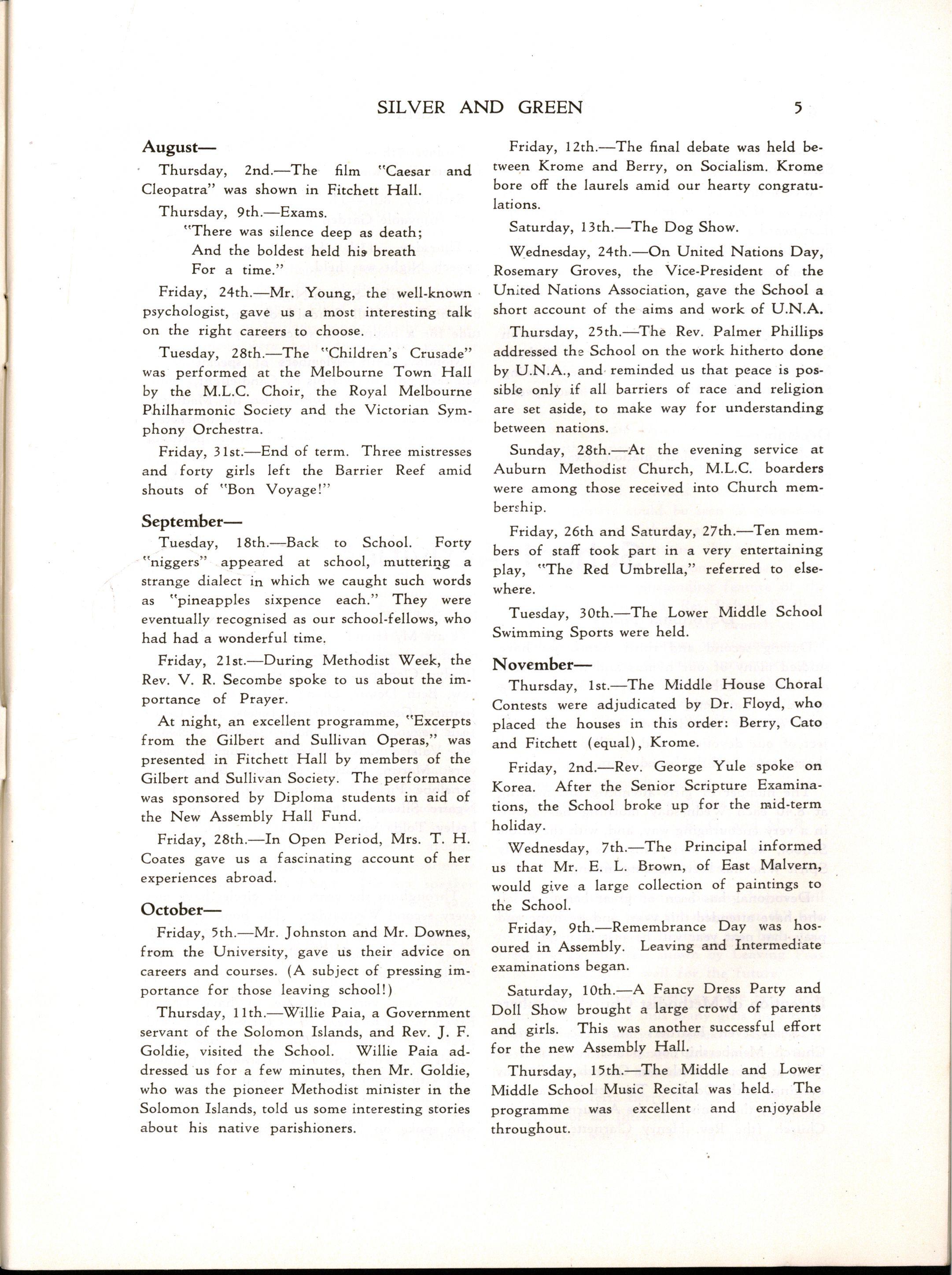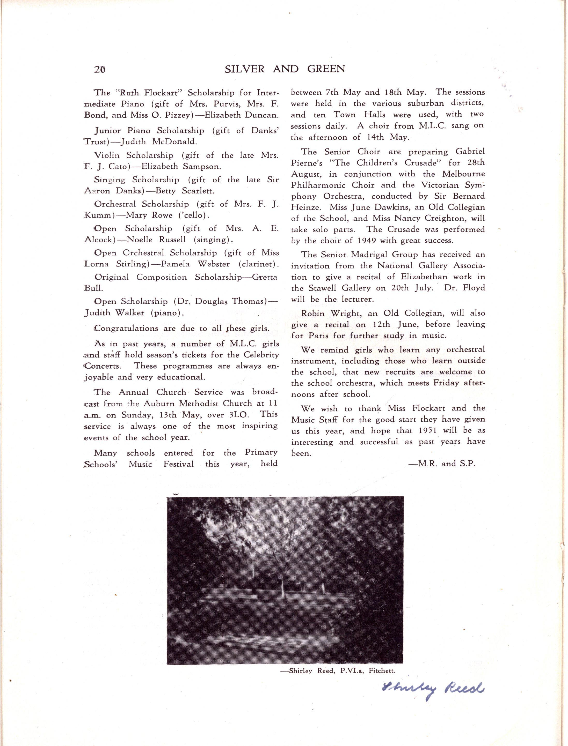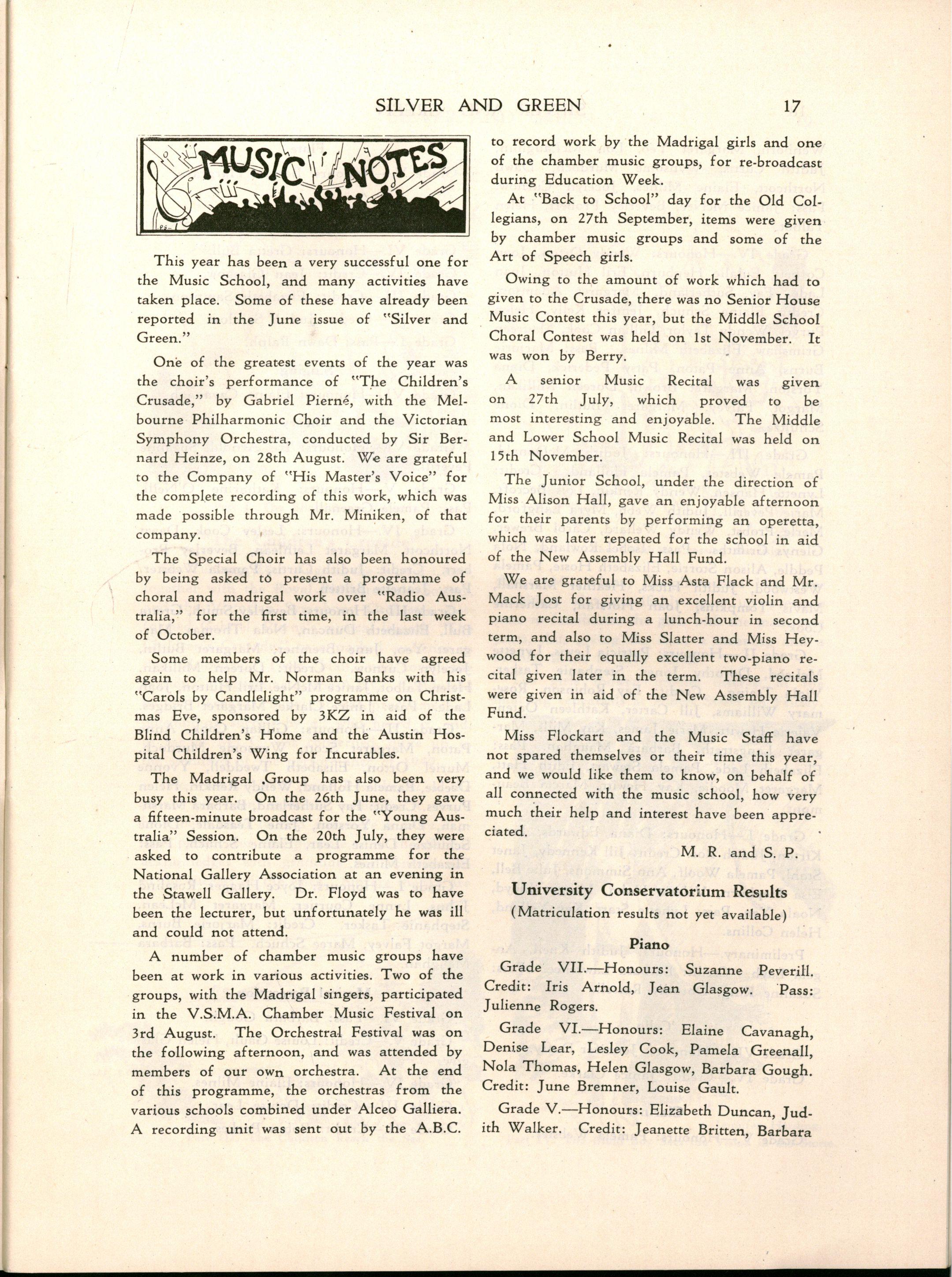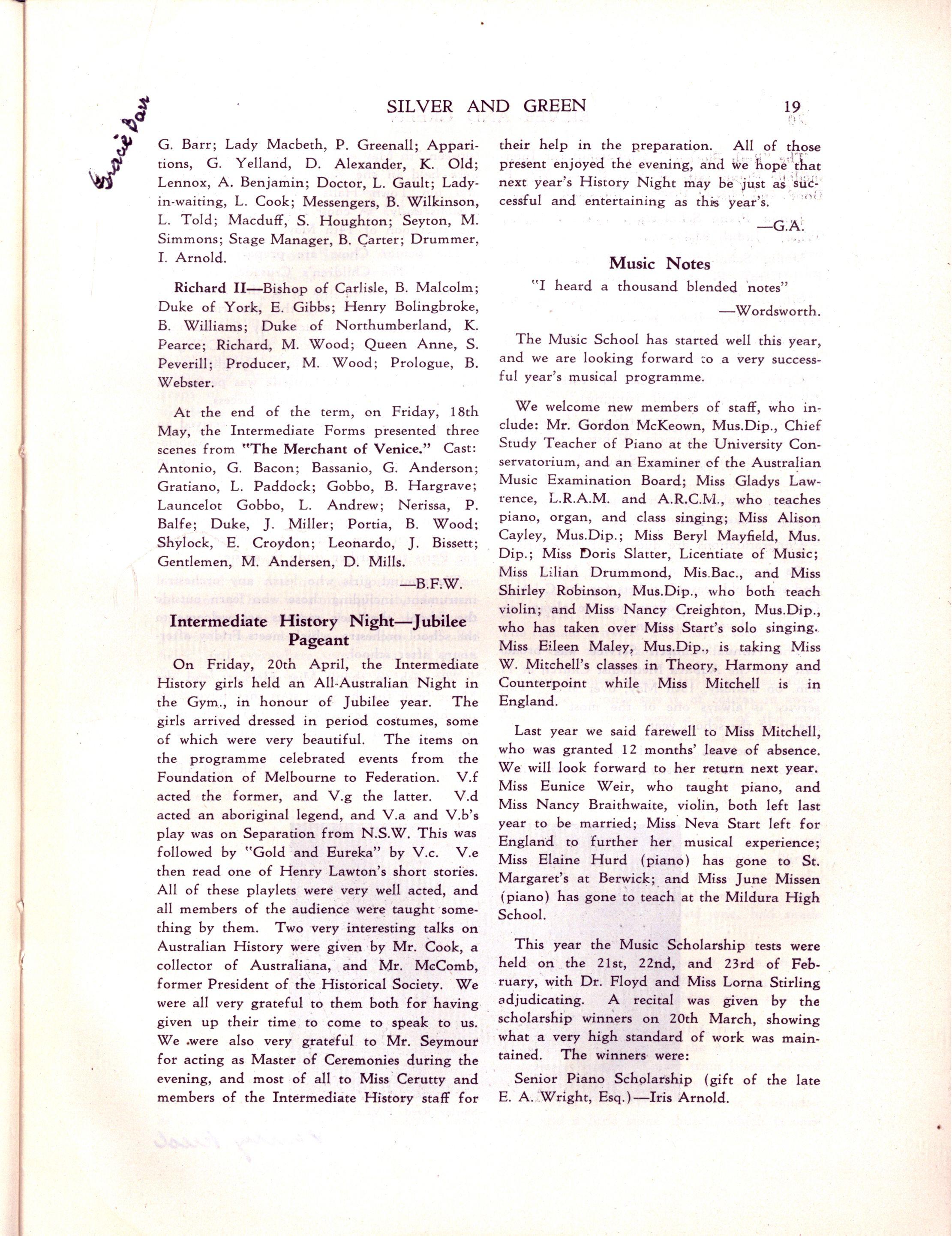 Miss W Mitchell, Mus.Bac., for 26 years teacher of Theory and Piano, is visiting England this year and will, we trust, return to the Music Staff in 1952