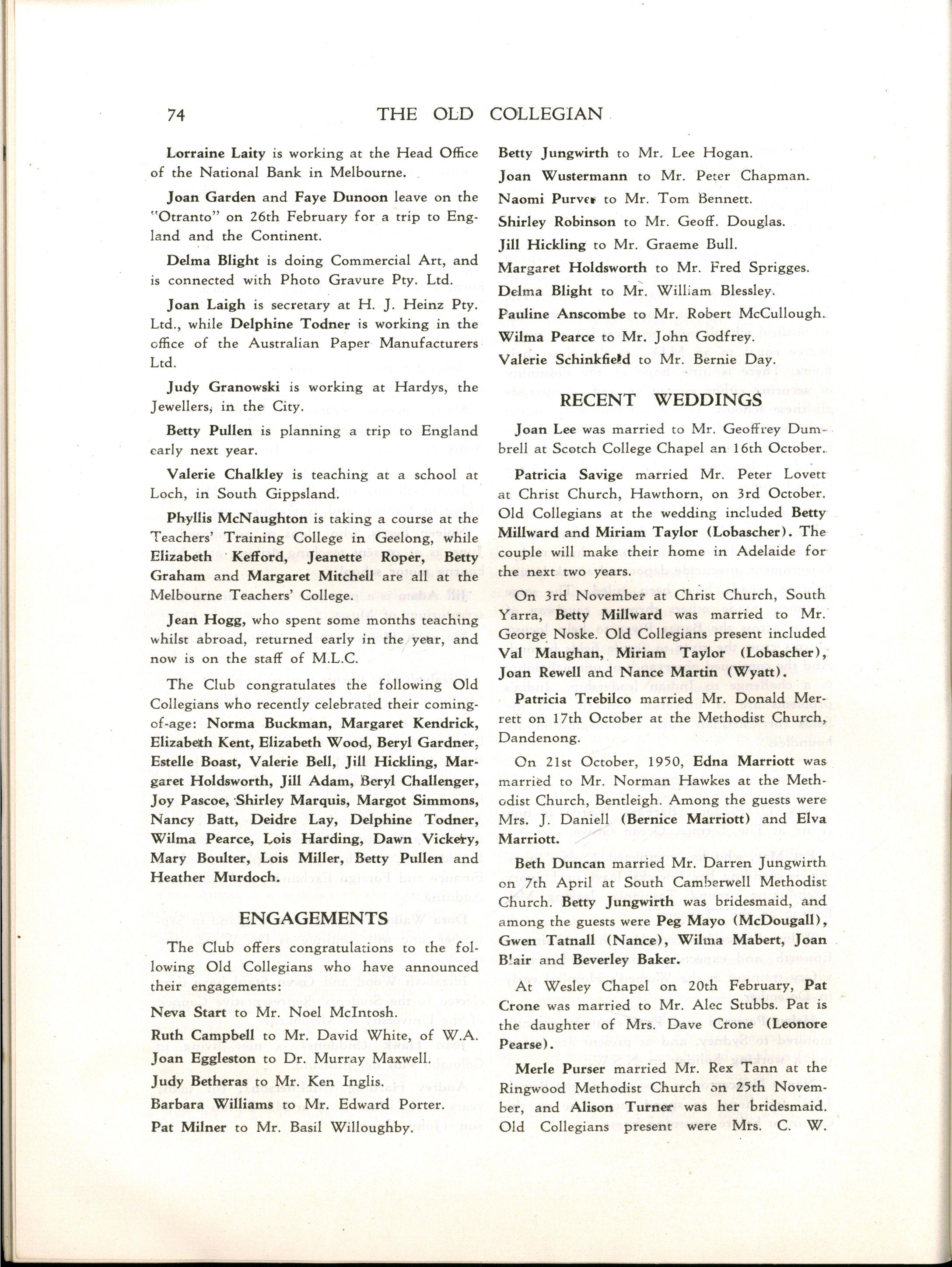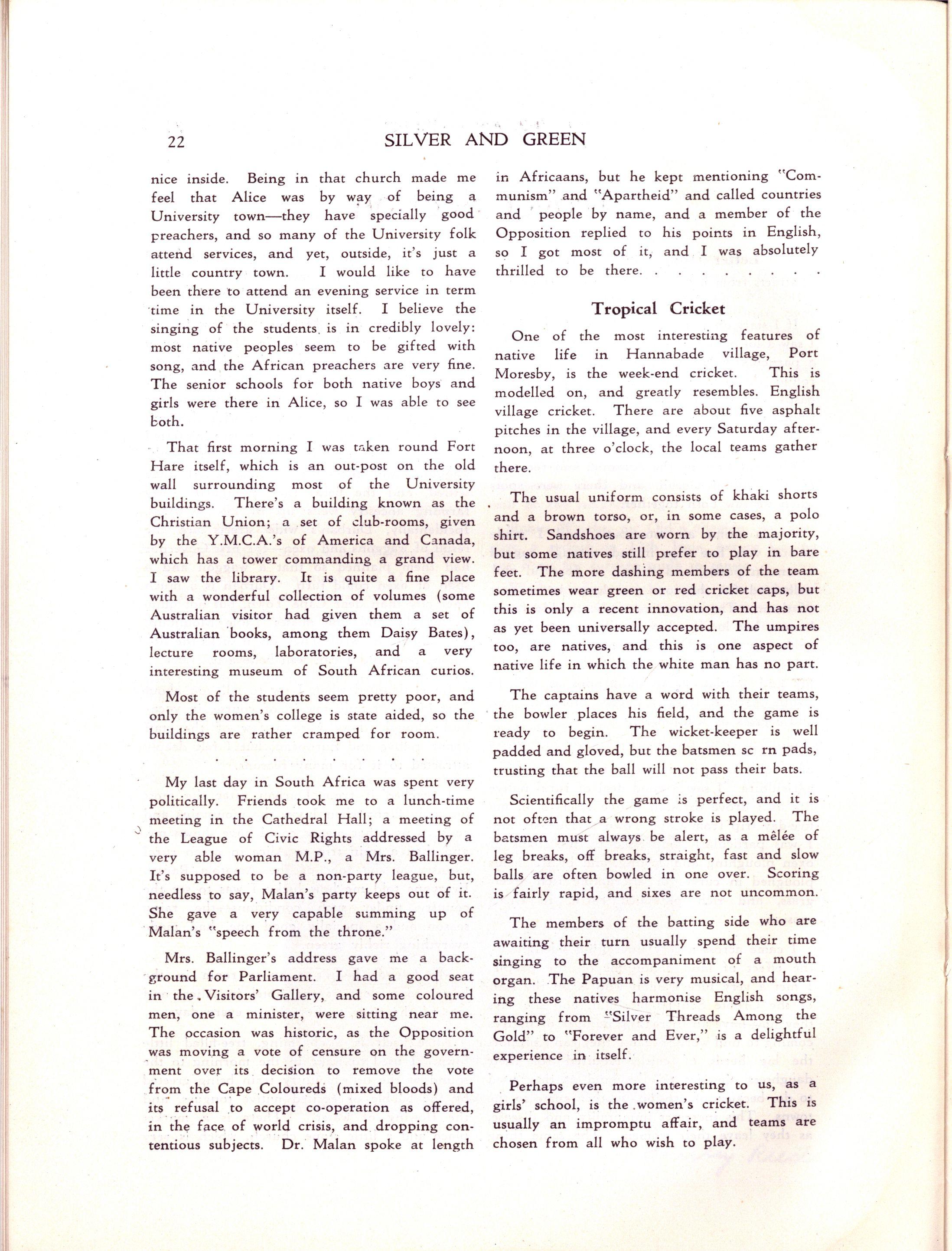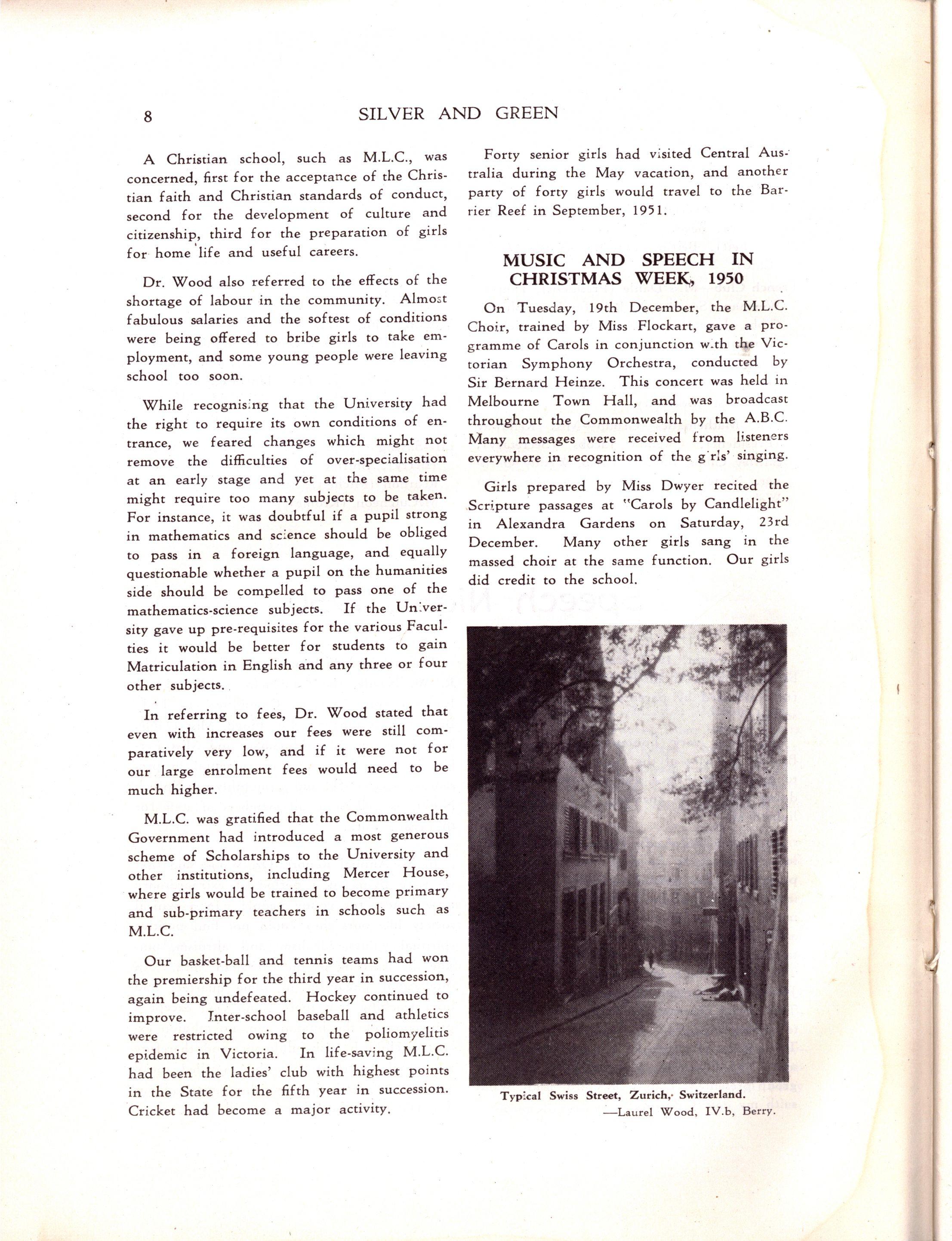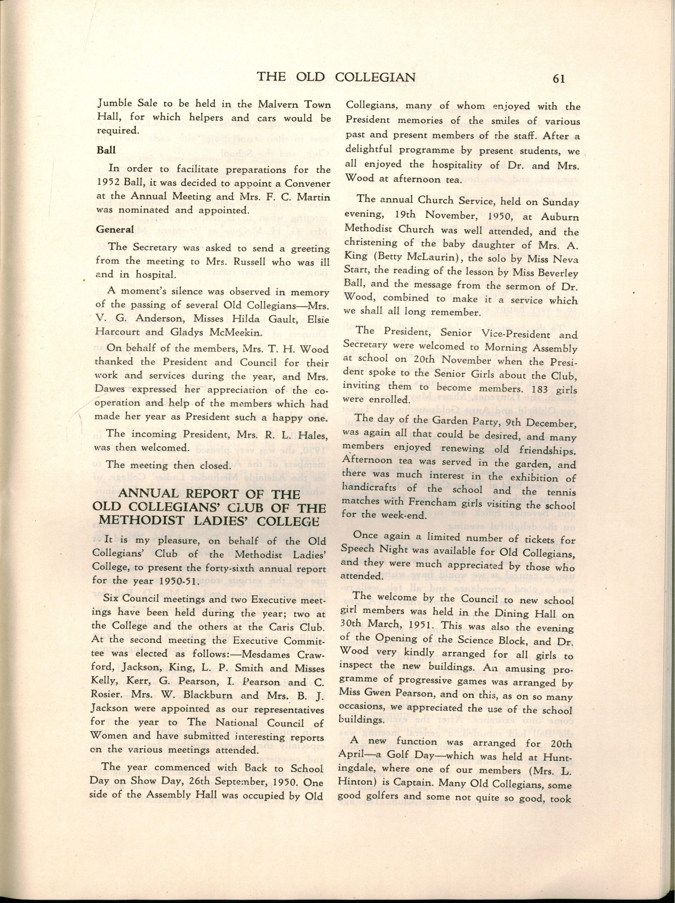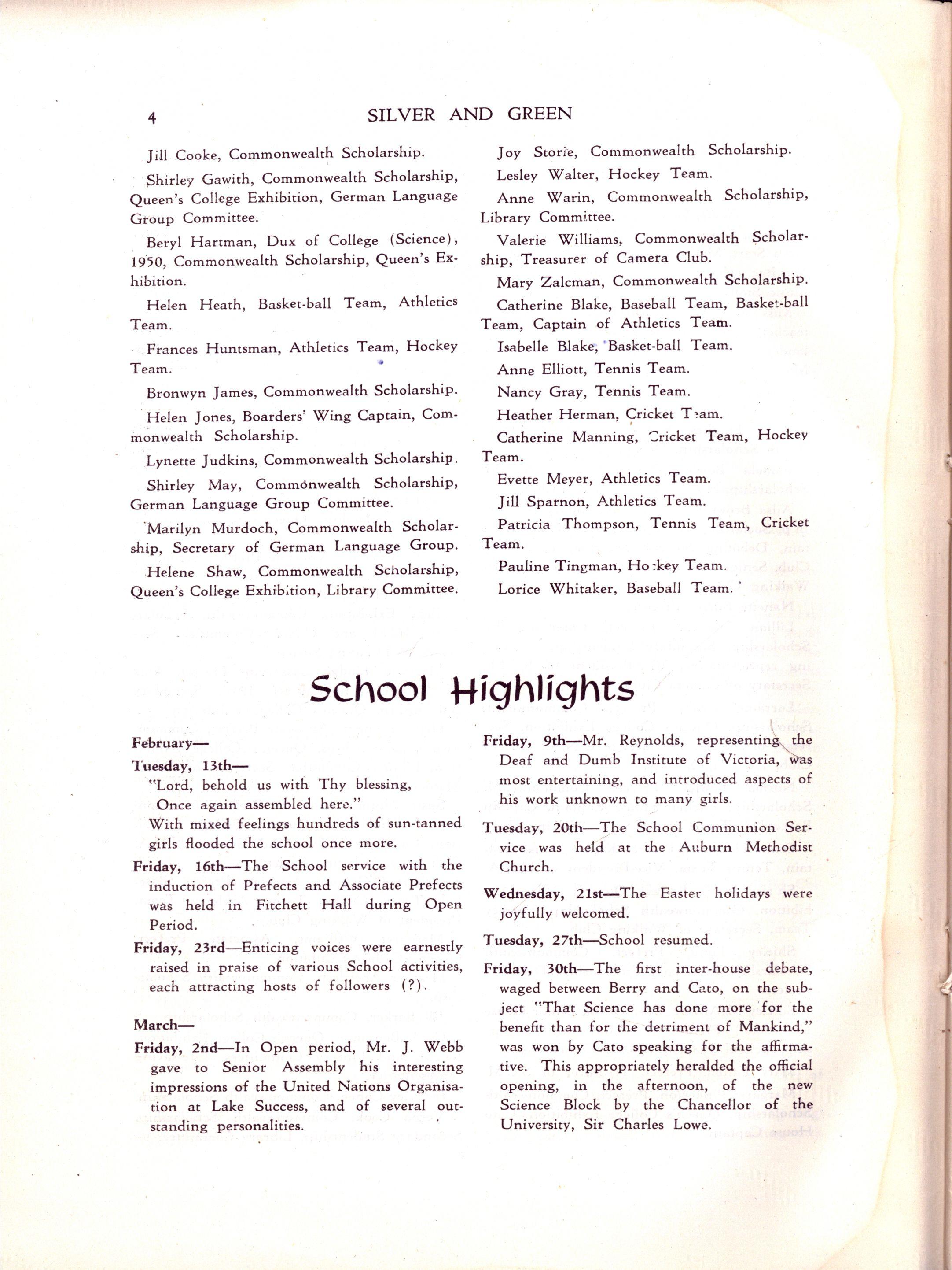 Miss W Mitchell, Mus.Bac., for 26 years teacher of Theory and Piano, is visiting England this year and will, we trust, return to the Music Staff in 1952
