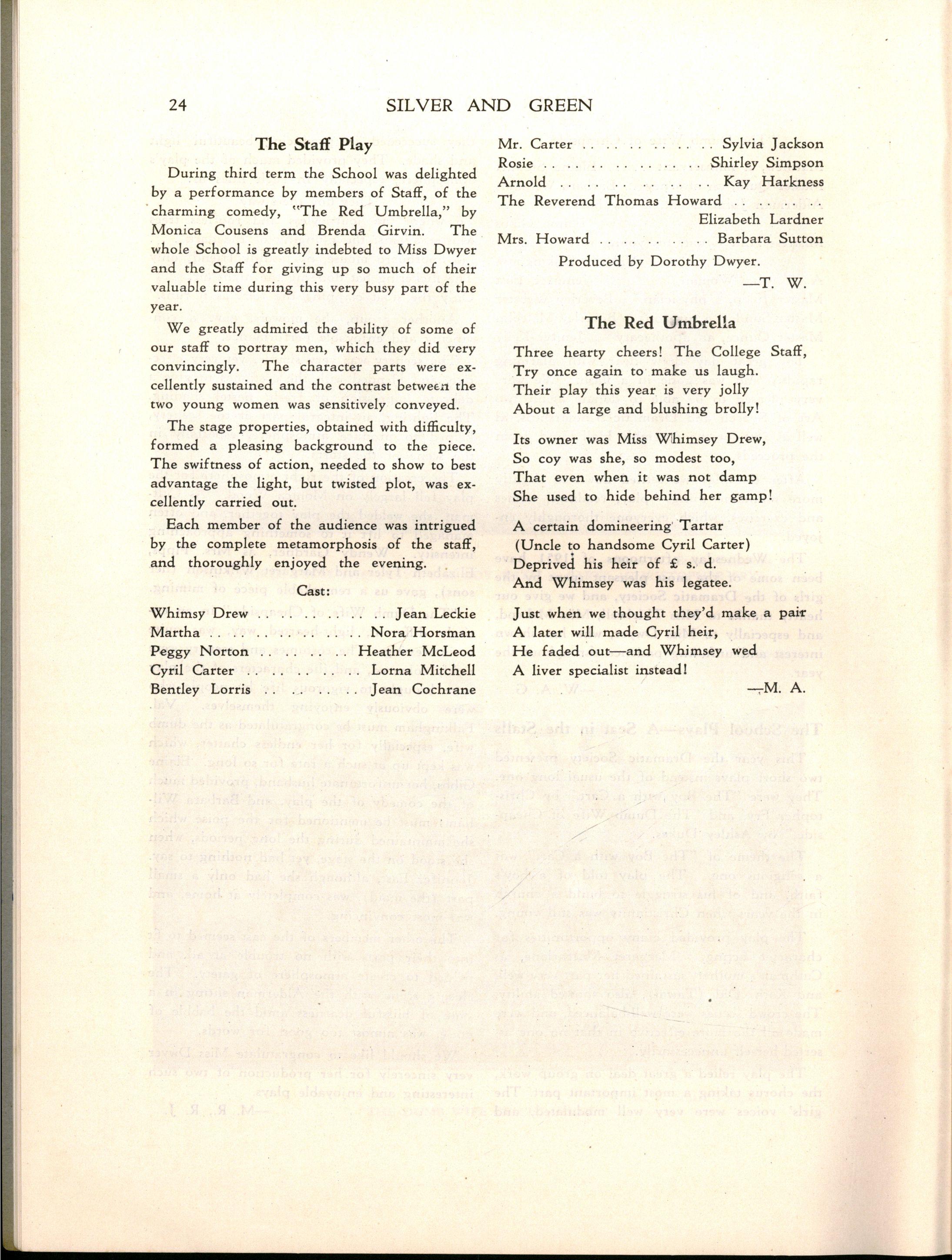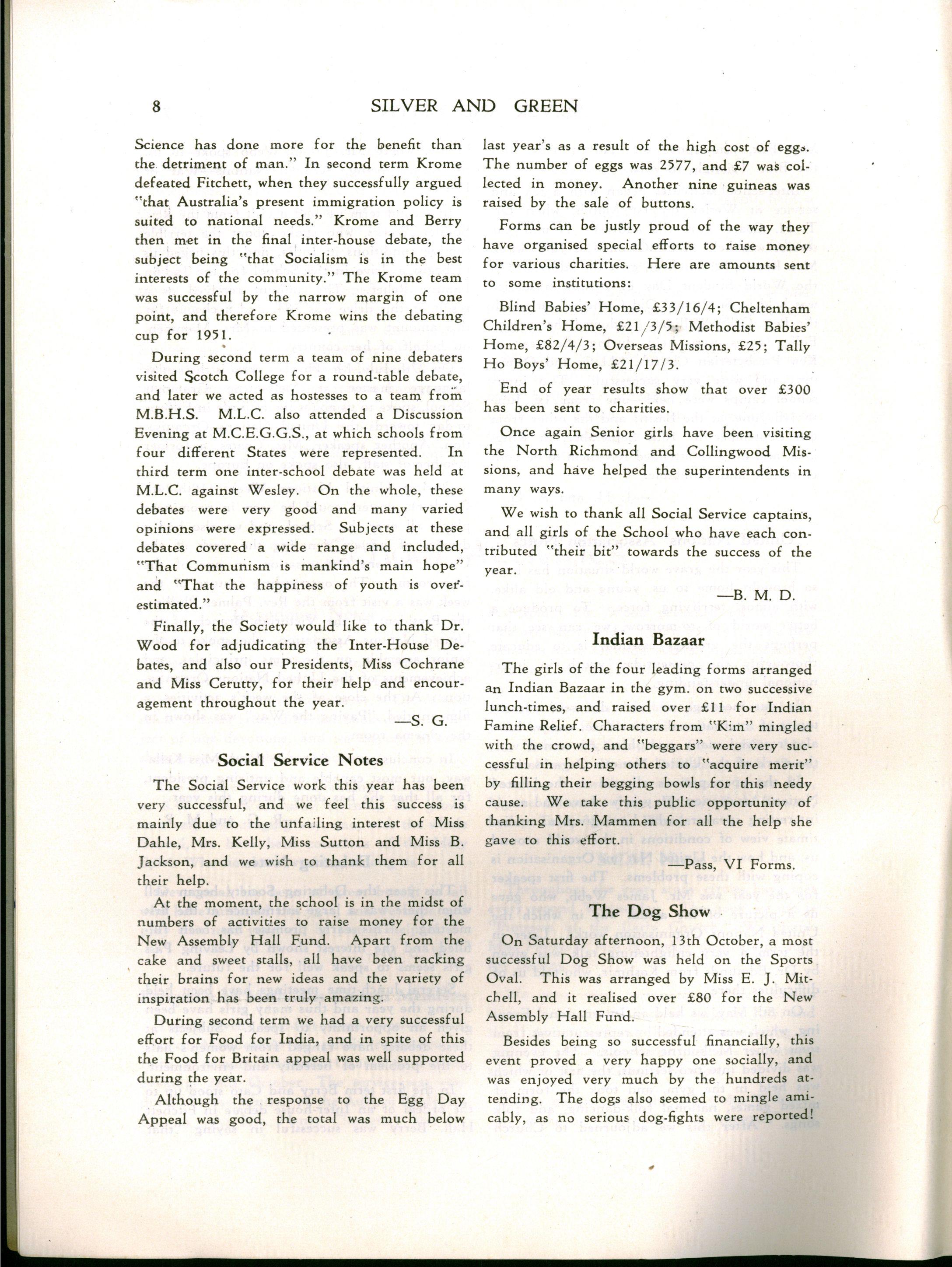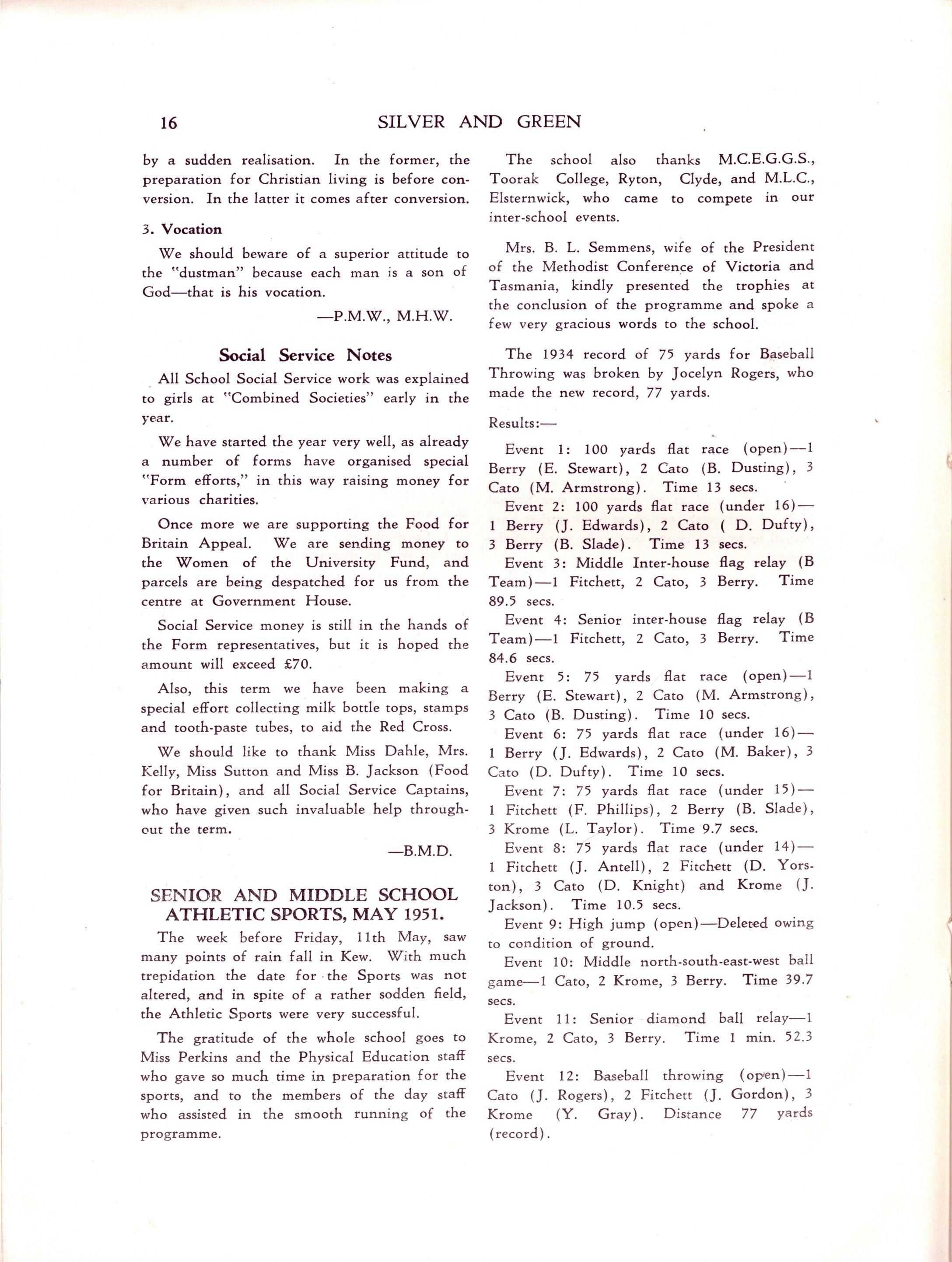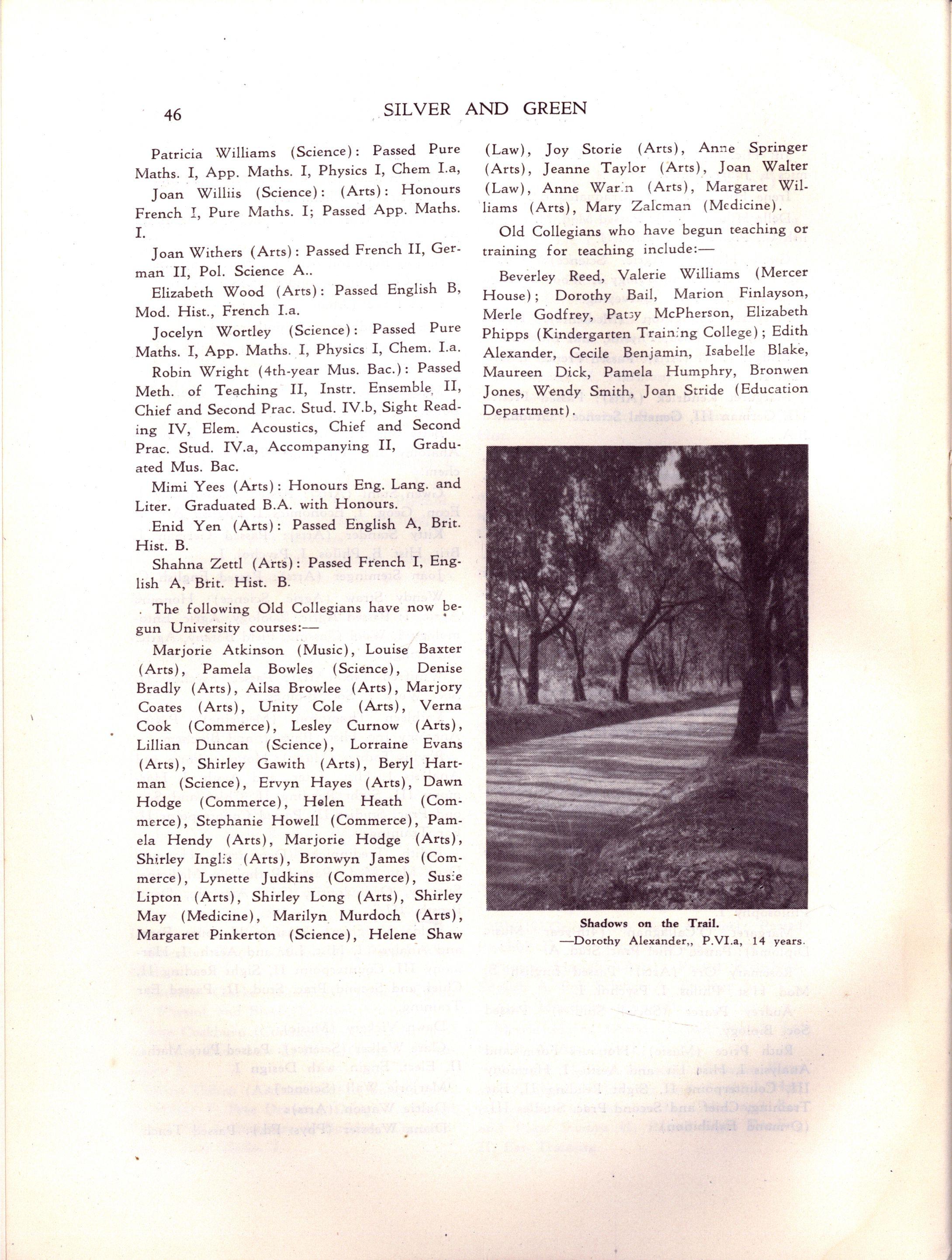 Miss W Mitchell, Mus.Bac., for 26 years teacher of Theory and Piano, is visiting England this year and will, we trust, return to the Music Staff in 1952