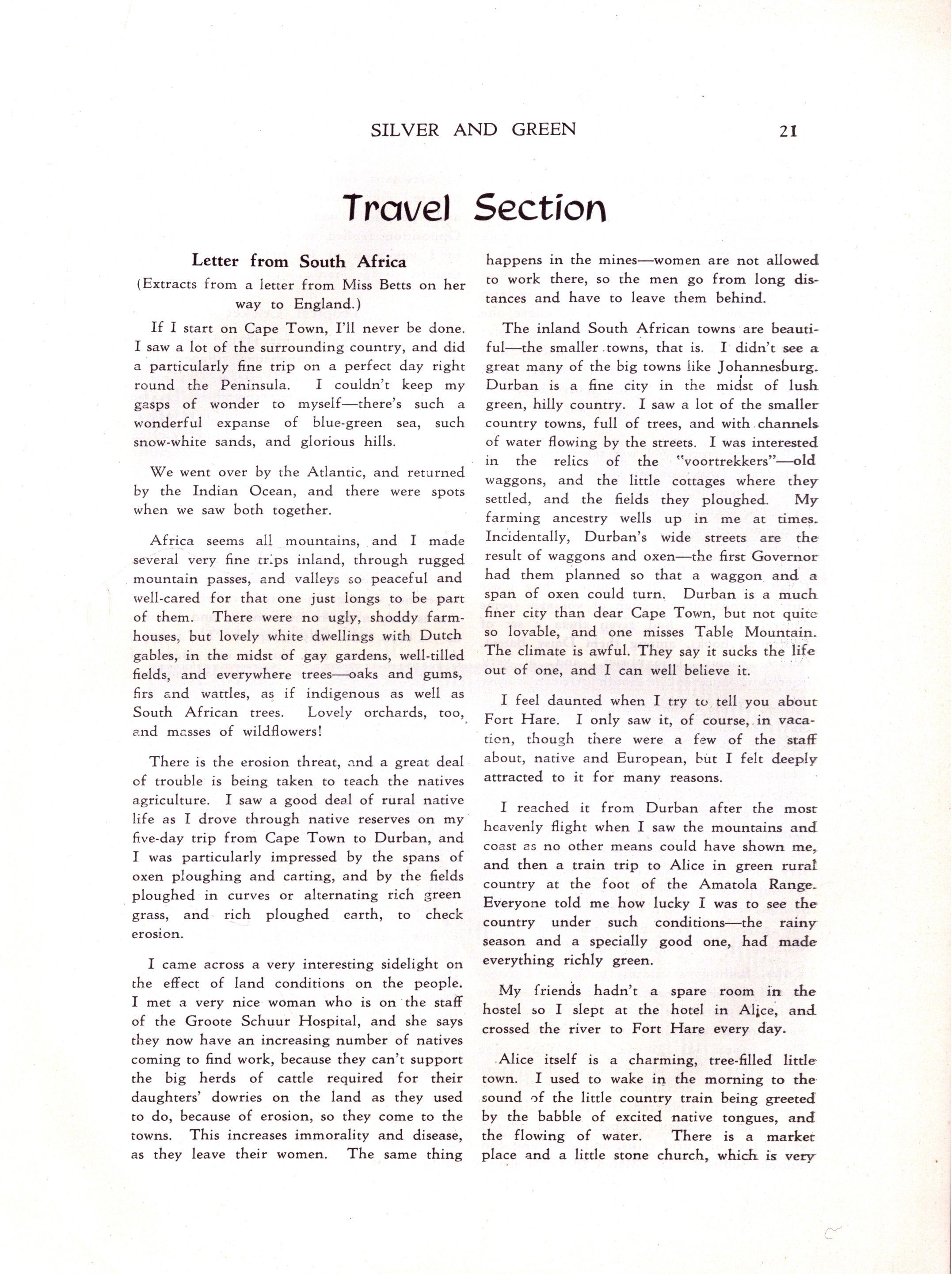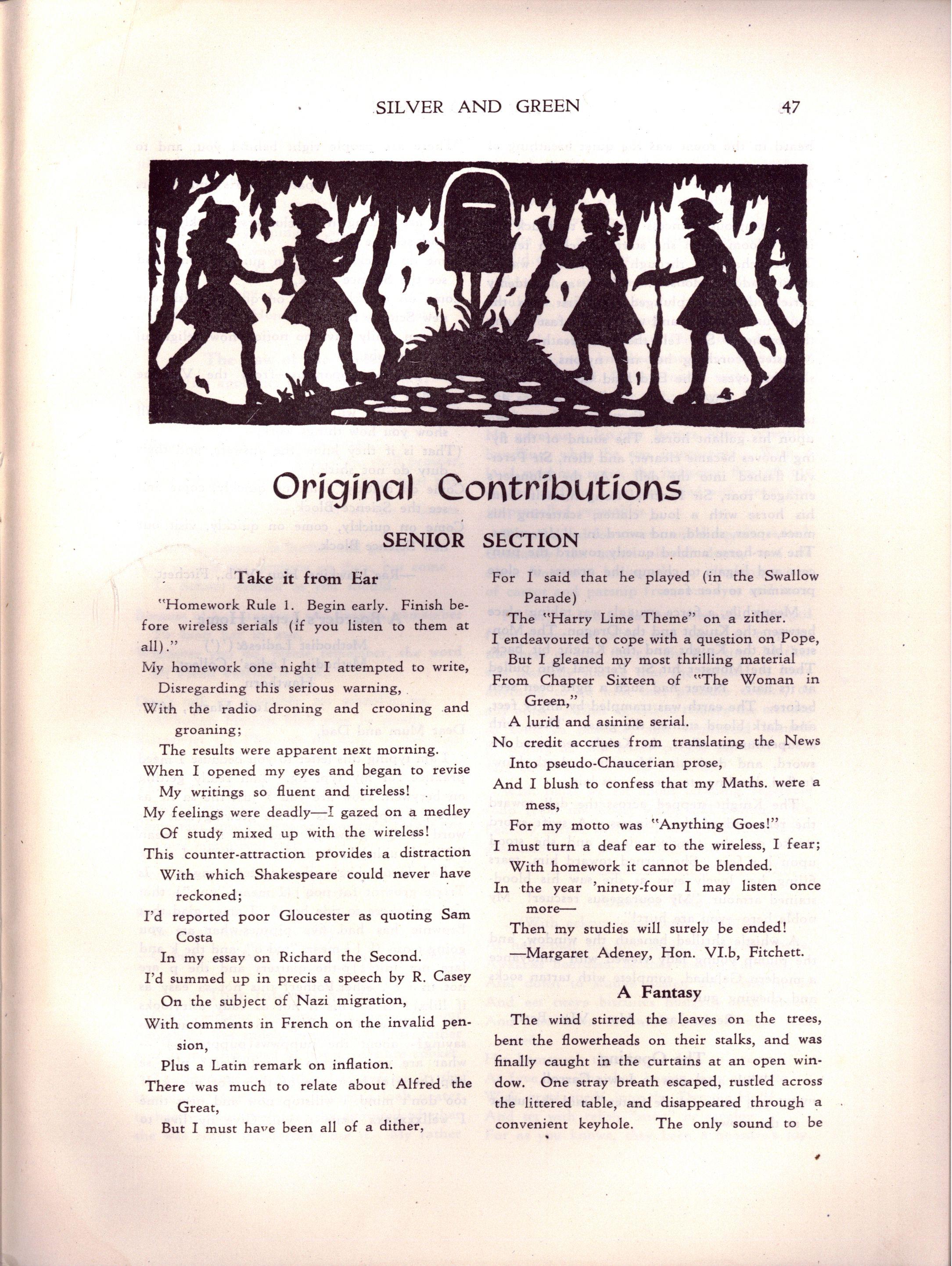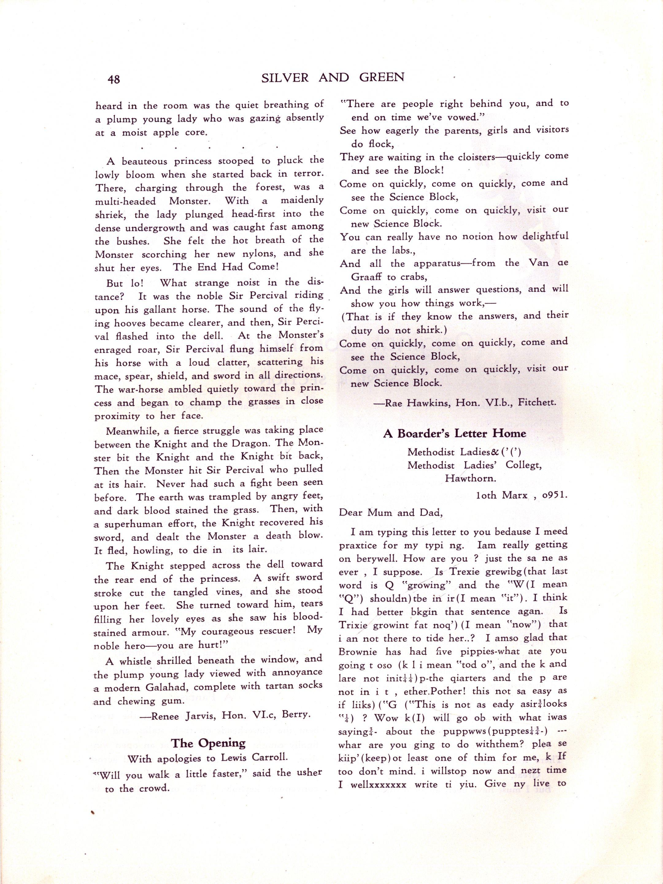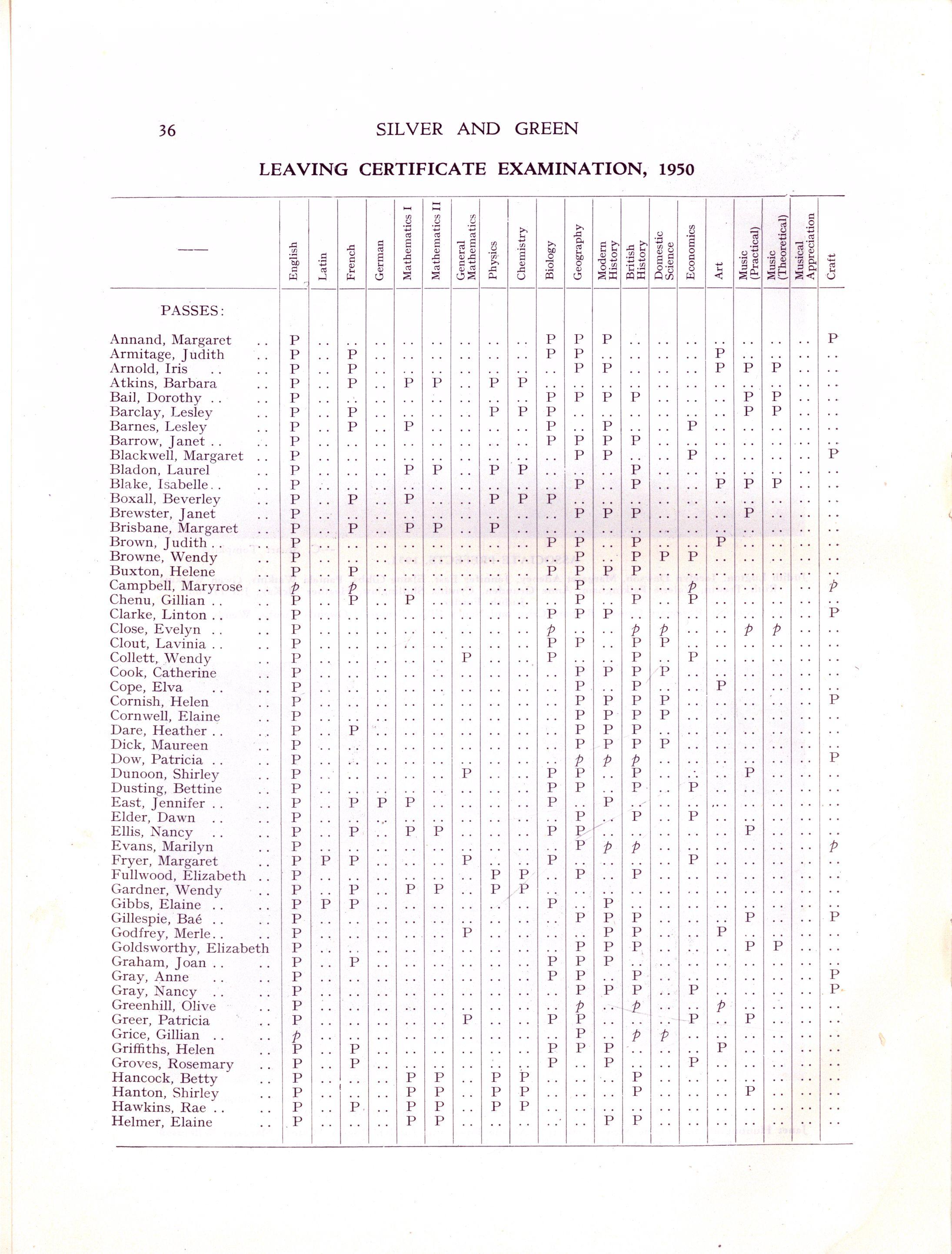 Miss W Mitchell, Mus.Bac., for 26 years teacher of Theory and Piano, is visiting England this year and will, we trust, return to the Music Staff in 1952