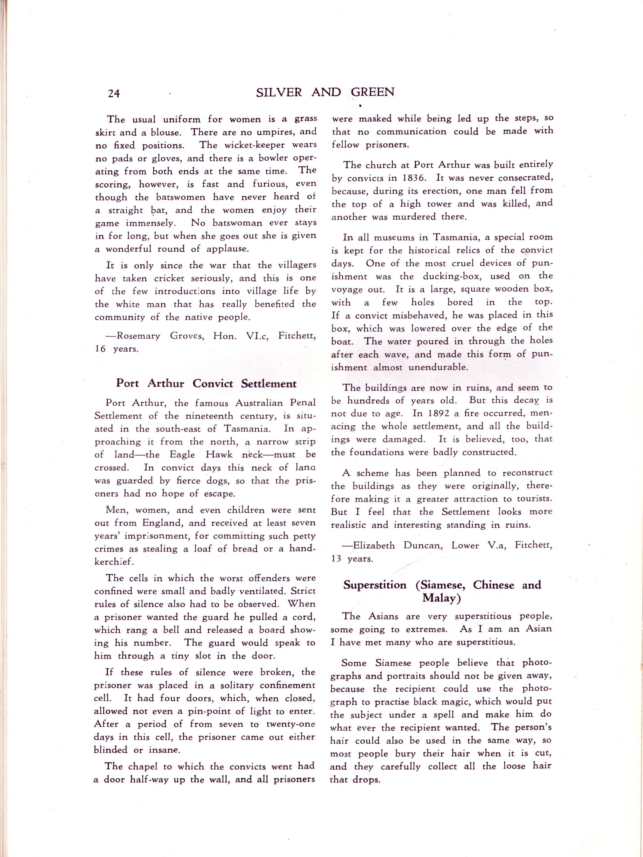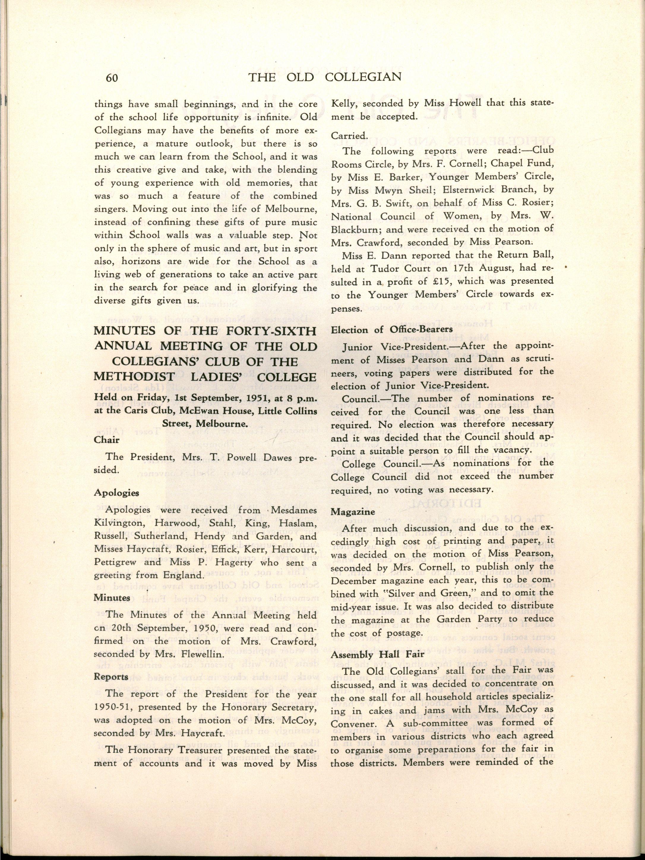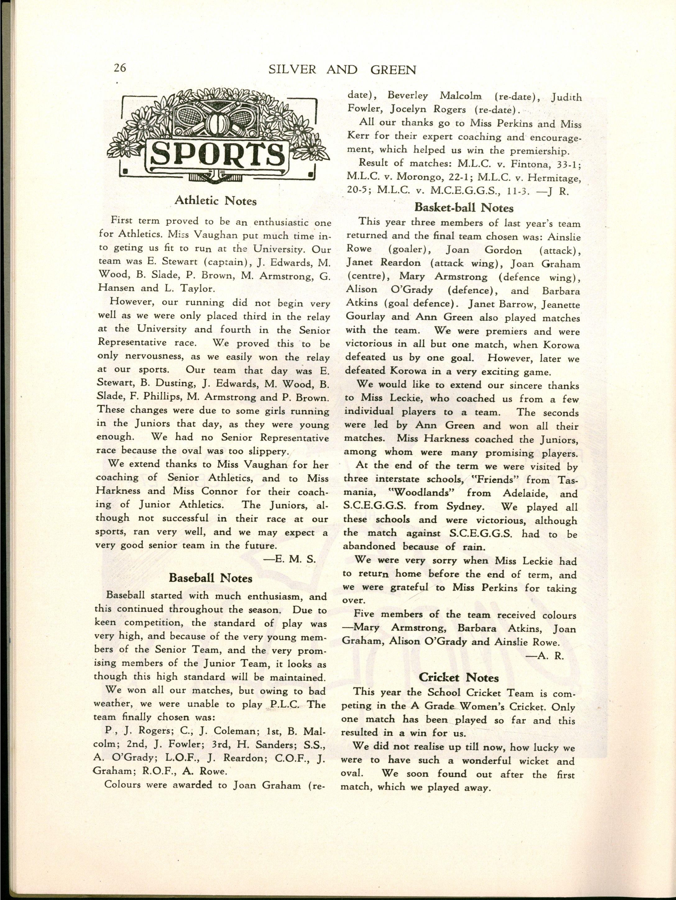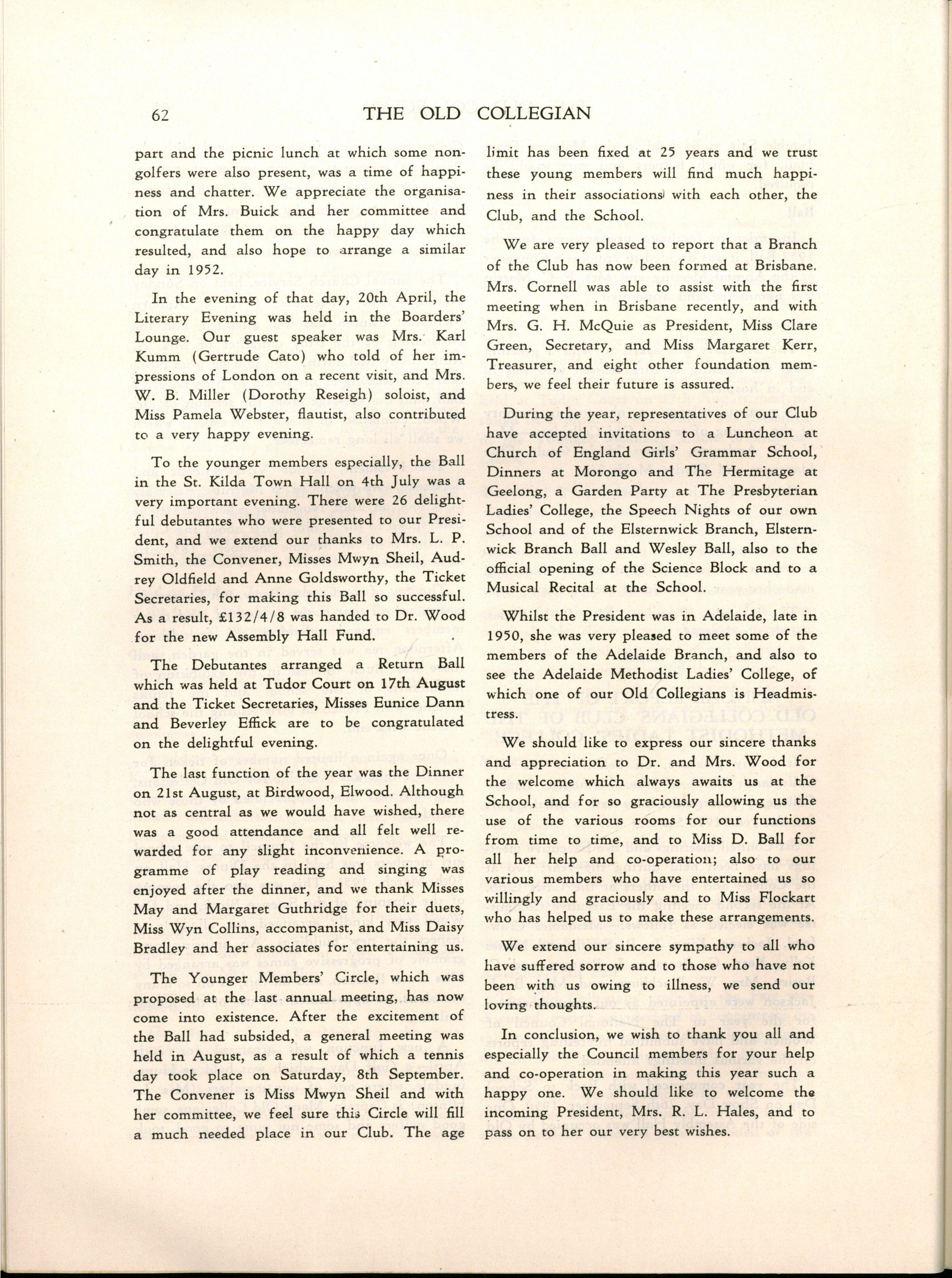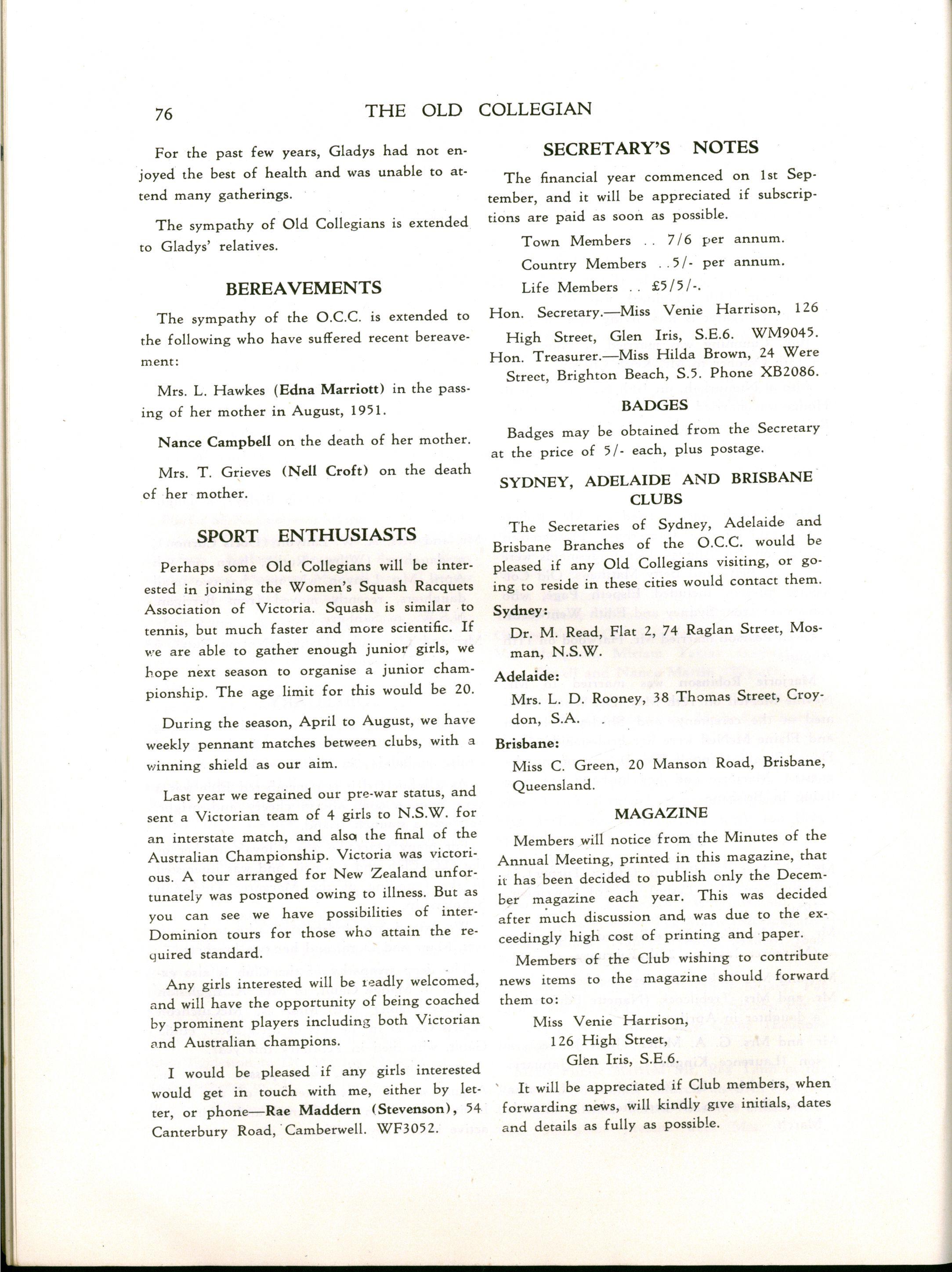 Perhaps some Old Collegians will be interested in joining the Women's Squash Racquets Association of Victoria Squash is similar to tennis, but much faster and more scientific If we are able to gather enough junior girls, we hope next season to organise a junior championship The age limit for this would be 20