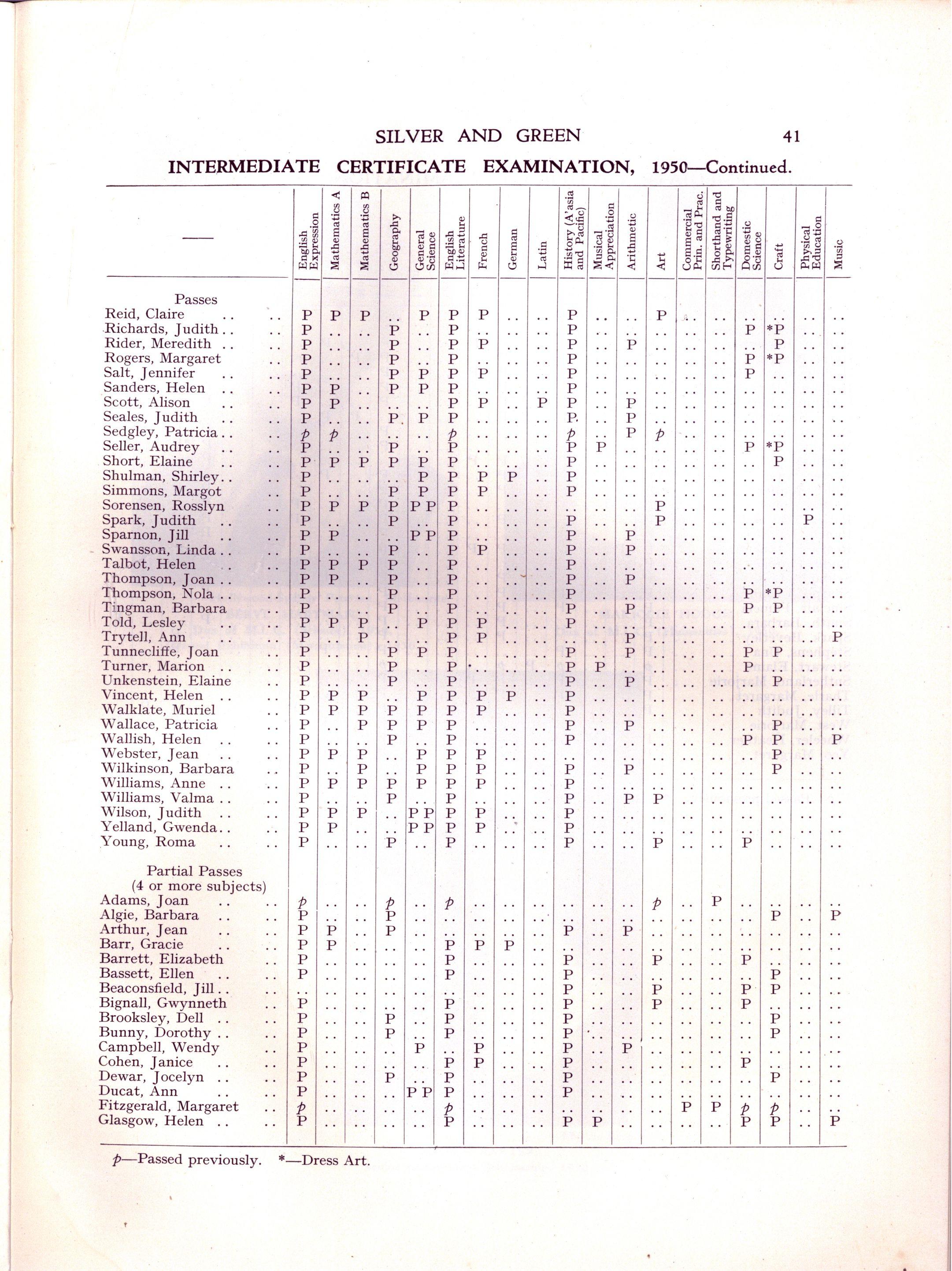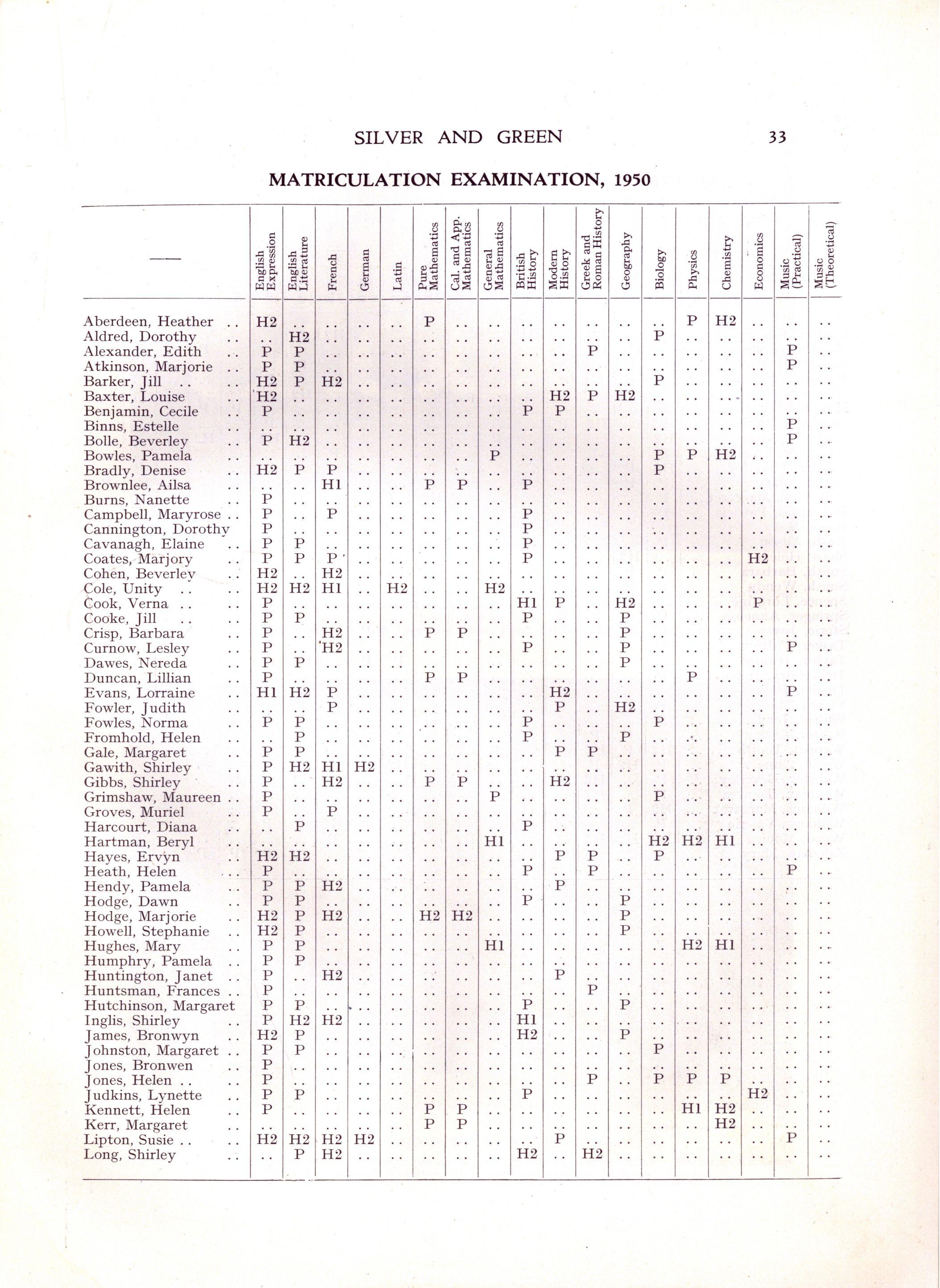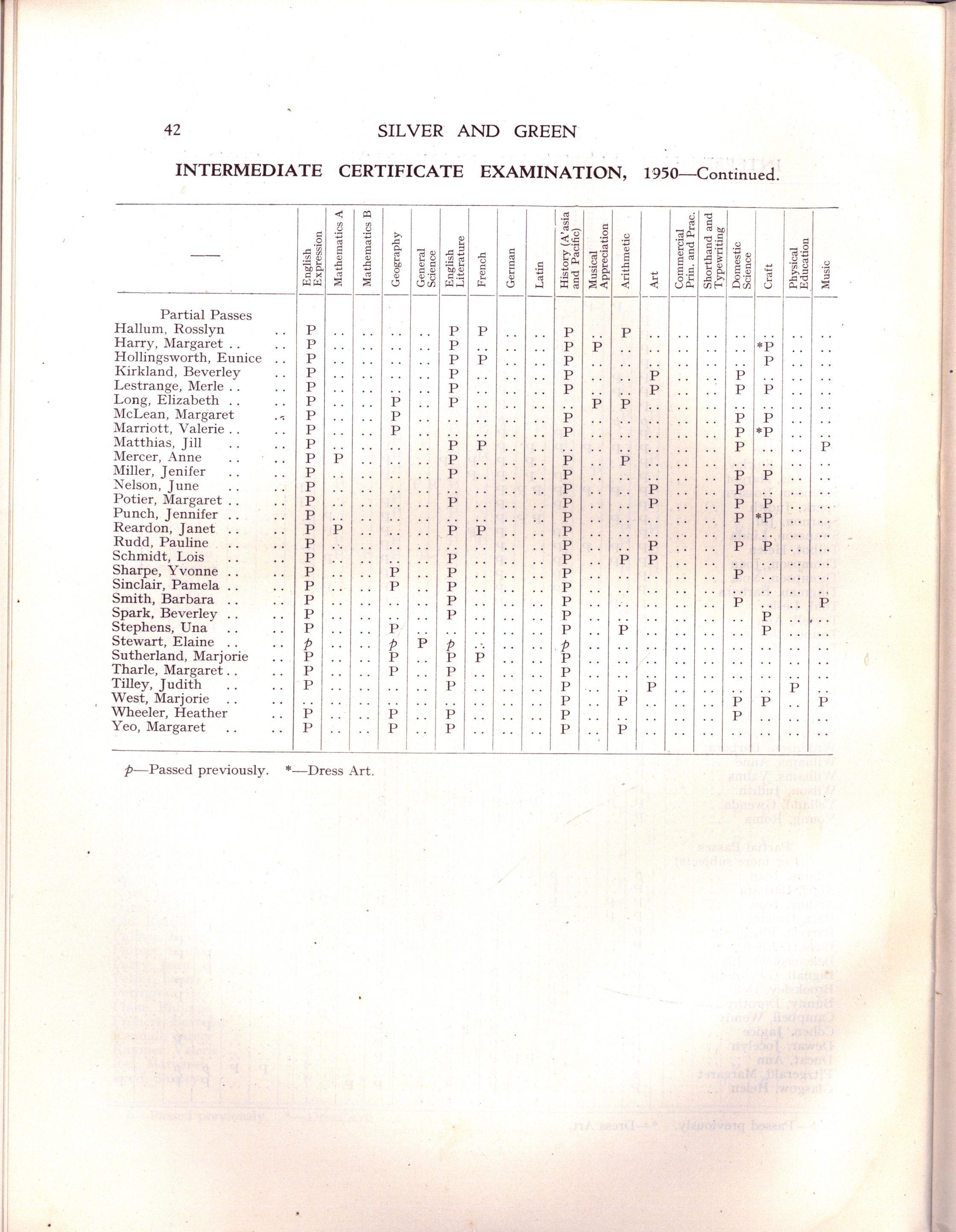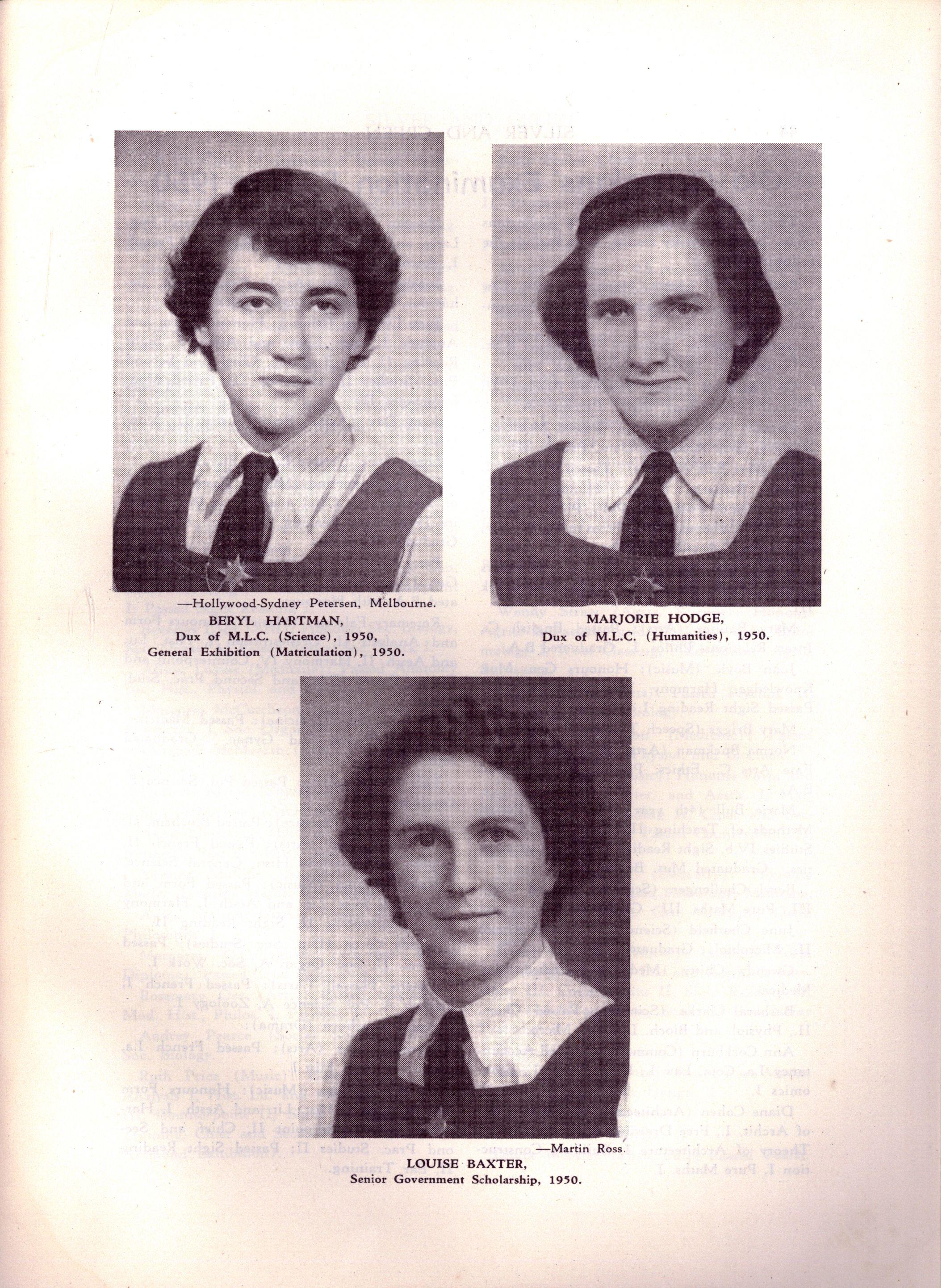 Beryl Hartman, Dux of College (Science), 1950, Commonwealth Scholarship, Queen's Exhibition.