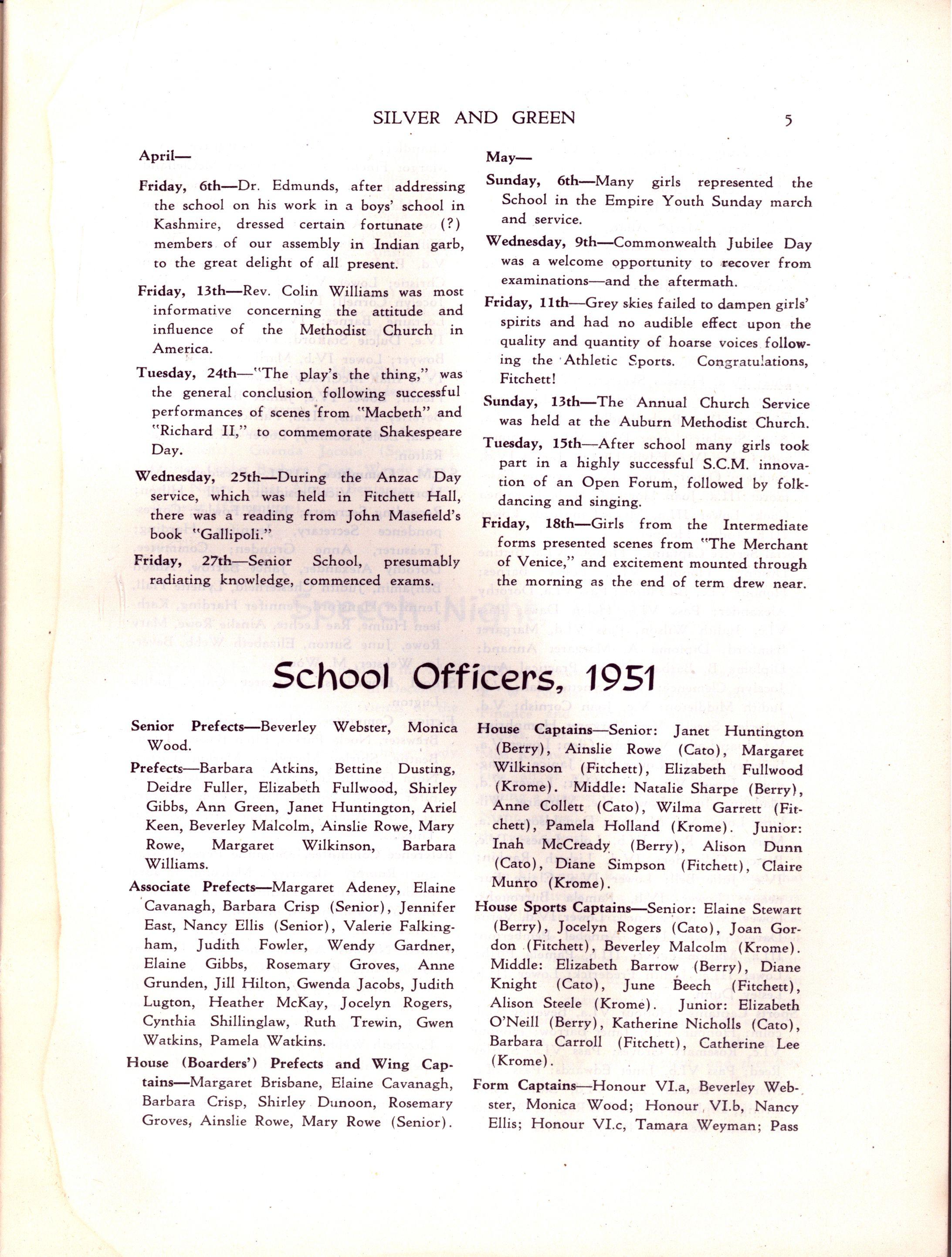 All new girls numbering over 350, have been welcomed this year Special reference is made to senior girls from M.L.C., Elsternwick, who transferred to Matriculation and Business Forms, including the following School Officers: An n Green and Deidre Fuller (Prefects), Margaret Adeney, Valerie Falkingham, Anne Grunden, Cynthia Shillinglaw and Ruth Trewin (Associate Prefects)
