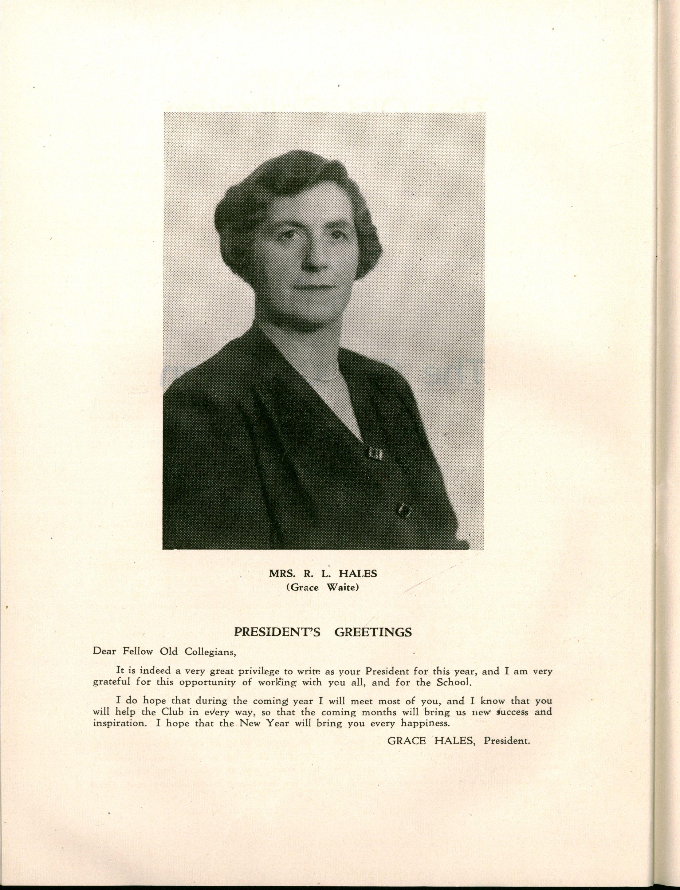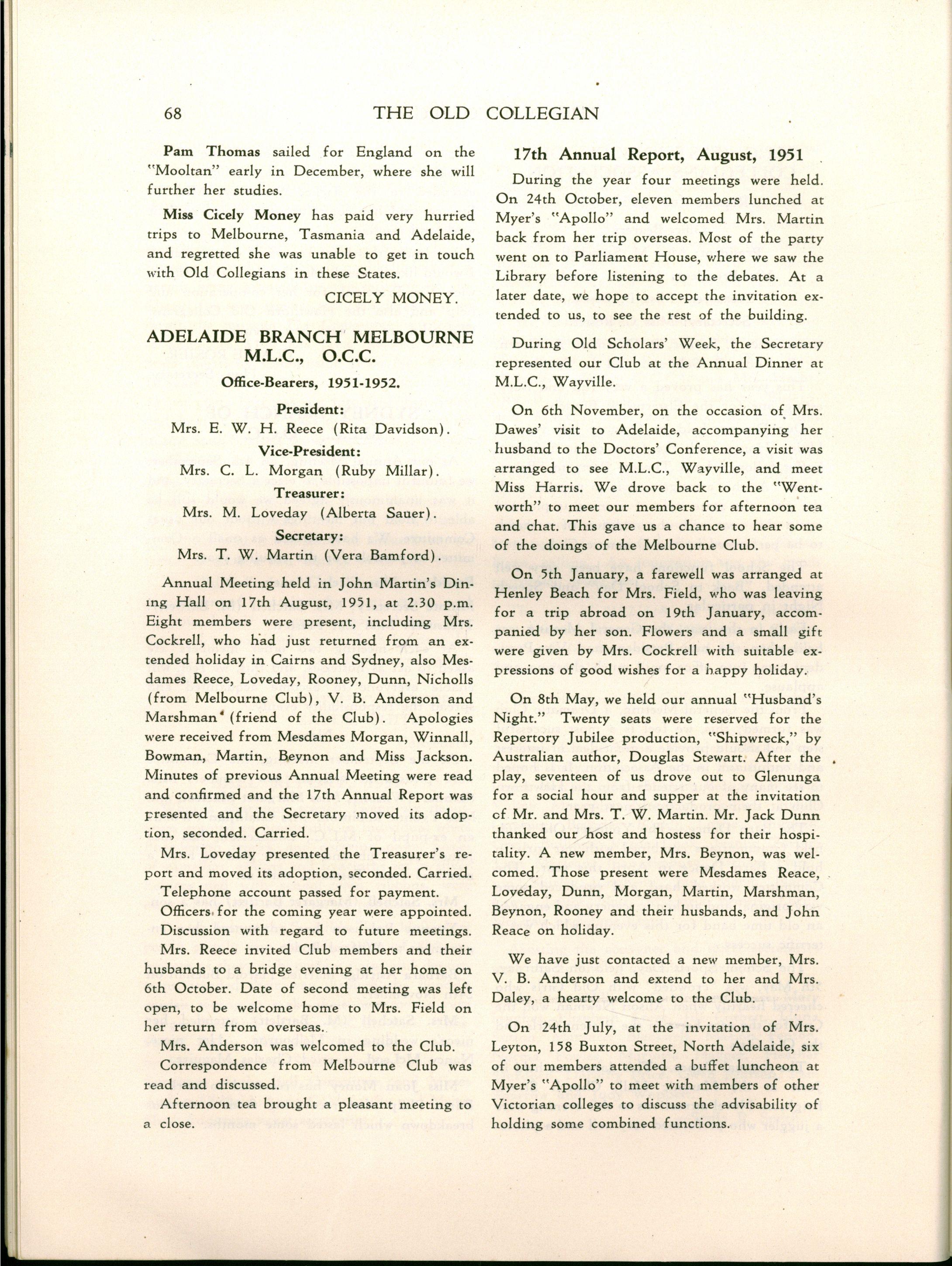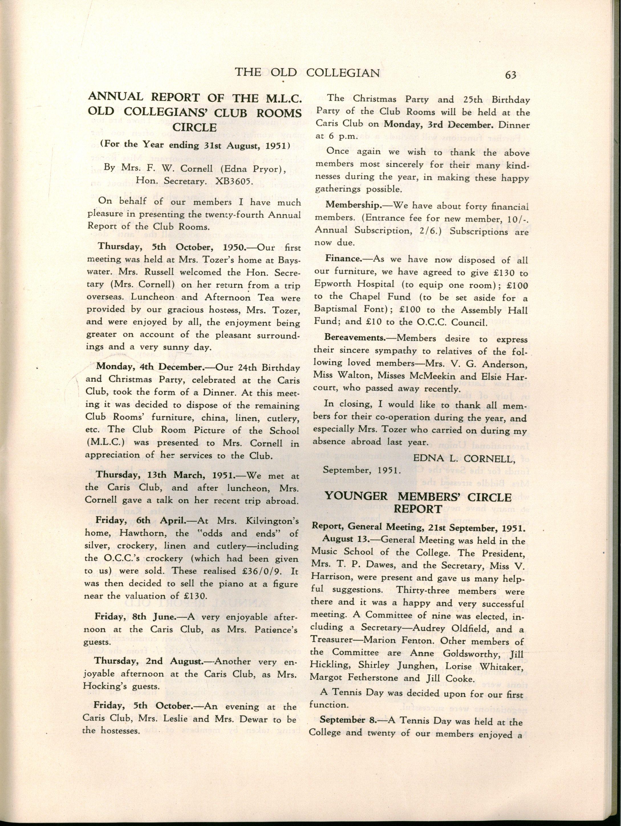 For many years she was a loyal member of the O.C. Club and Council, and was interested in the founding of the Margaret Tiddeman Scholarship